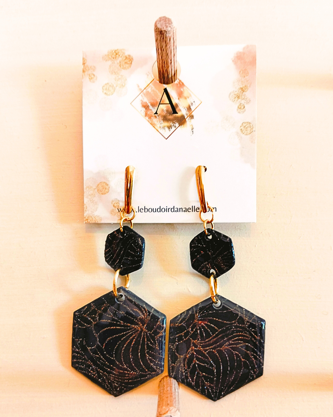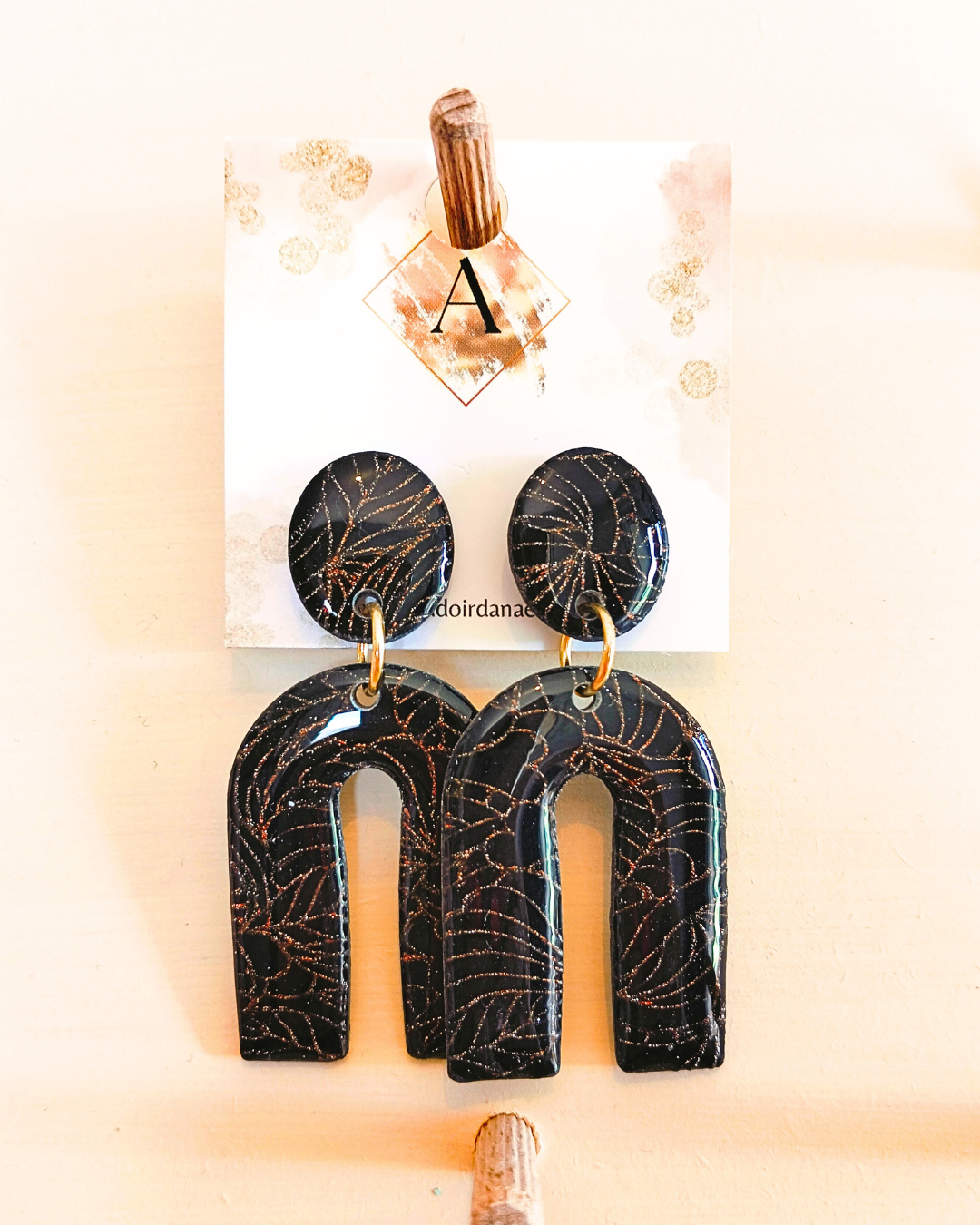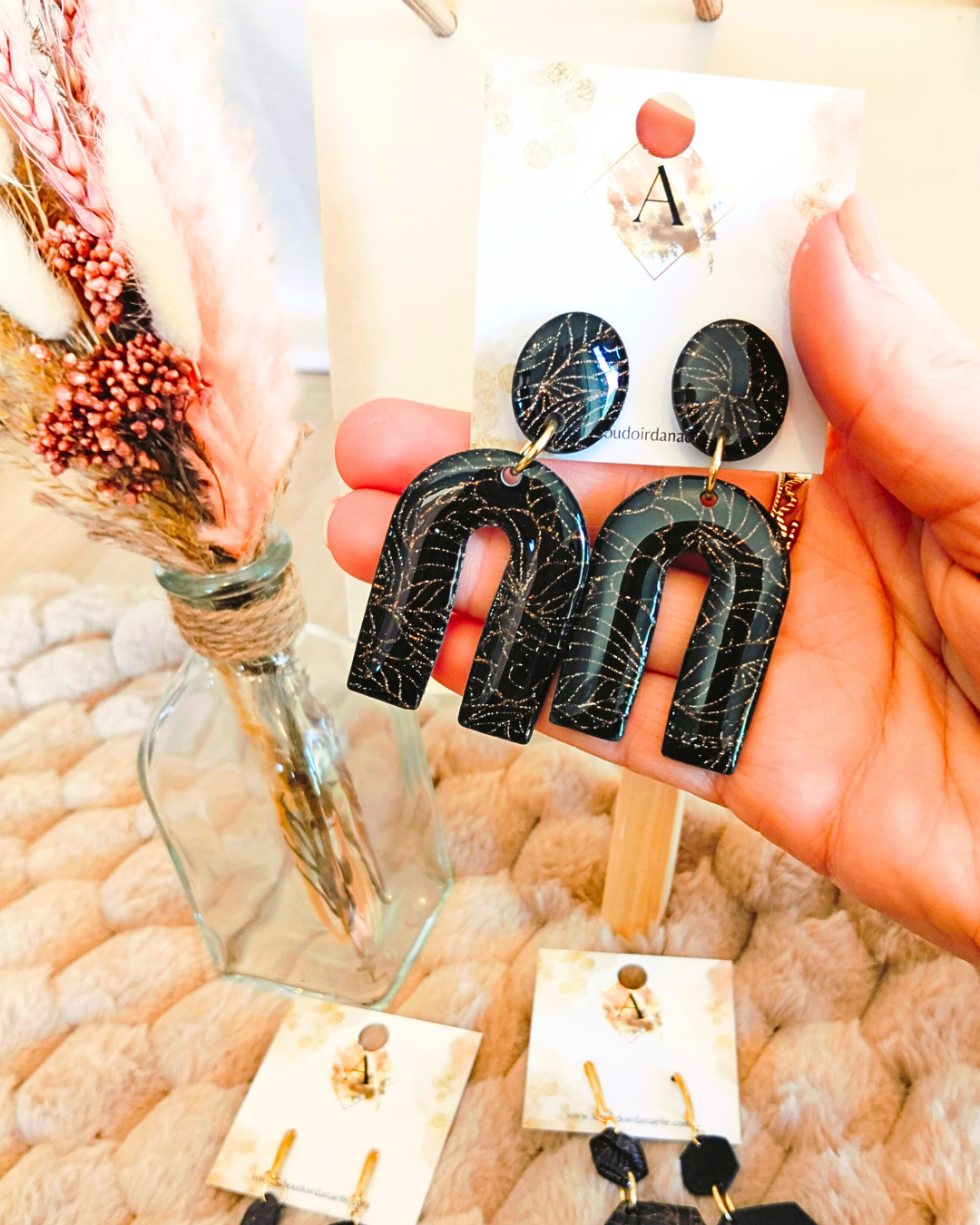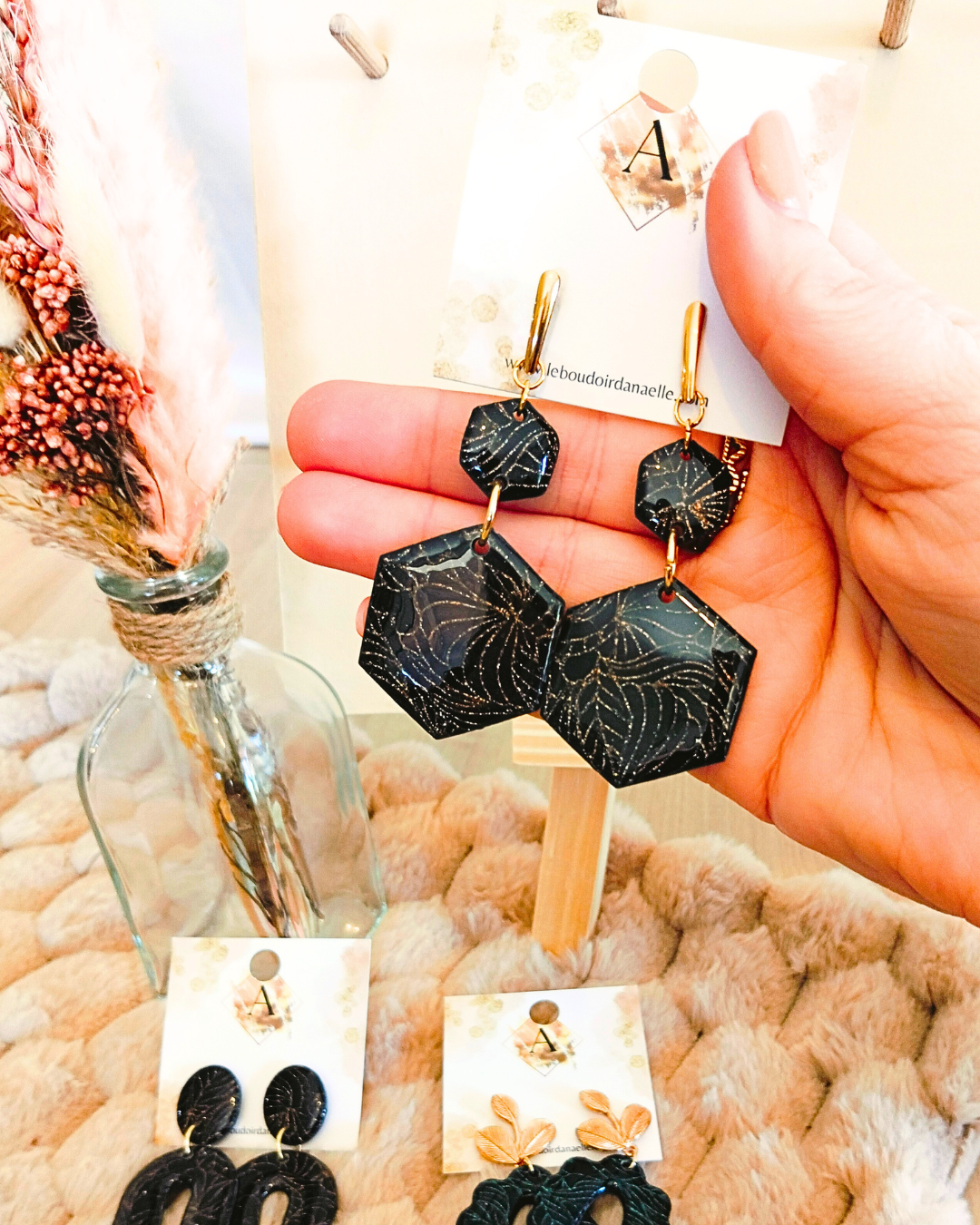 Boucles d’oreilles Ava : fond noir et motif fleuri pailleté (doré OU vert selon les modèles)