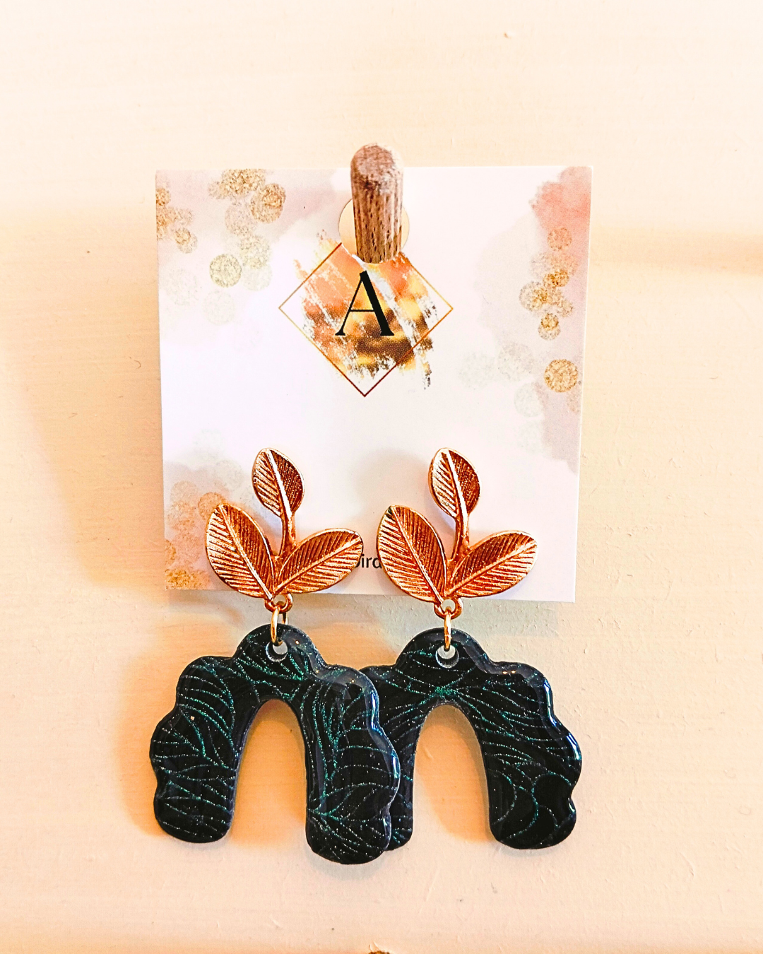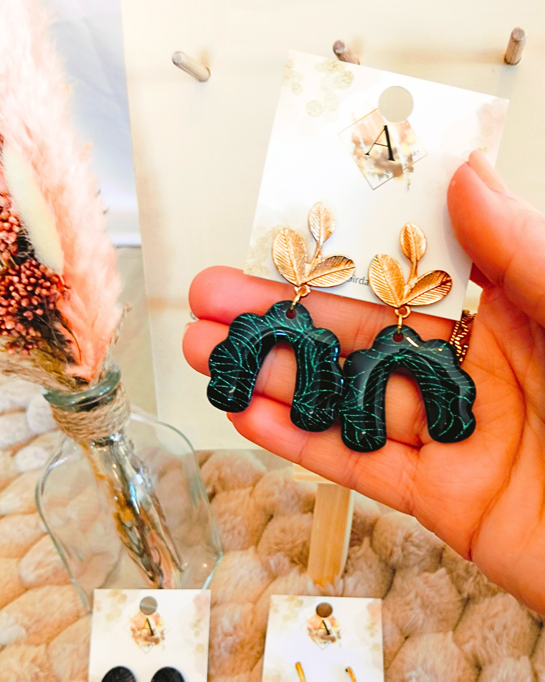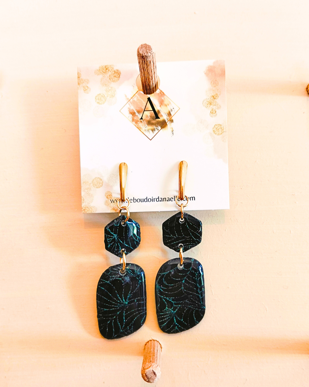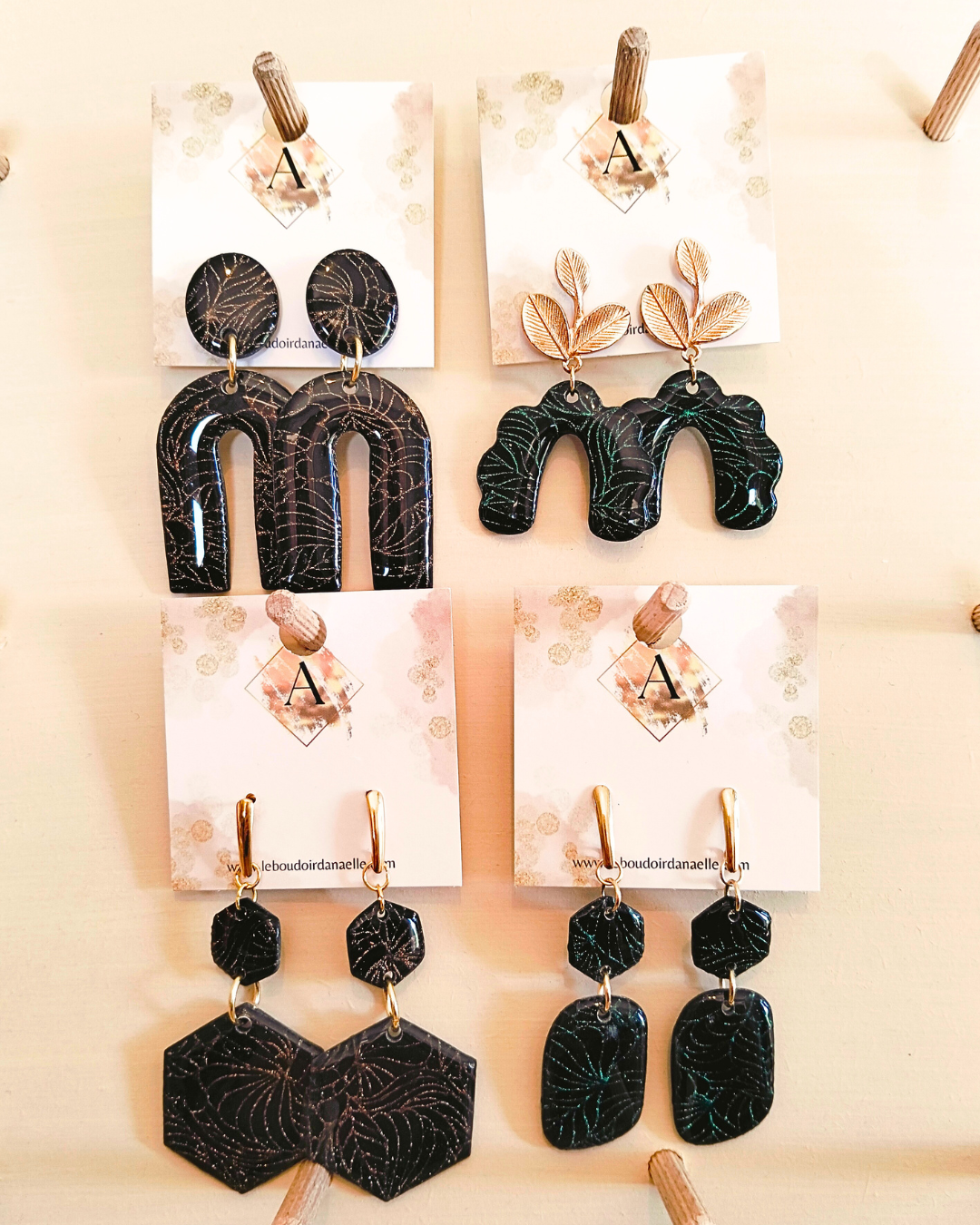 Boucles d’oreilles Ava : fond noir et motif fleuri pailleté (doré OU vert selon les modèles)