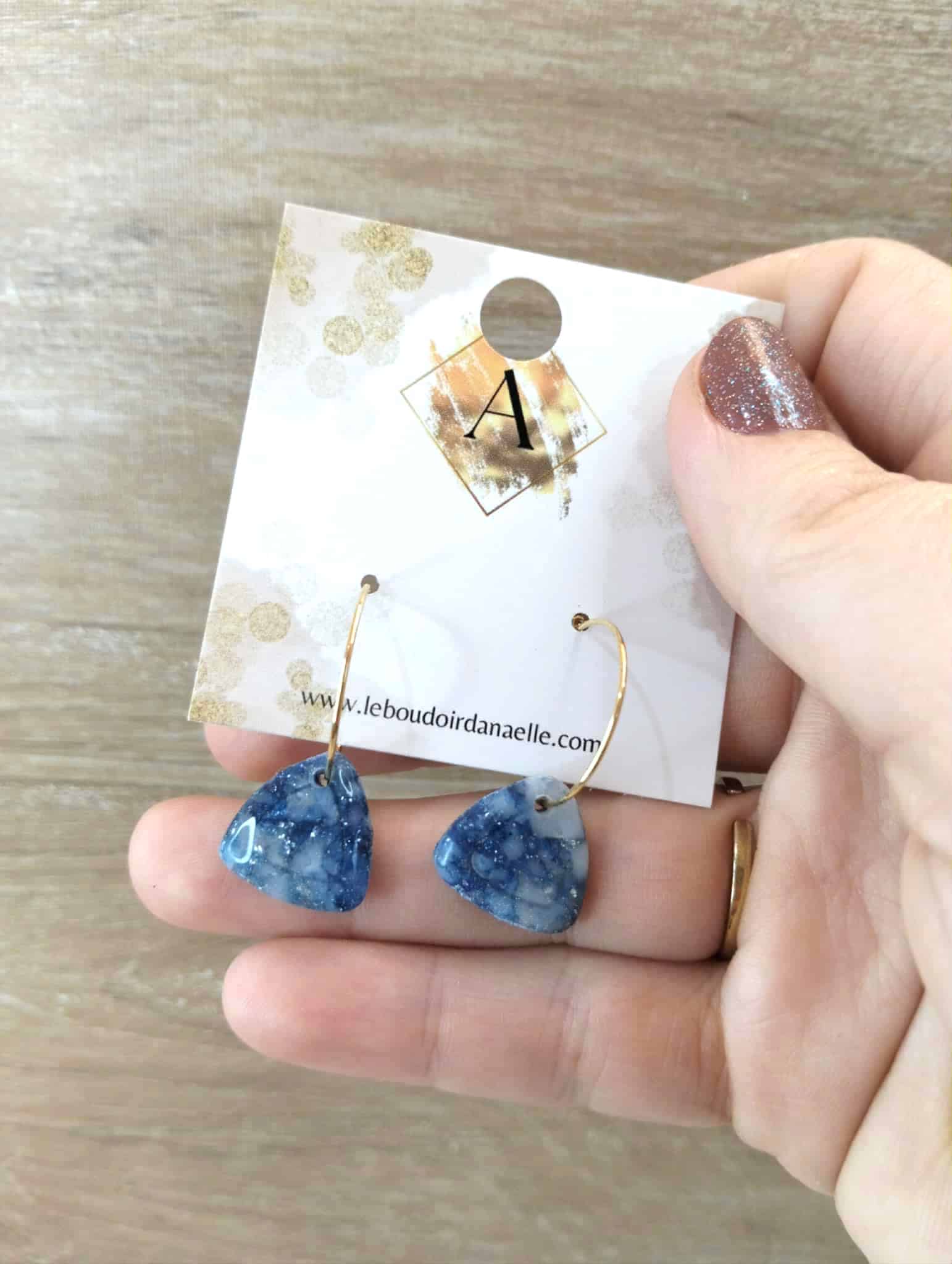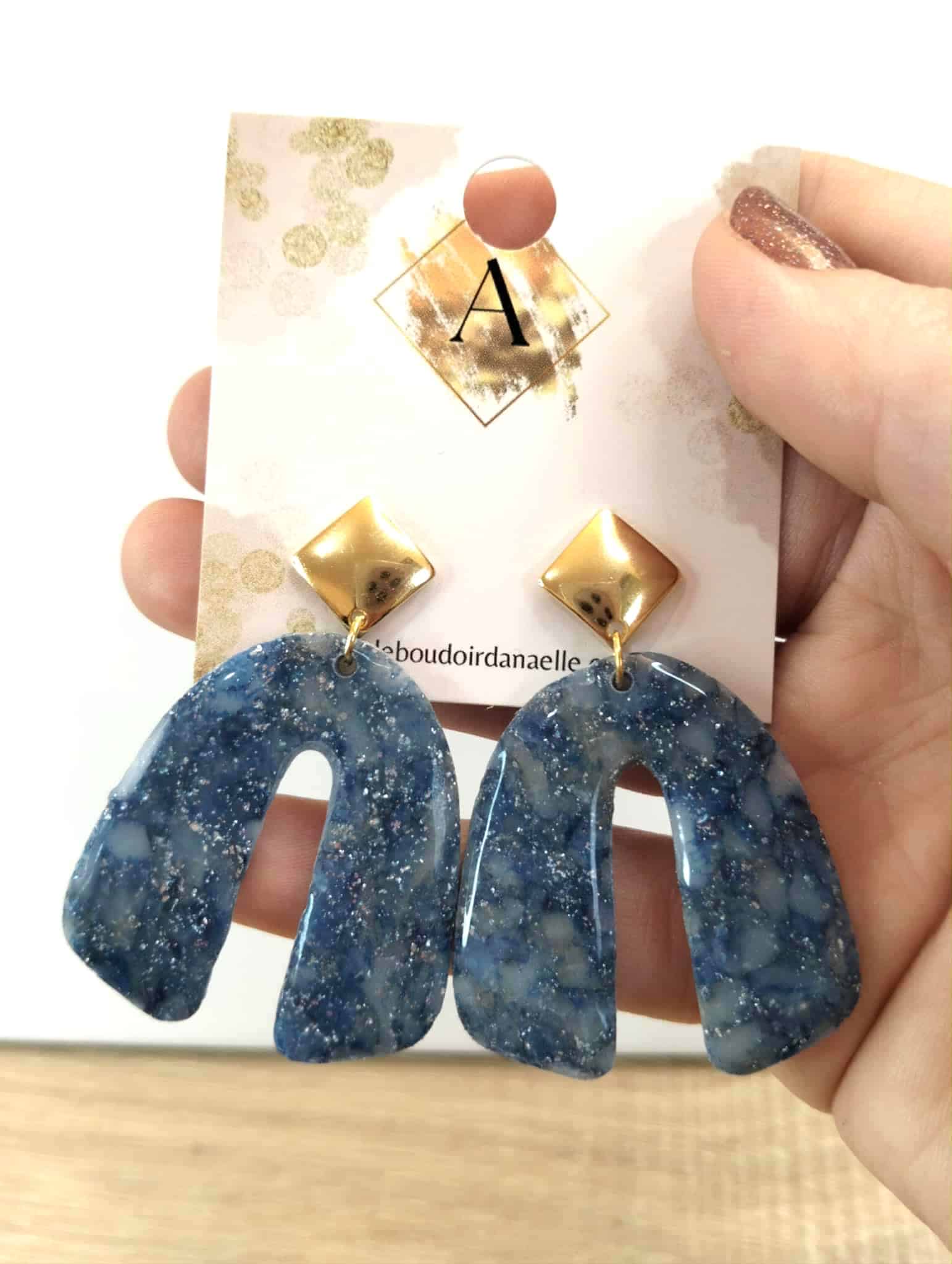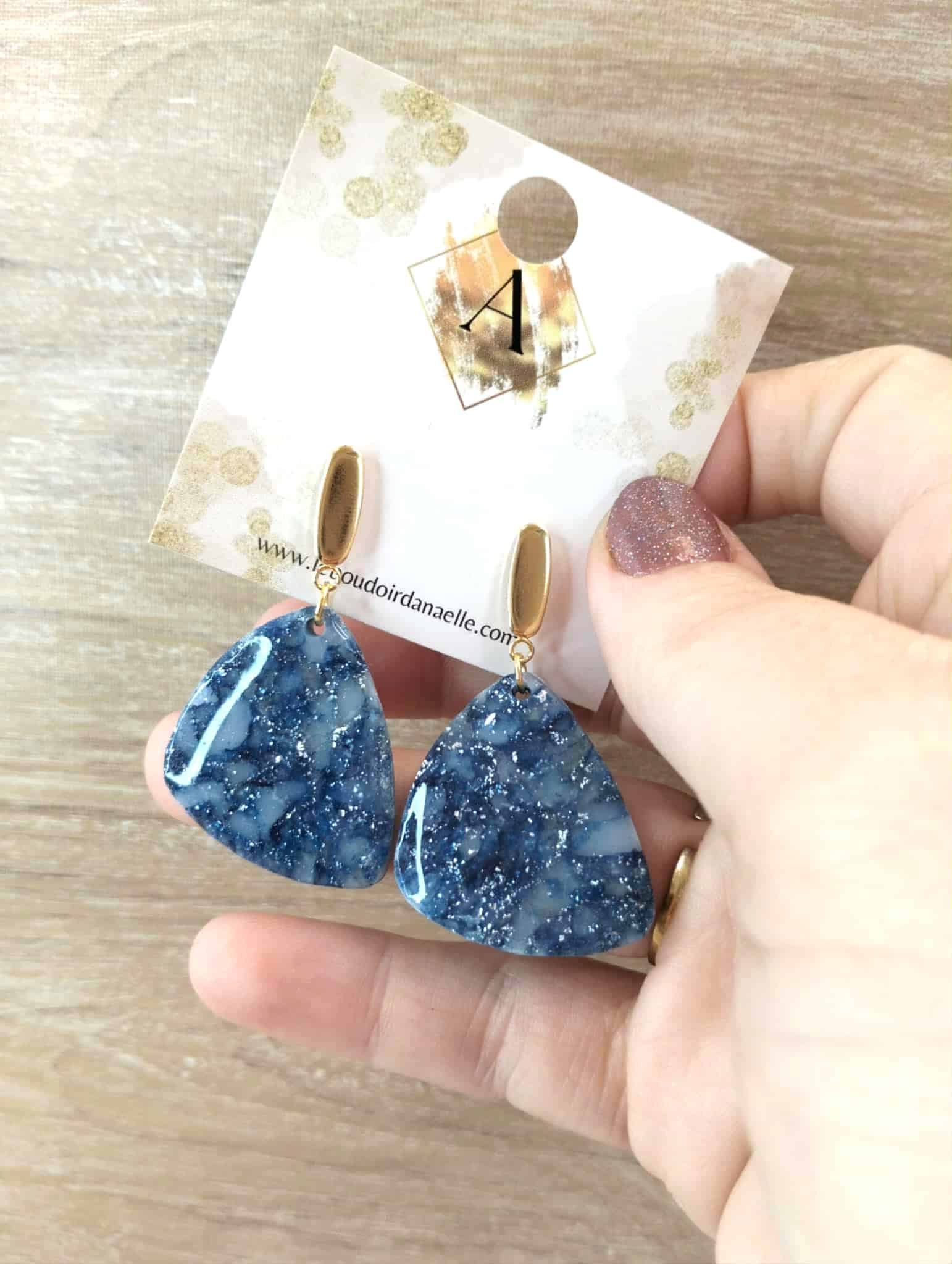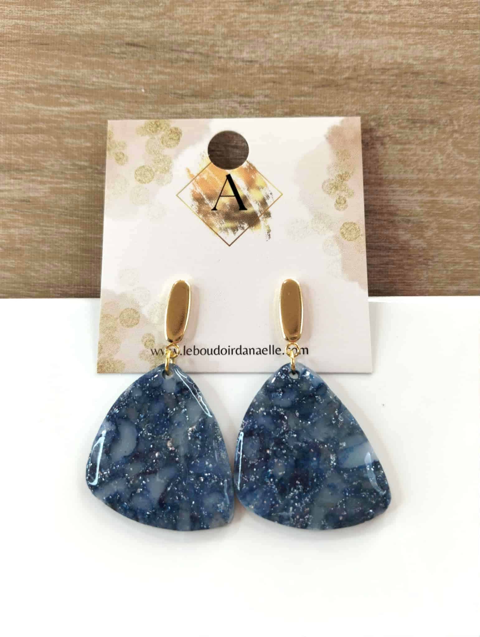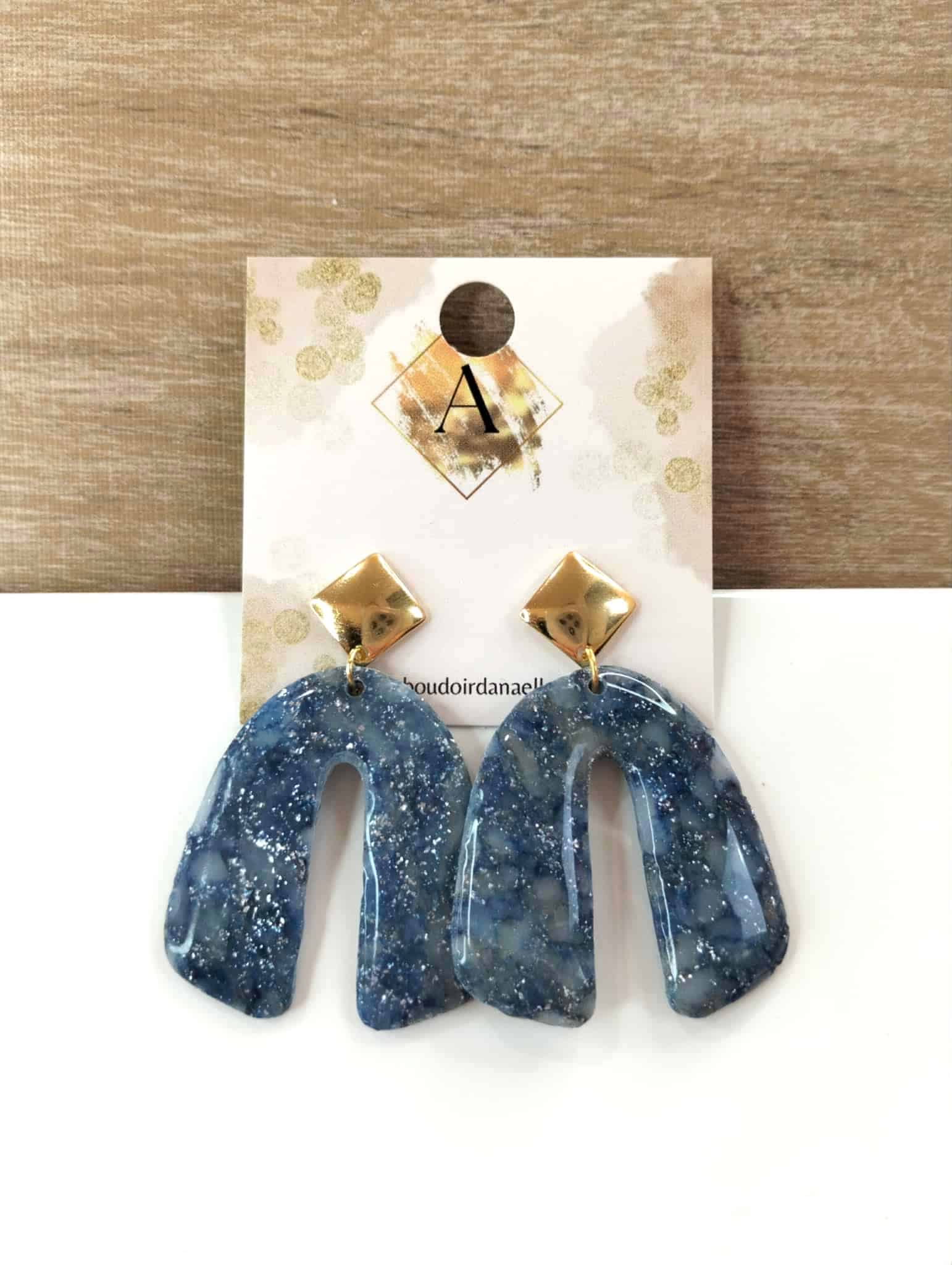 Chaque paire est unique. Le travail artisanal de la pâte polymère permet de donner vie à des nuances subtiles, où le bleu se décline en dégradés profonds, rappelant tour à tour la profondeur de l’océan, l’immensité du ciel d’été ou encore la sérénité d’un soir étoilé. Les incrustations argentées, telles de petites éclaboussures de lumière, évoquent la finesse d’un bijou précieux tout en conservant la légèreté et le confort propres à la pâte polymère.