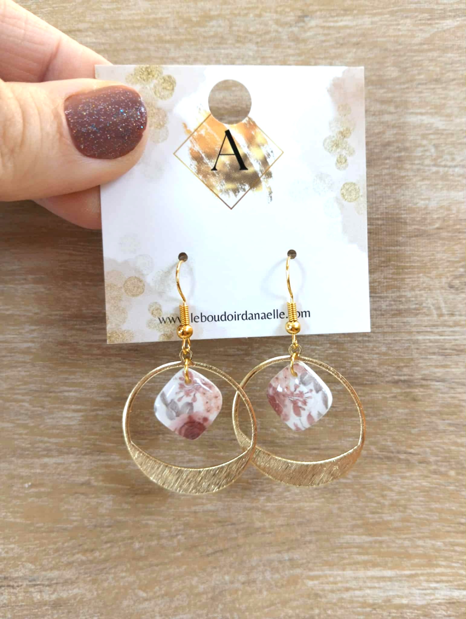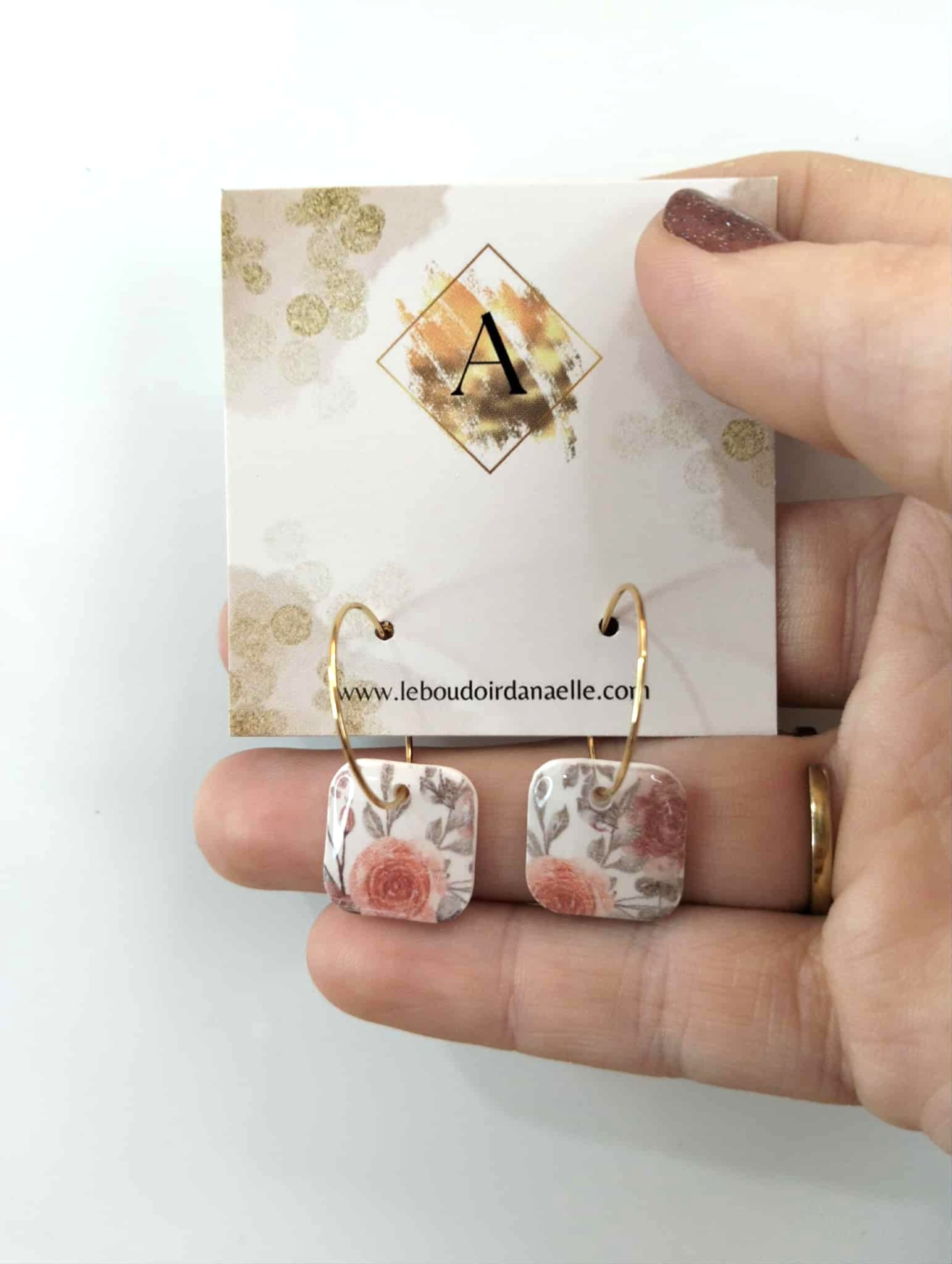 Ces boucles aux formes carrées, montées sur des anneaux dorés, allient originalité et légèreté. Leur design épuré met en valeur le motif floral pour un bijou à la fois tendance et facile à porter.