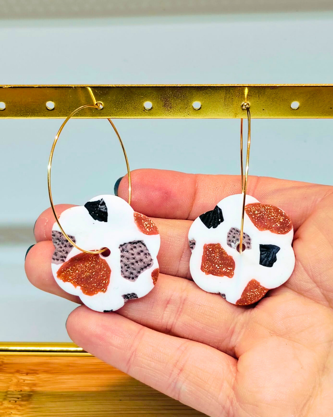 Découvrez les créoles Héloïse et leurs pendentifs en forme de fleurs. Egayez vos tenues avec ces bijoux artisanaux faits à la main en Aveyron.