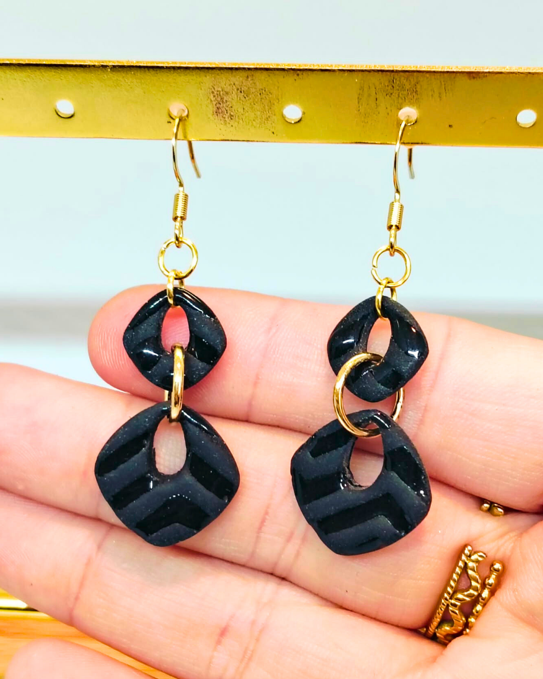 Boucles d’oreilles Jasmine aux motifs géométriques en partie noir mat et pour l’autre partie recouvert de résine.