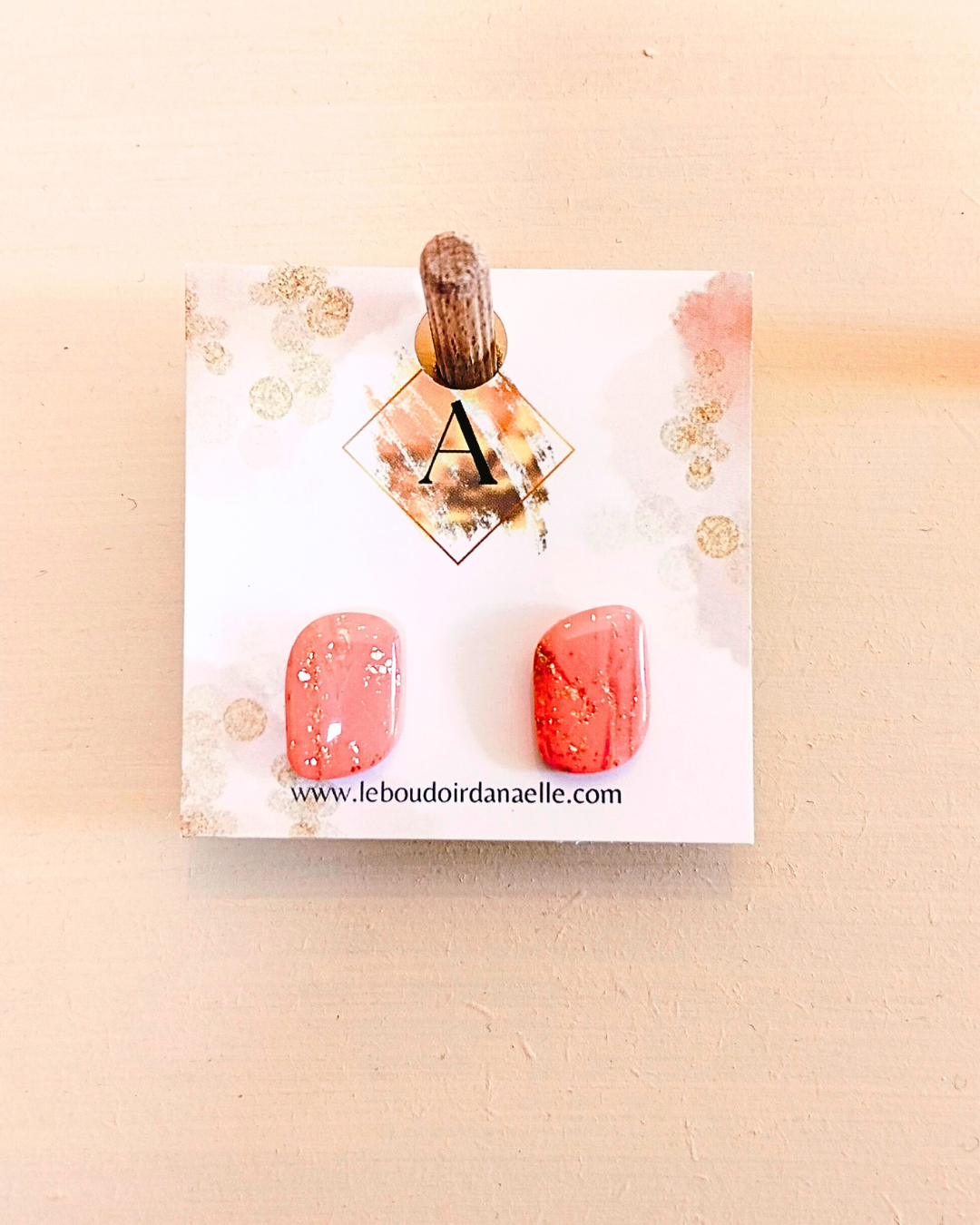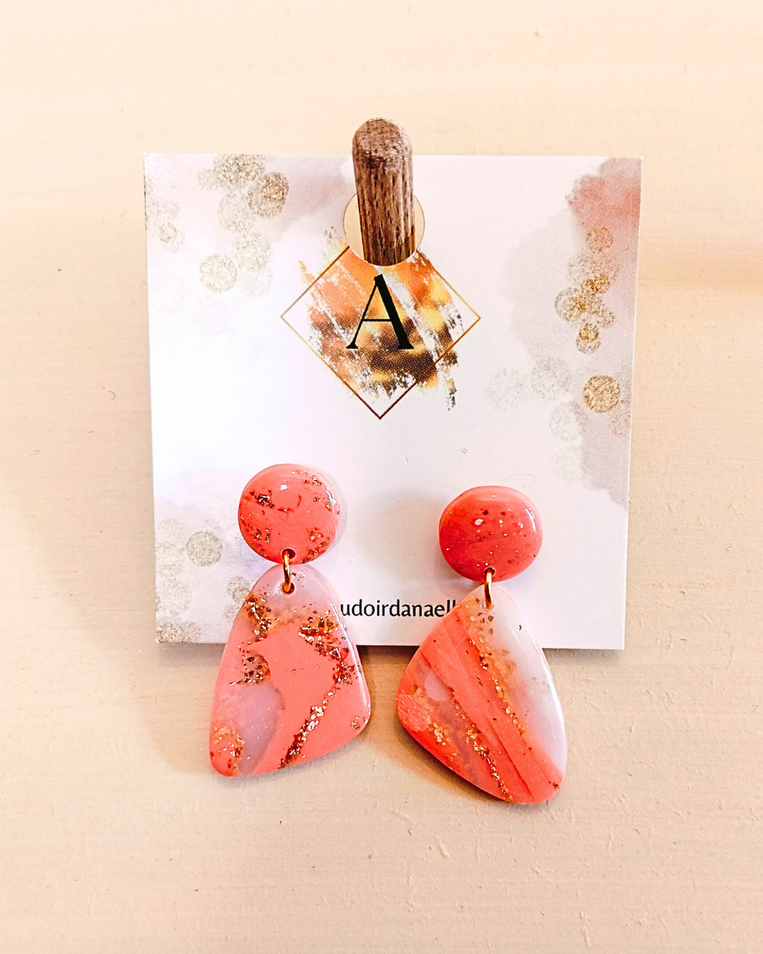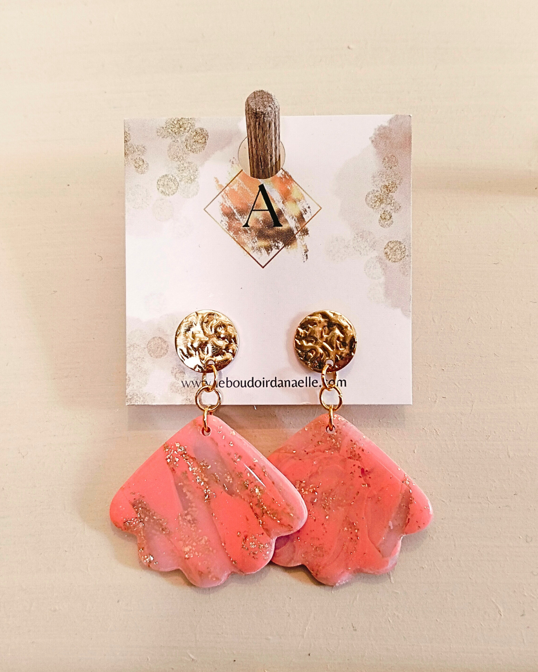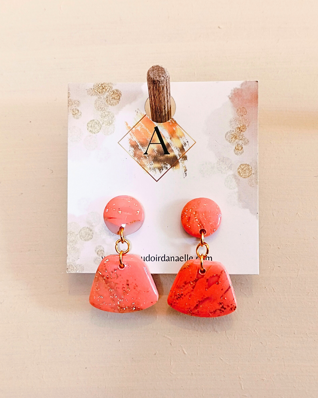 Boucles d’oreilles Lily-Rose : pâte polymère saumon et transparente, feuille d’or