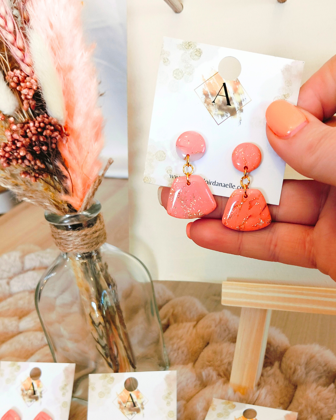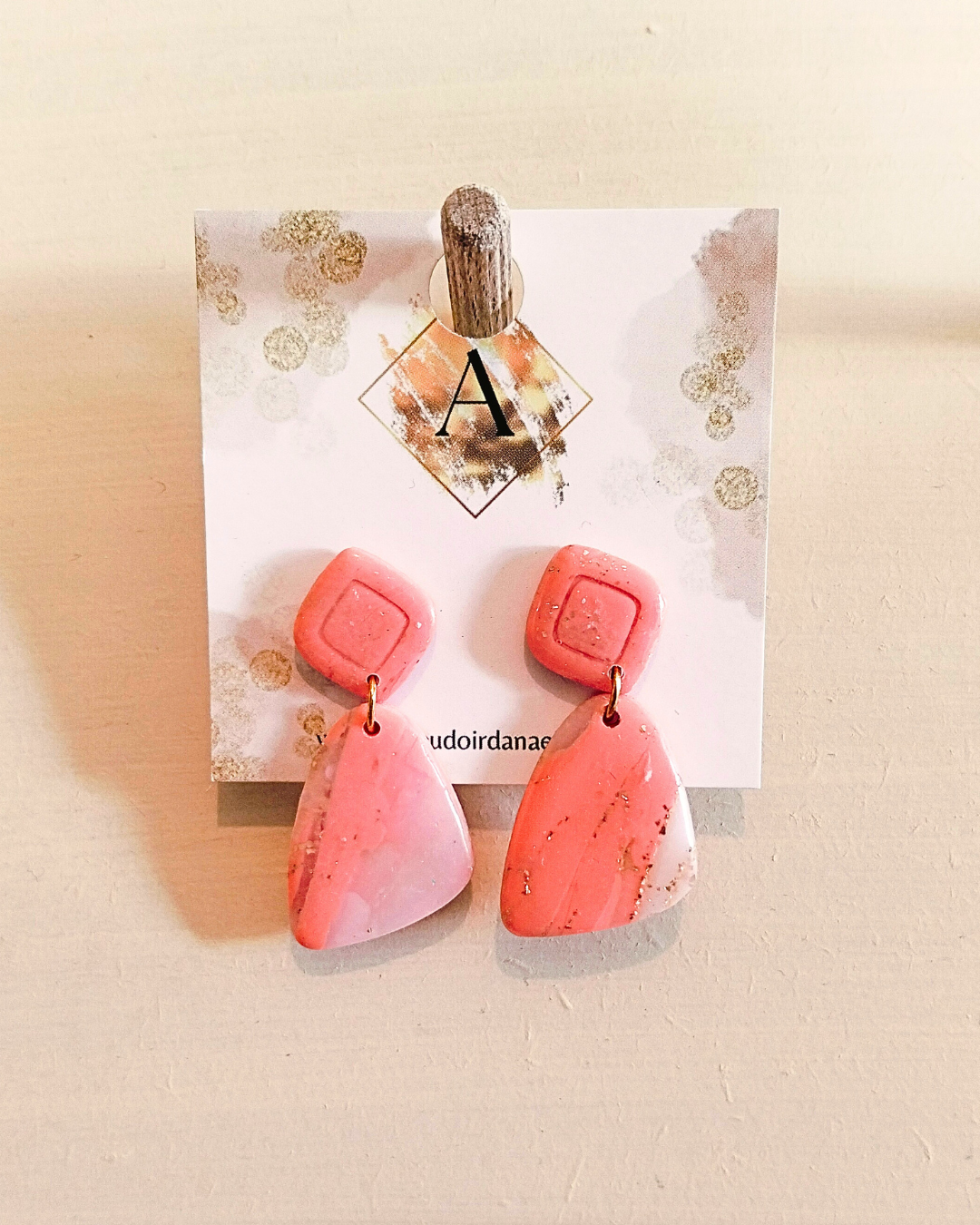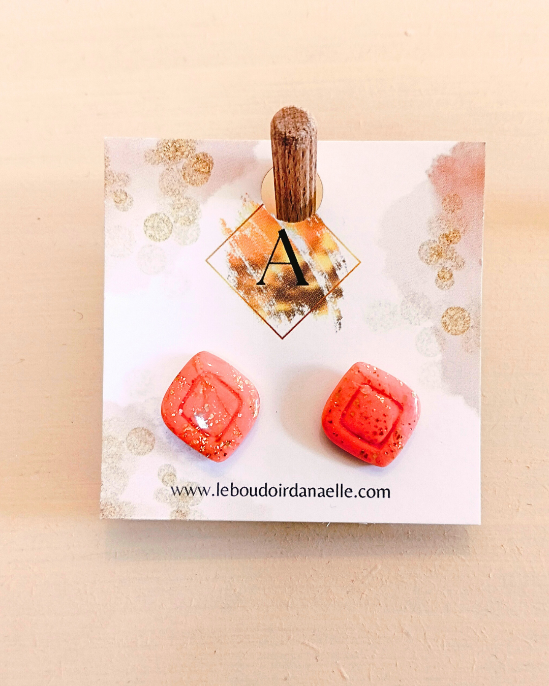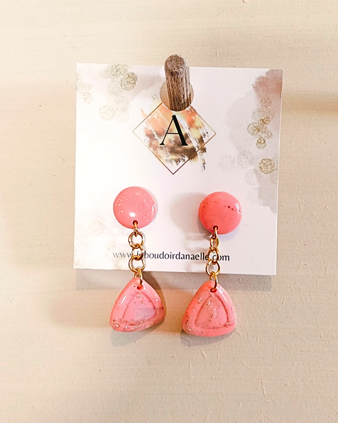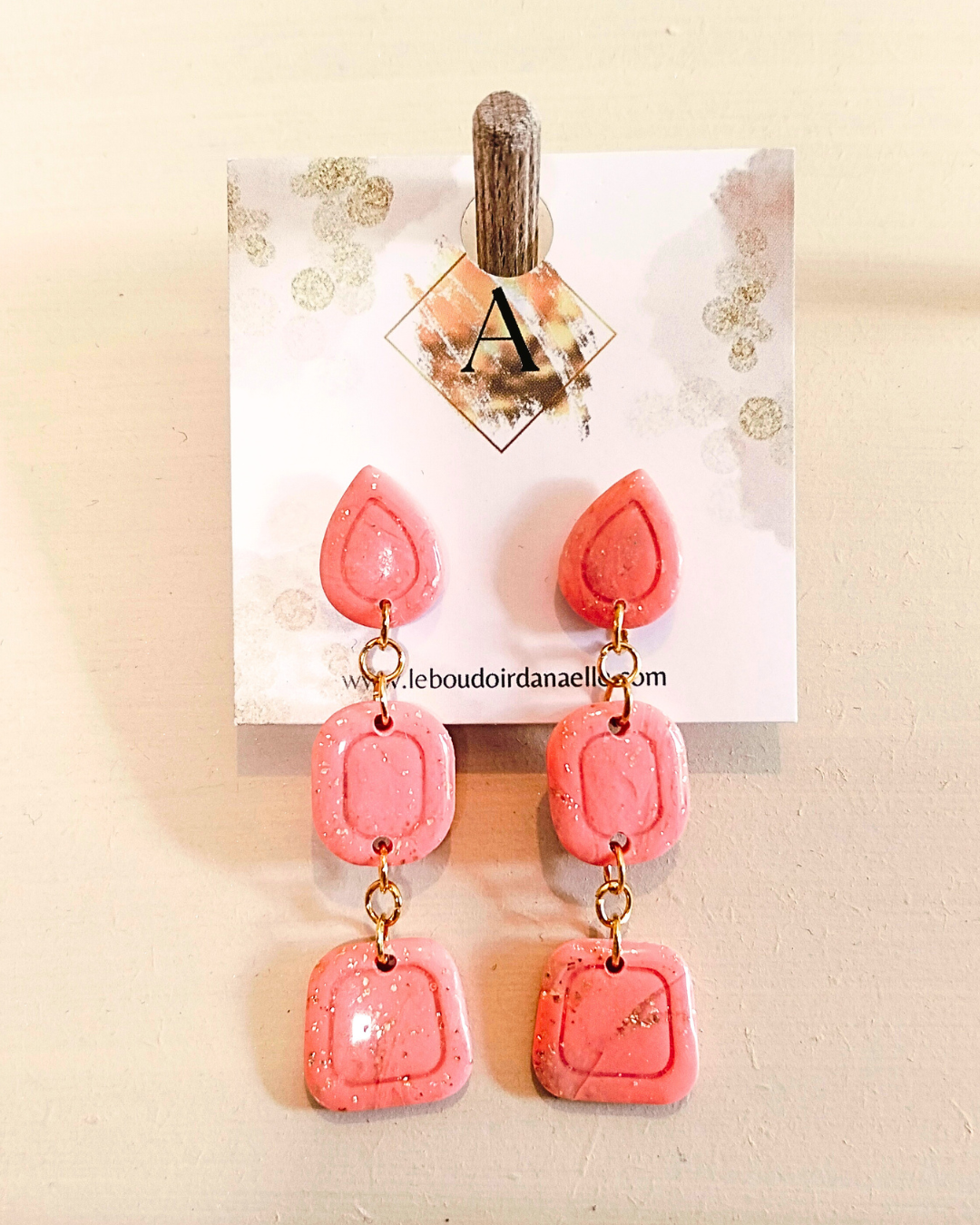 Boucles d’oreilles Lily-Rose : pâte polymère saumon et transparente, feuille d’or