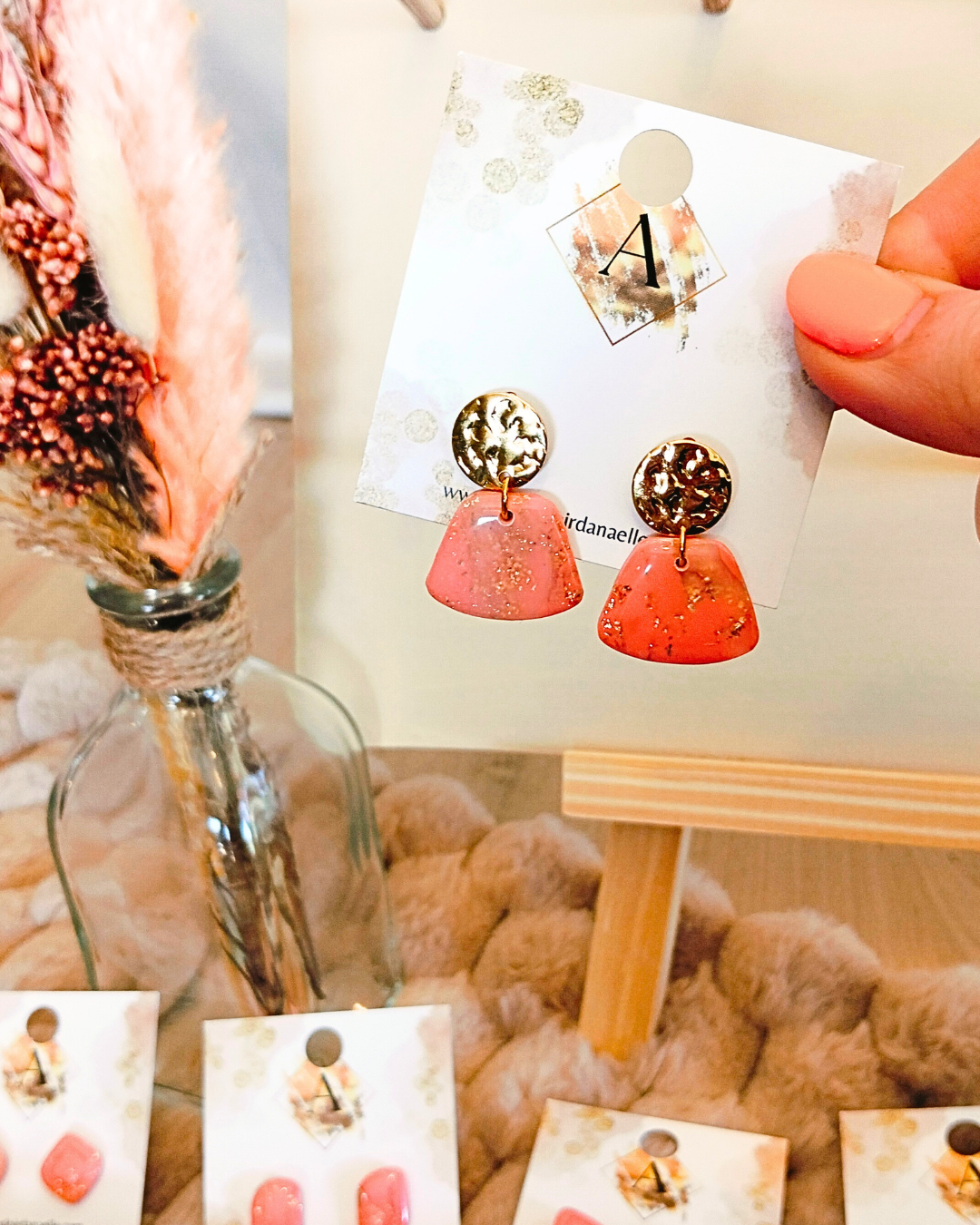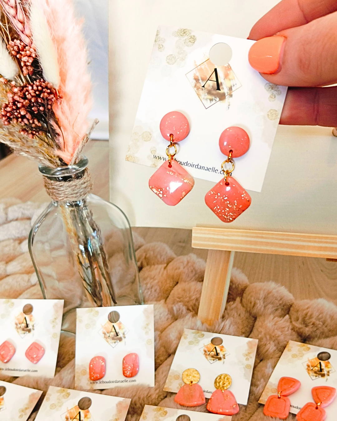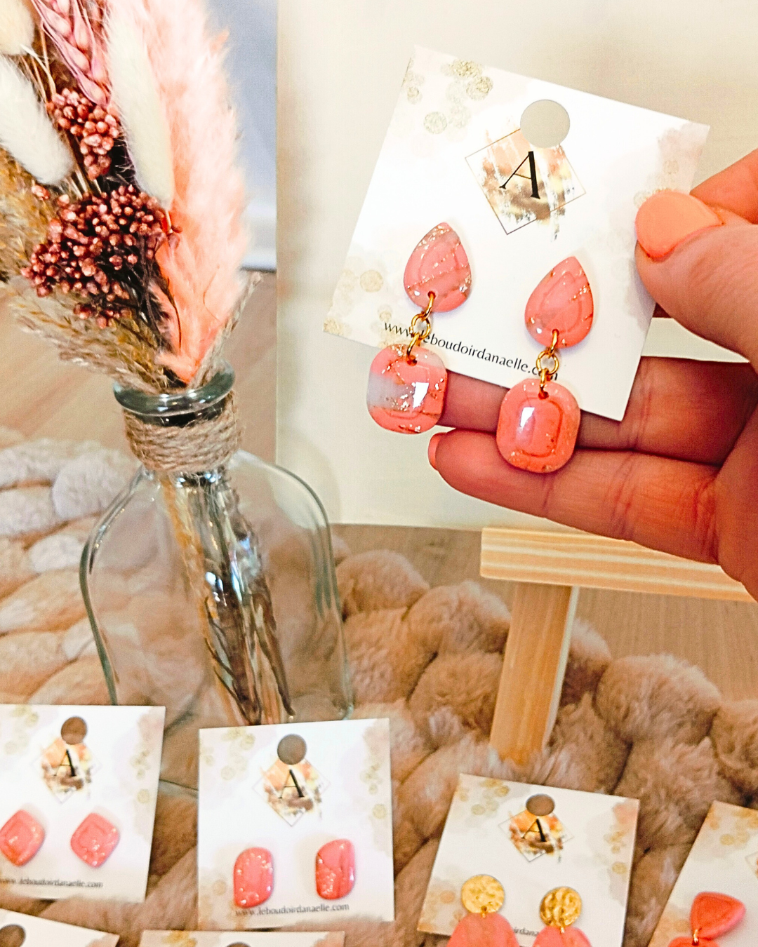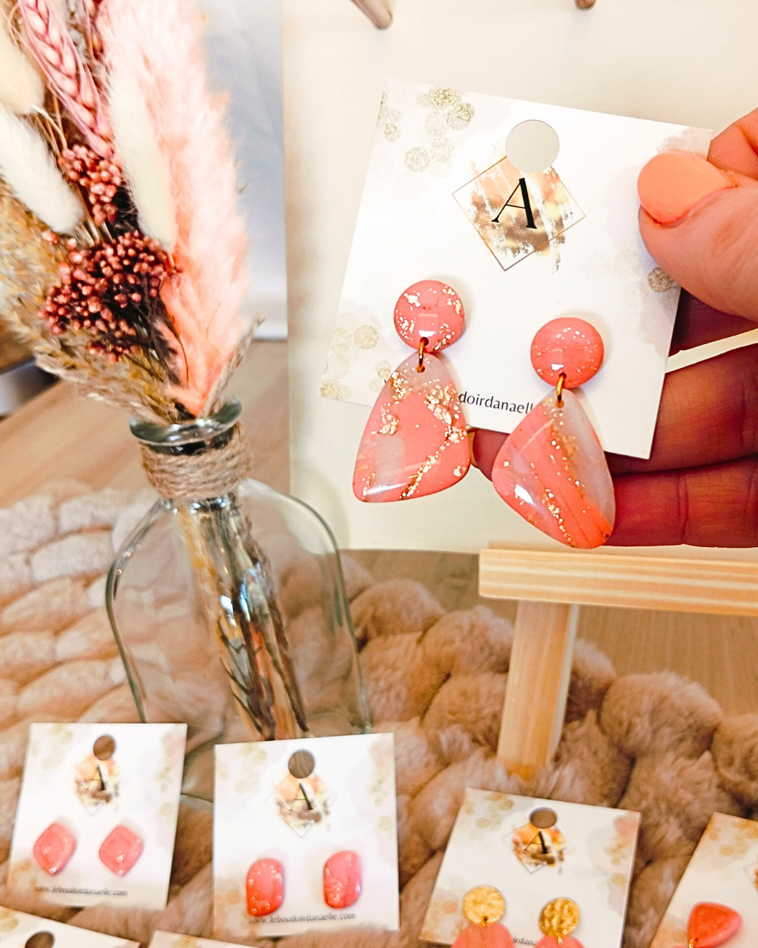 Boucles d’oreilles Lily-Rose : pâte polymère saumon et transparente, feuille d’or