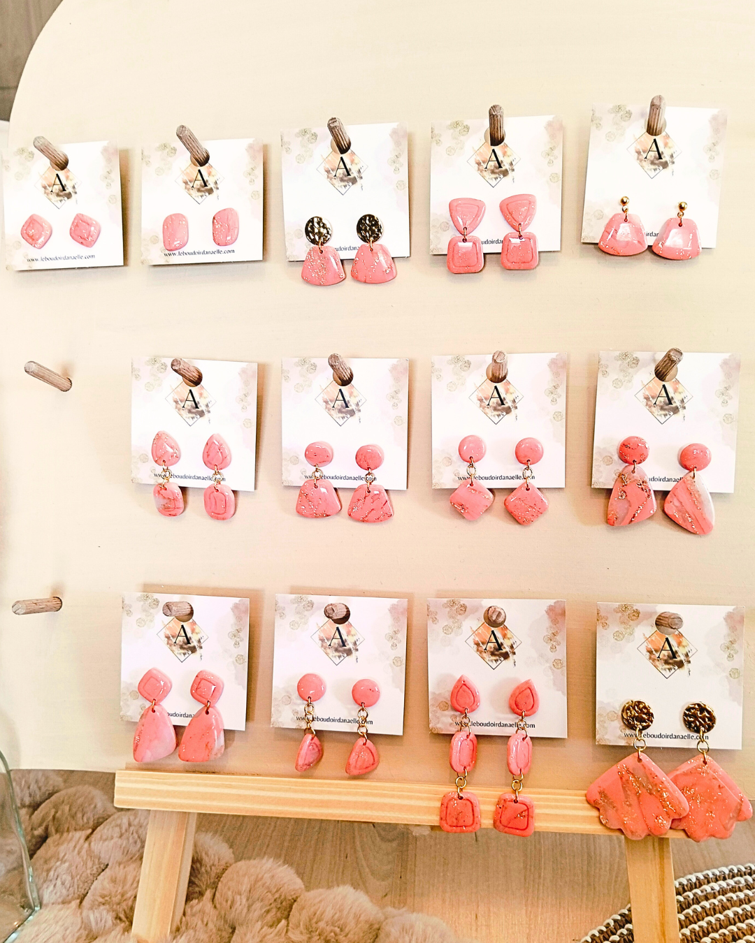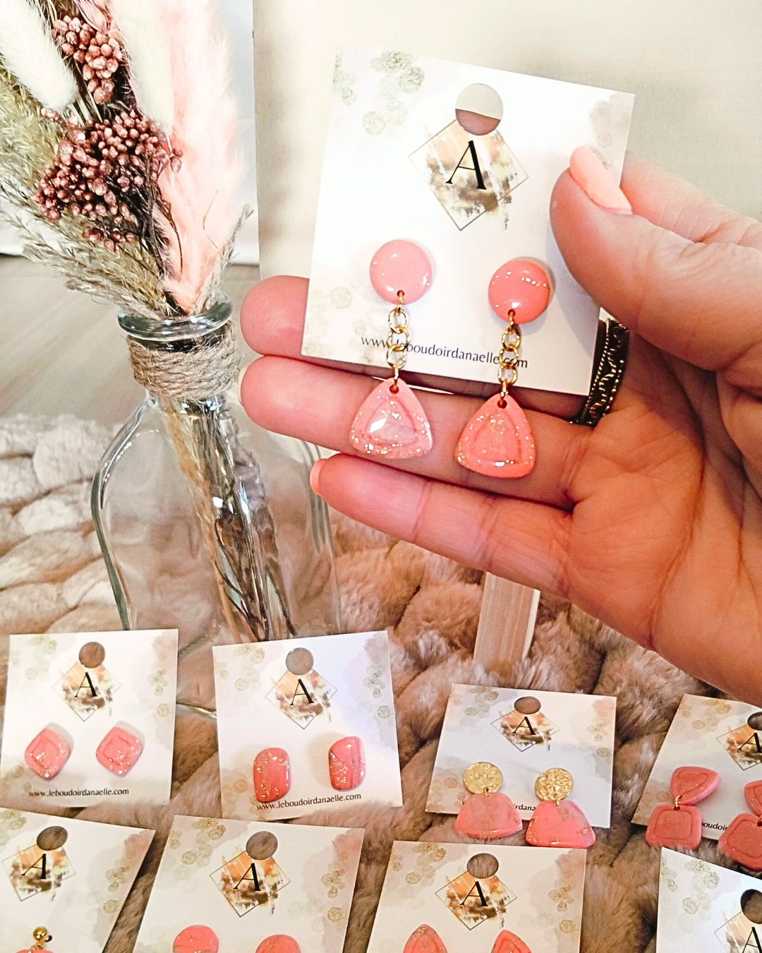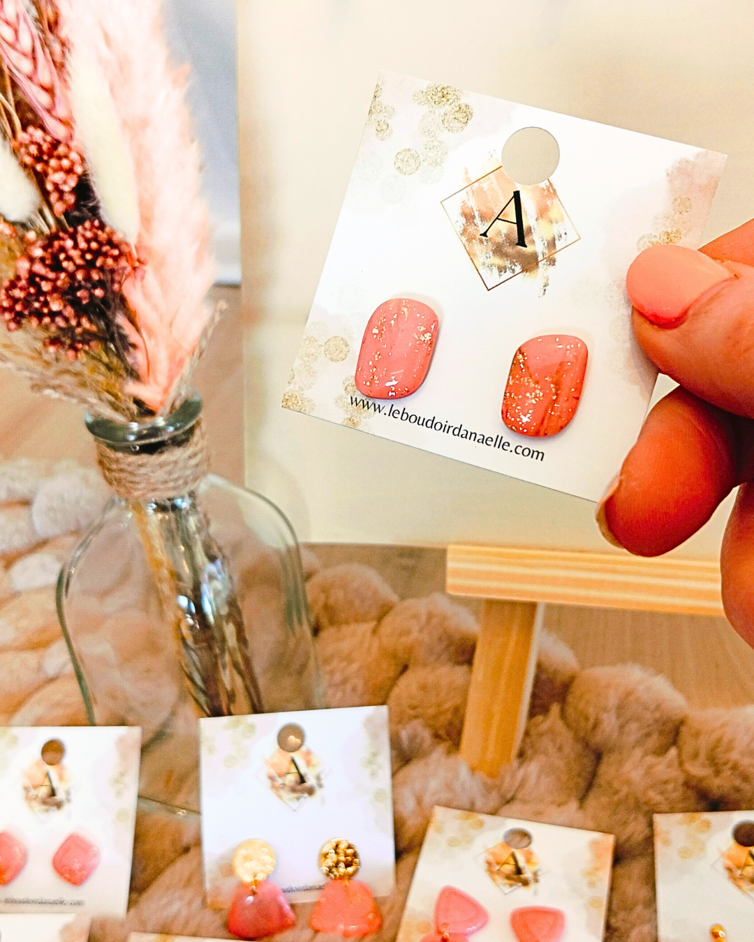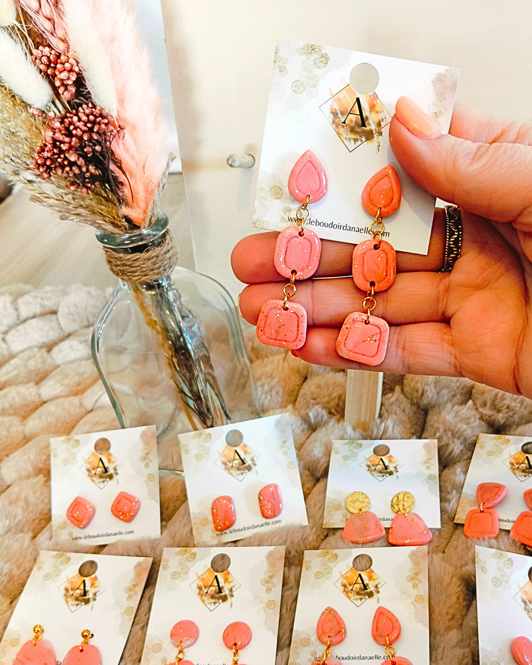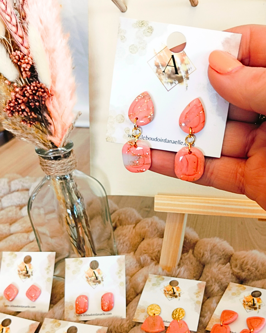 Boucles d’oreilles Lily-Rose : pâte polymère saumon et transparente, feuille d’or