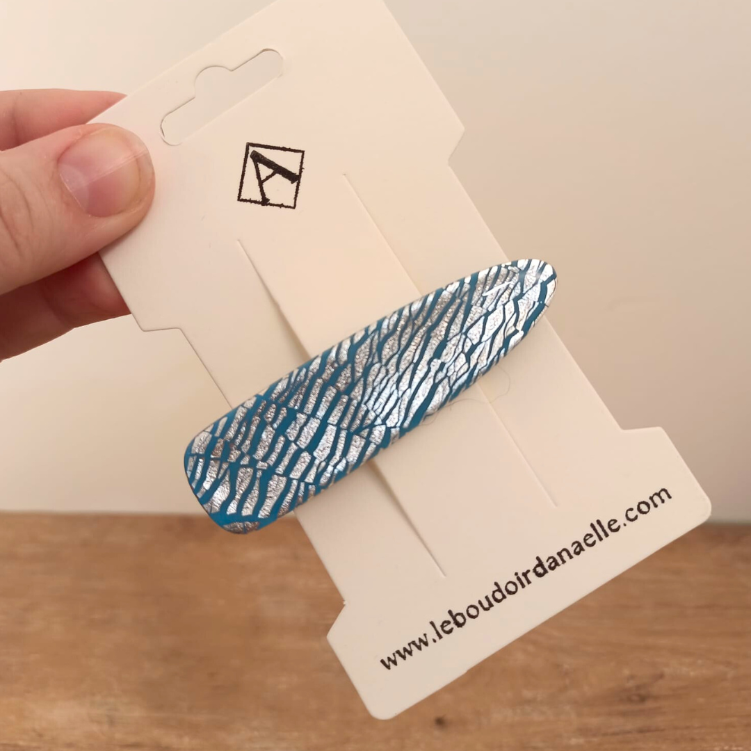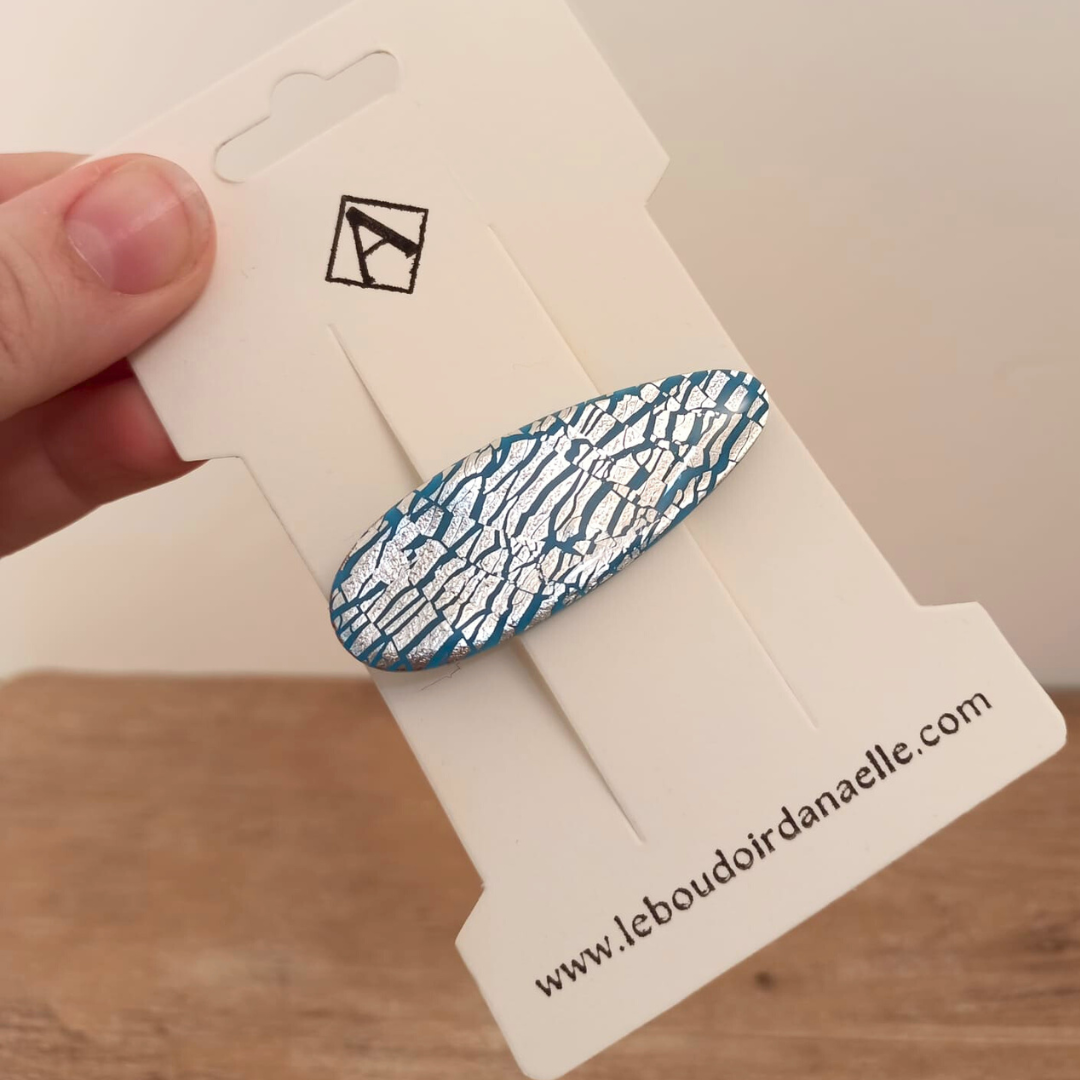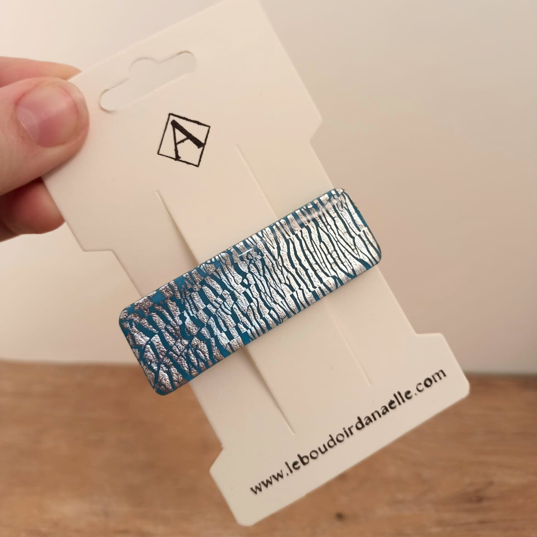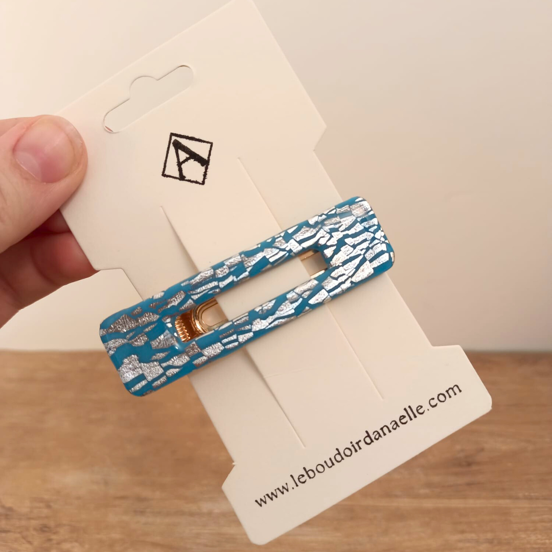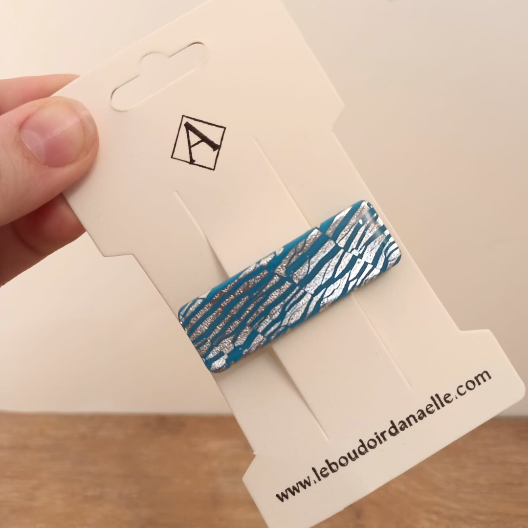 De l’élégance et du style pour la barrette Louise (bleu et argenté). Réalisée à la main en pâte polymère et feuille argentée pour un modèle unique.