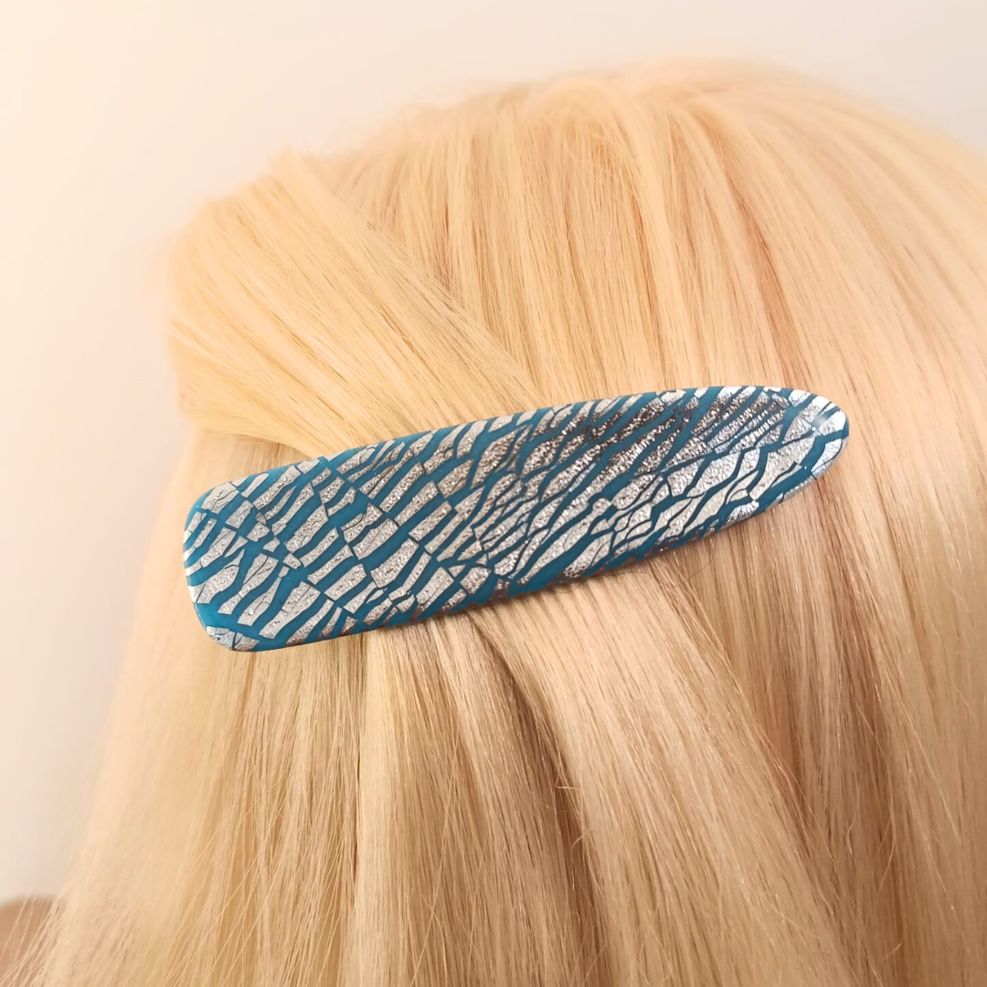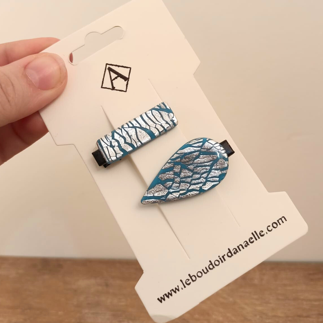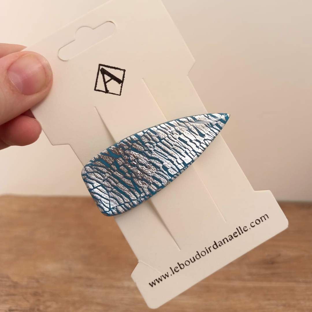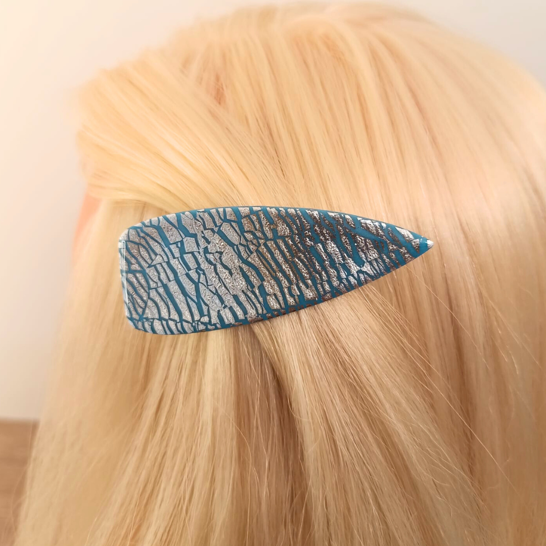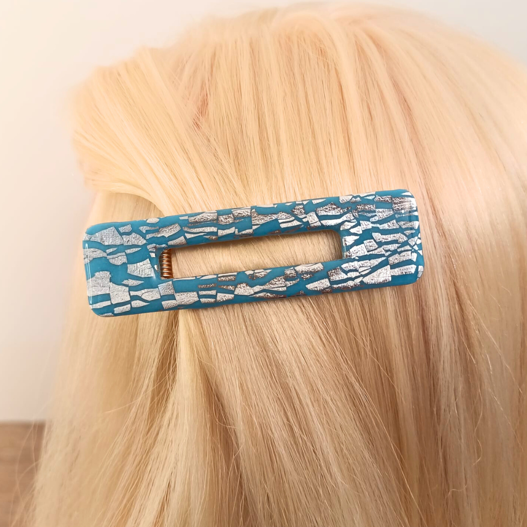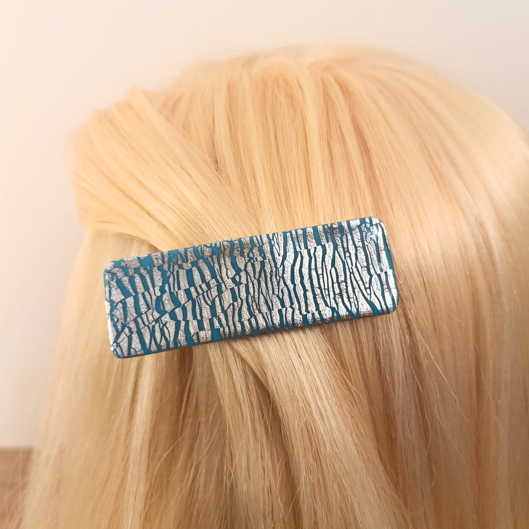 De l’élégance et du style pour la barrette Louise (bleu et argenté). Réalisée à la main en pâte polymère et feuille argentée pour un modèle unique.