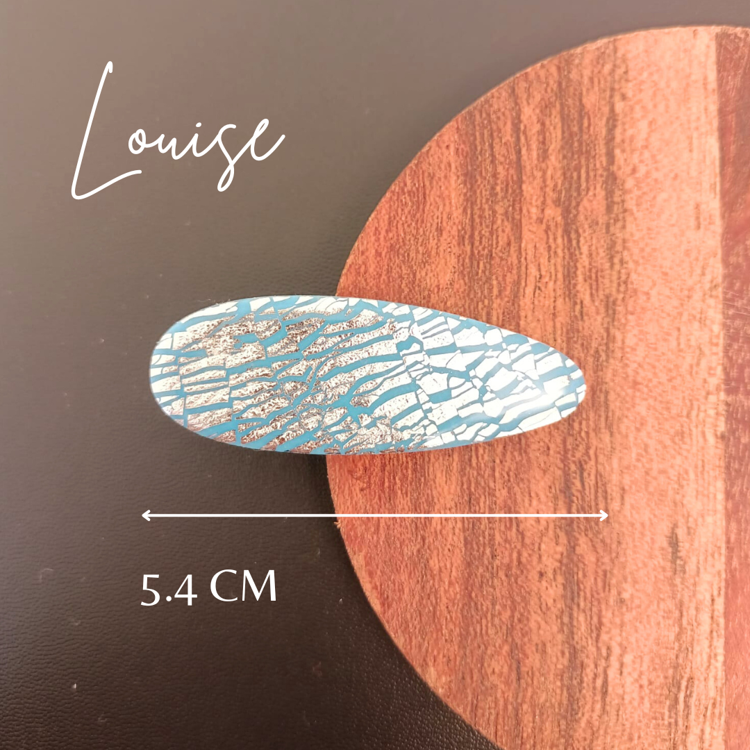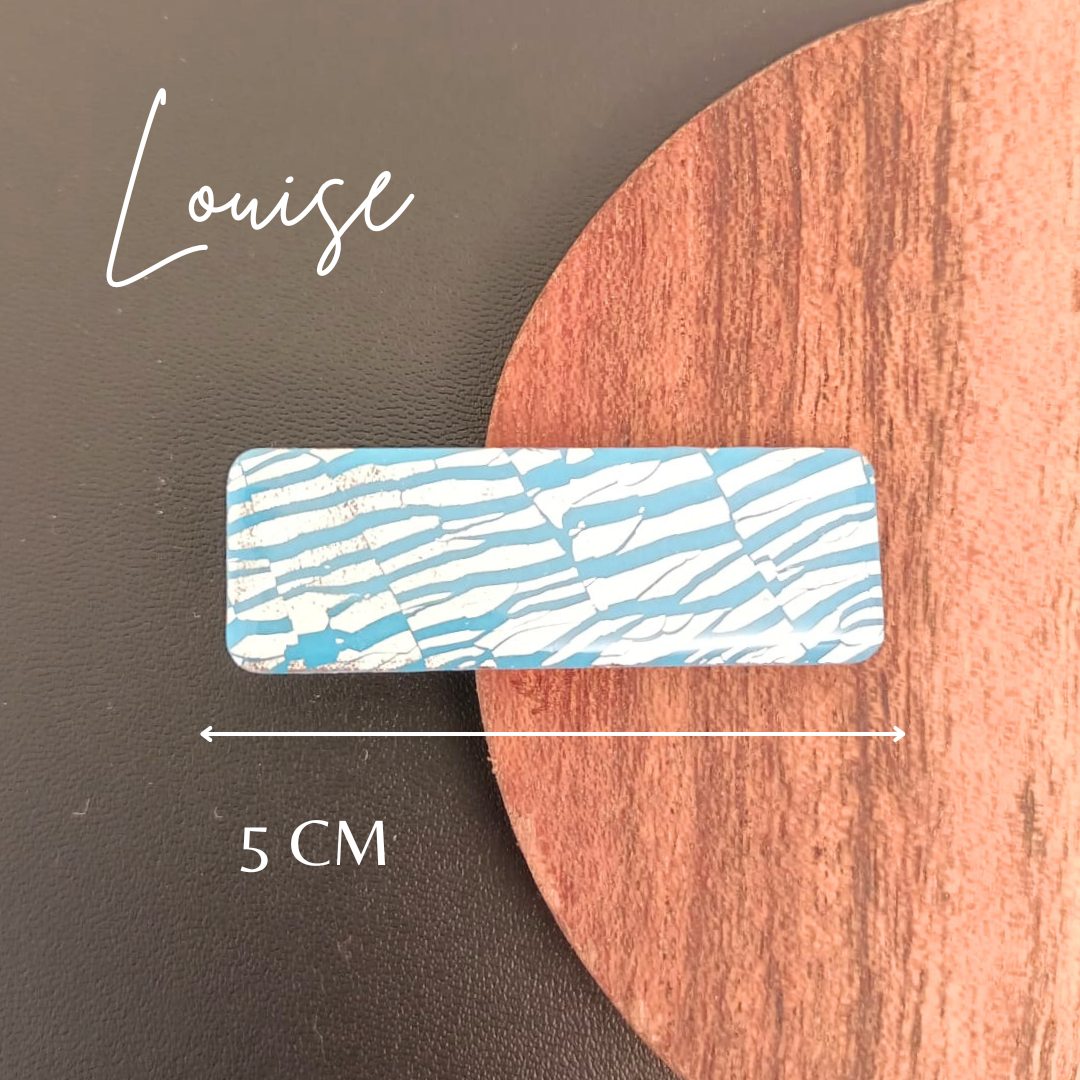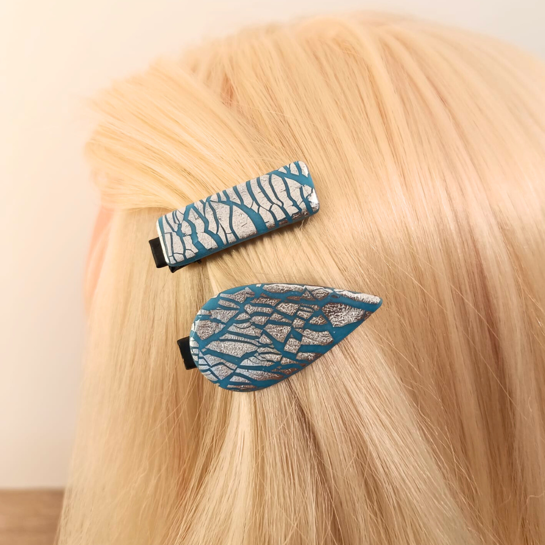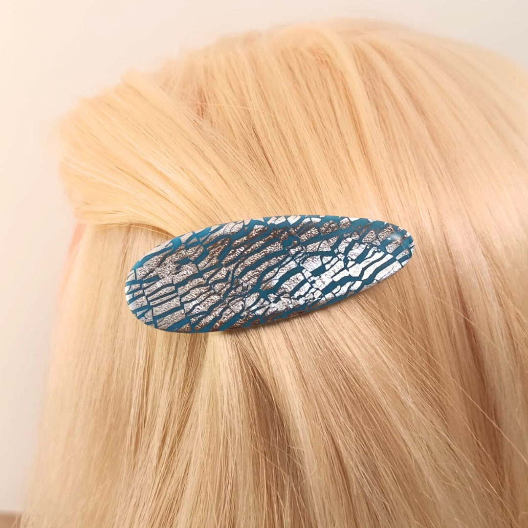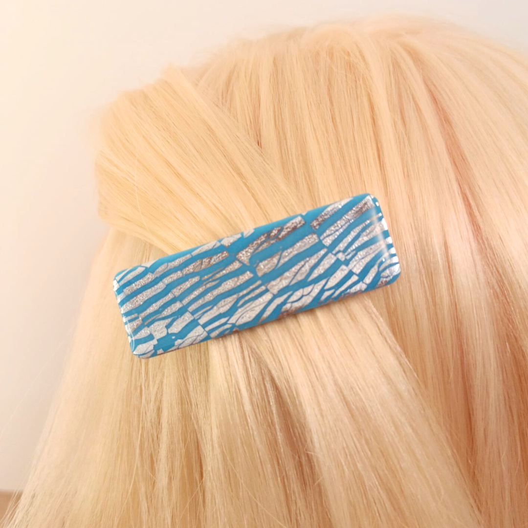 De l’élégance et du style pour la barrette Louise (bleu et argenté). Réalisée à la main en pâte polymère et feuille argentée pour un modèle unique.