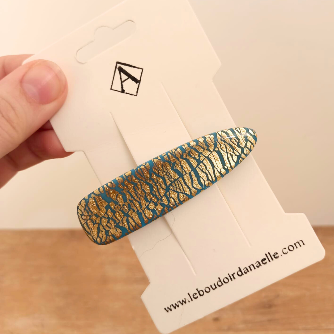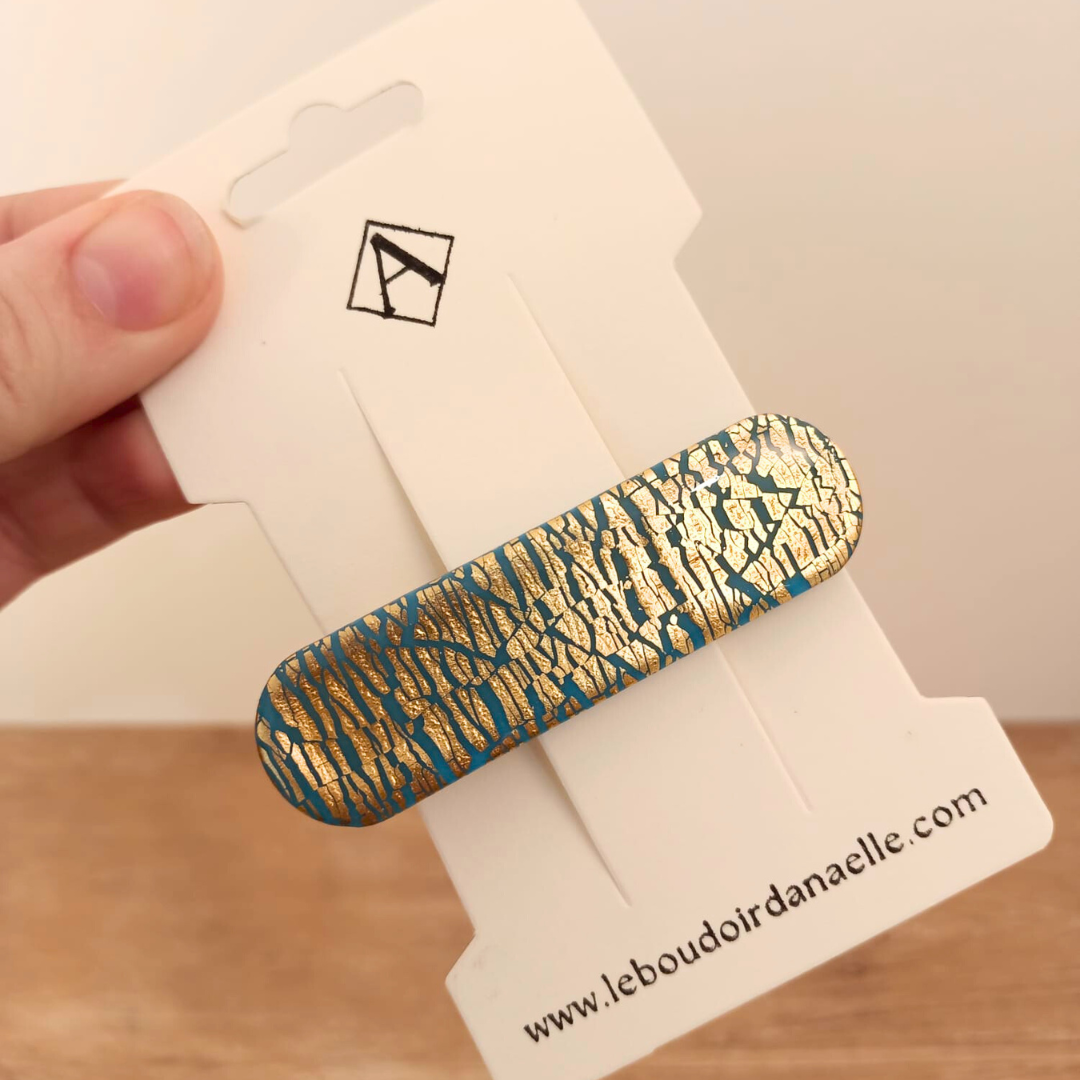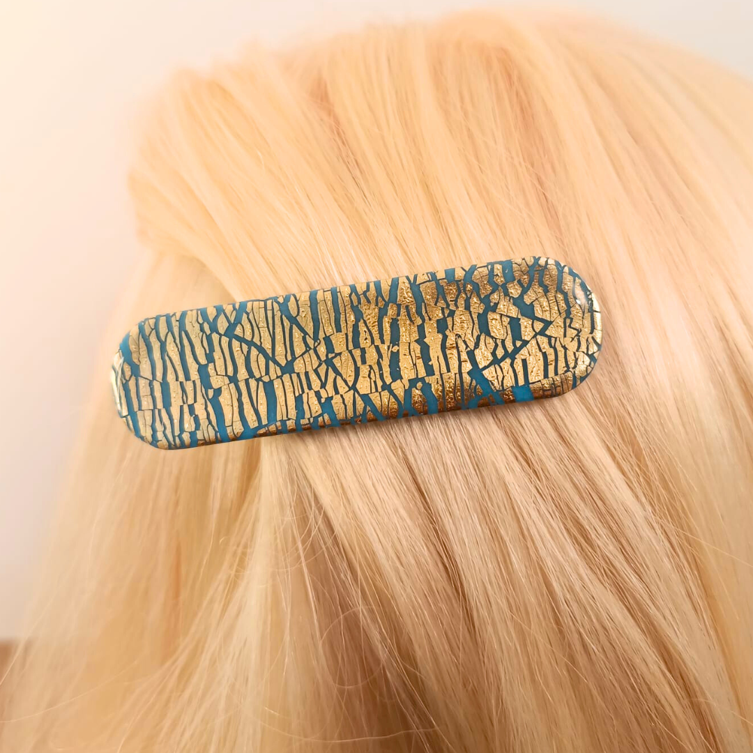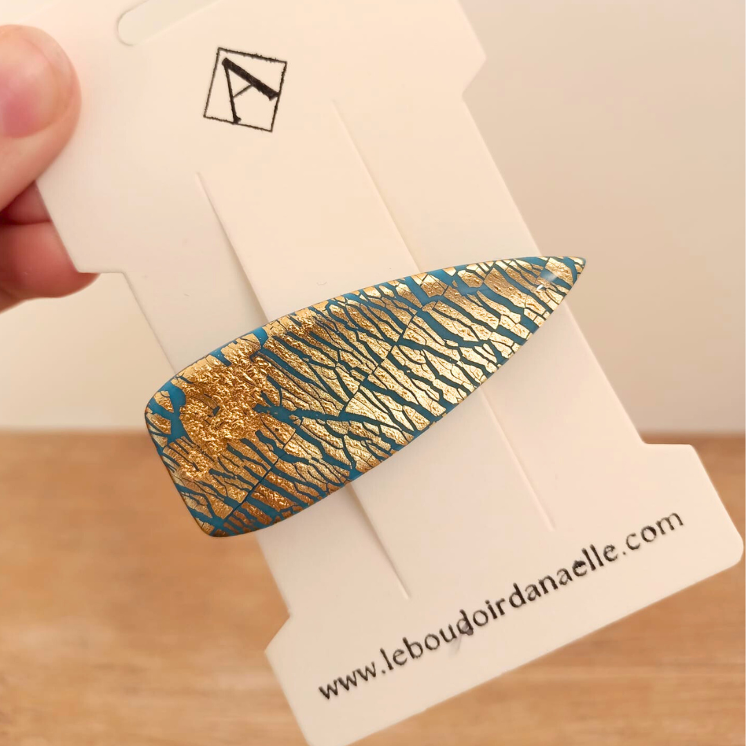 De l’élégance et du style pour la barrette Louise (bleu et doré). Réalisée à la main en pâte polymère et feuille d’or pour un modèle unique.