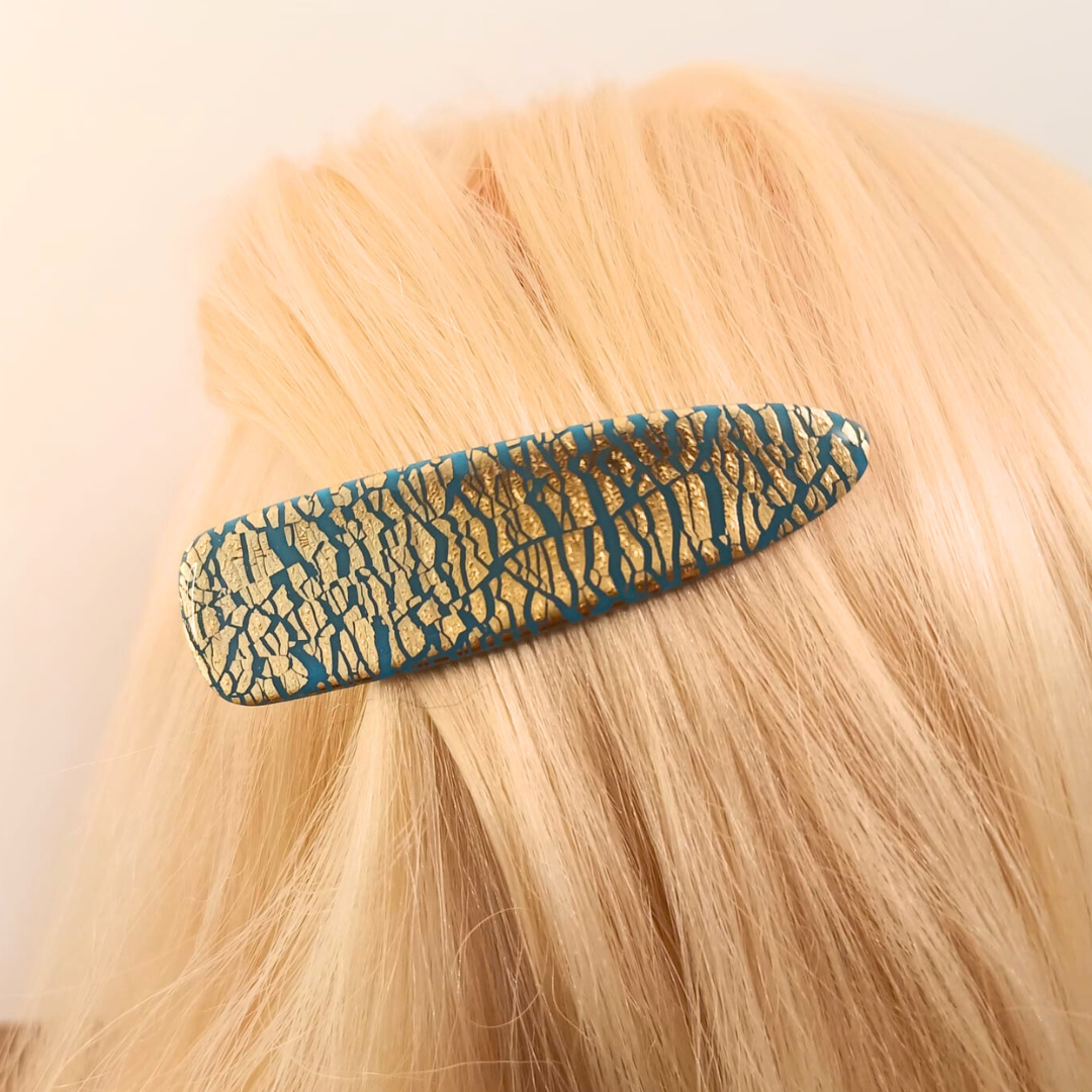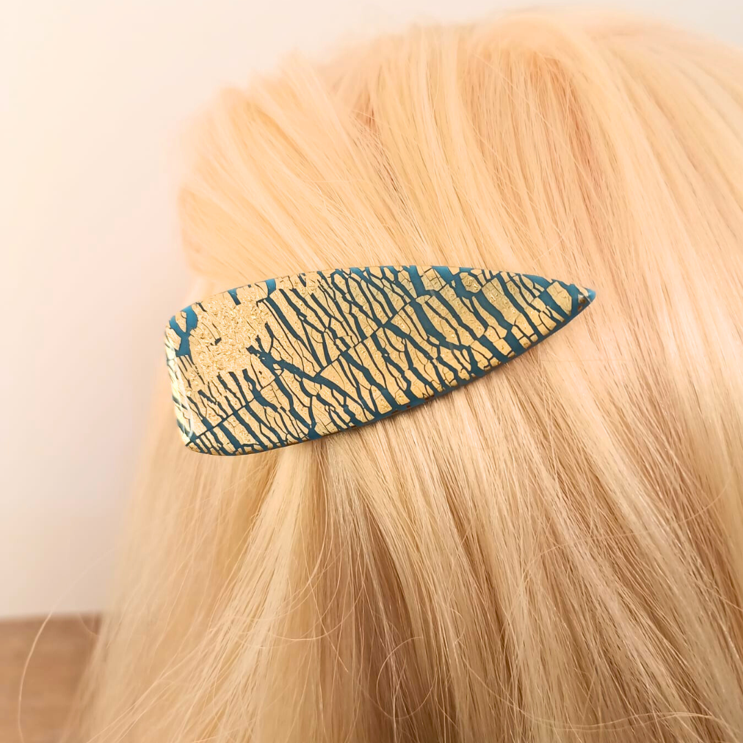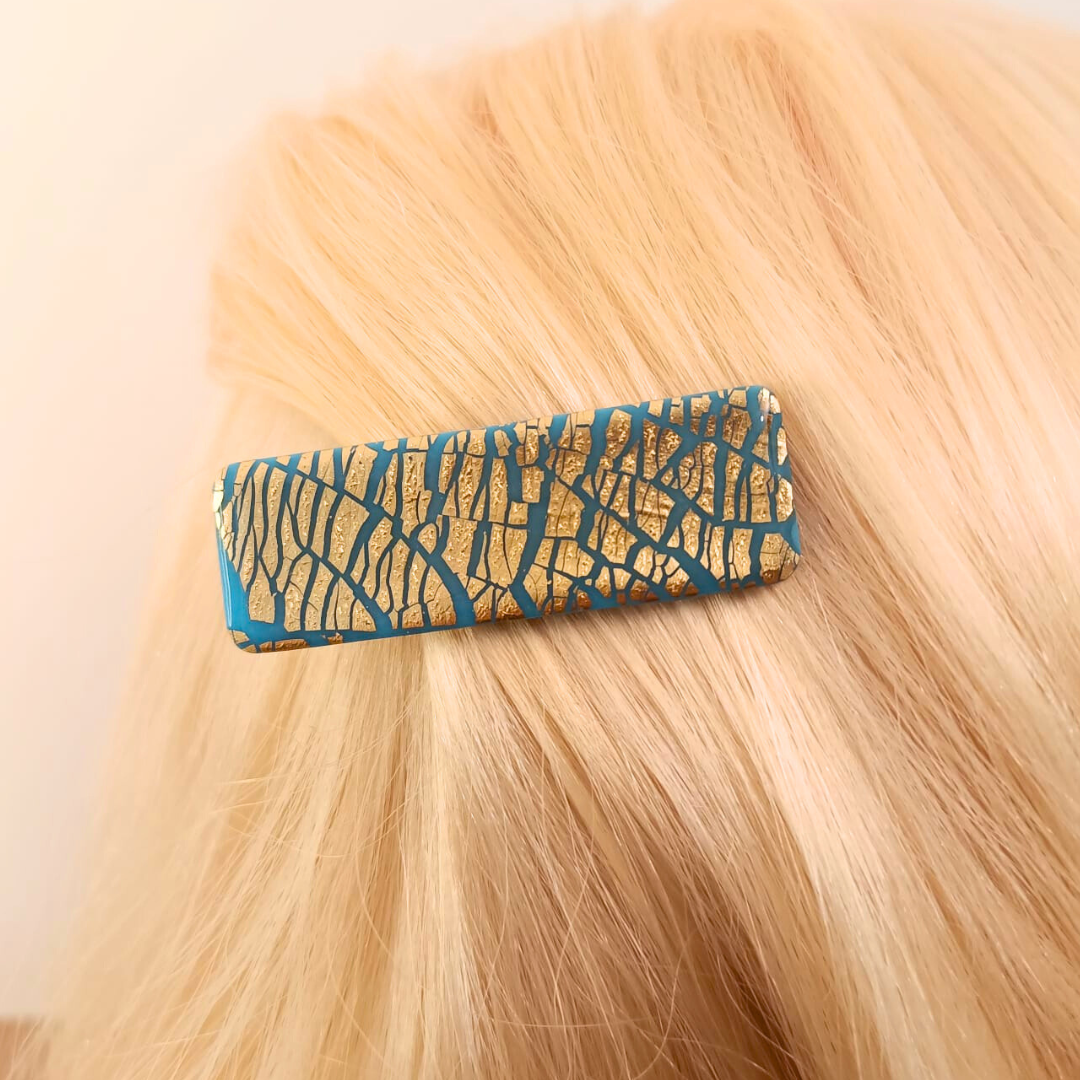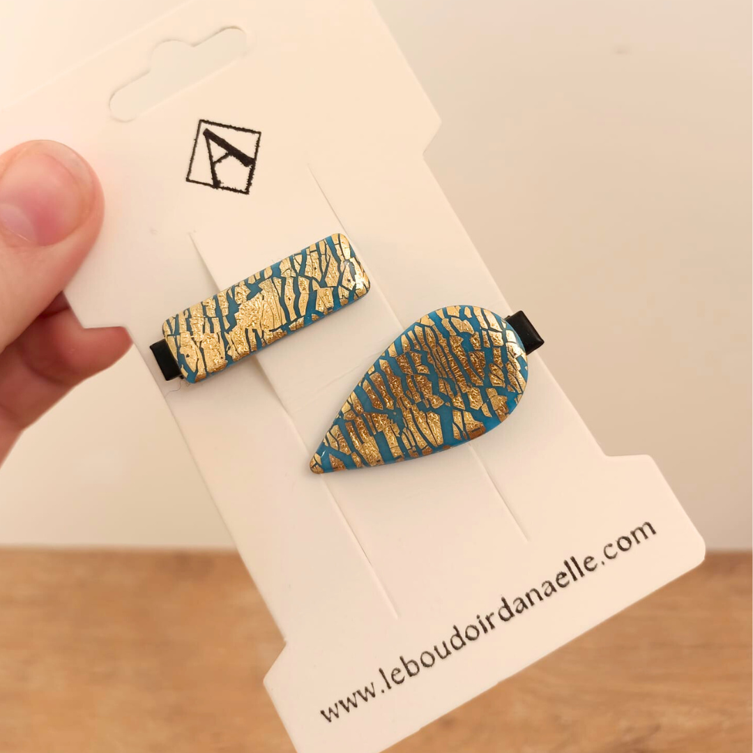 De l’élégance et du style pour la barrette Louise (bleu et doré). Réalisée à la main en pâte polymère et feuille d’or pour un modèle unique.