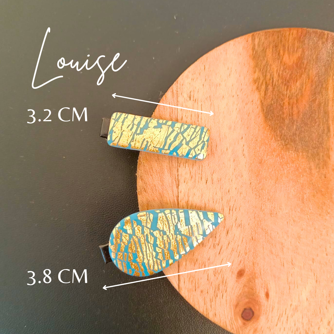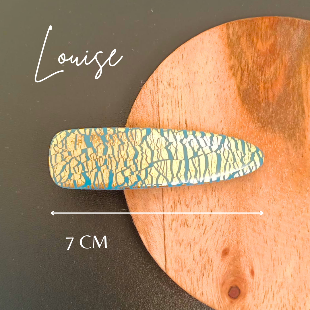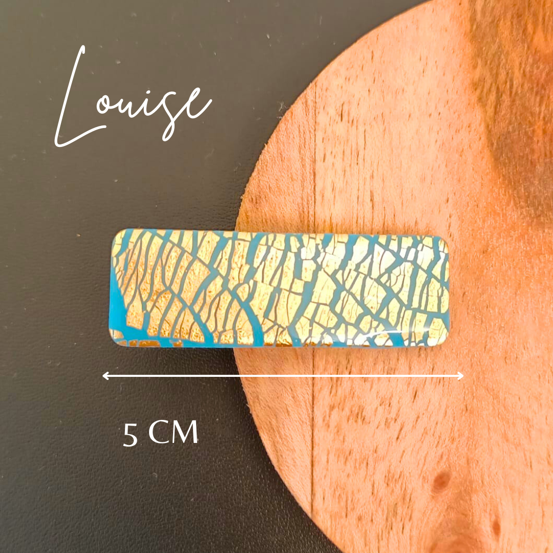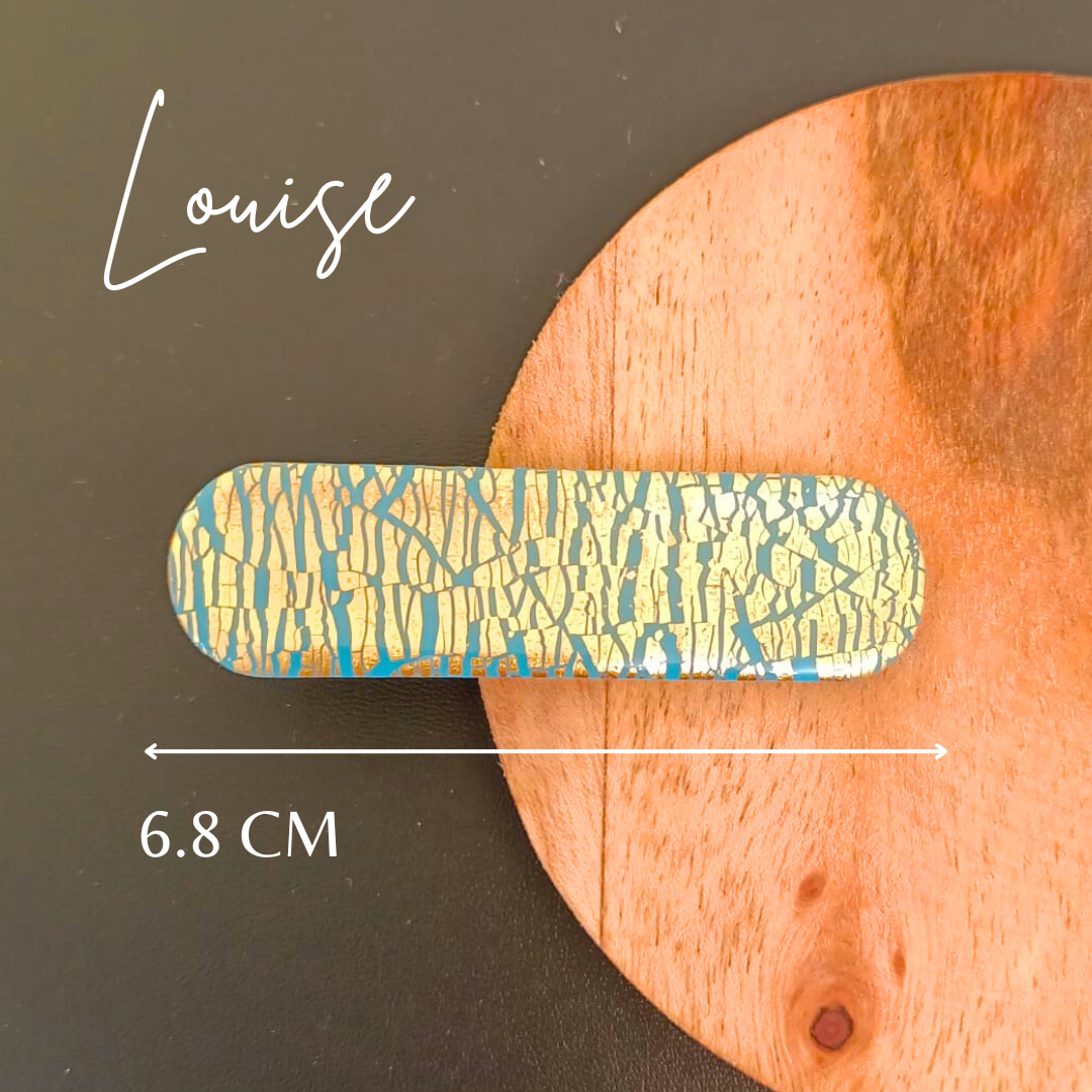 De l’élégance et du style pour la barrette Louise (bleu et doré). Réalisée à la main en pâte polymère et feuille d’or pour un modèle unique.