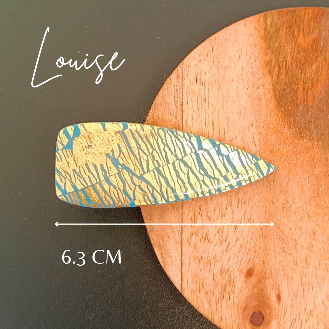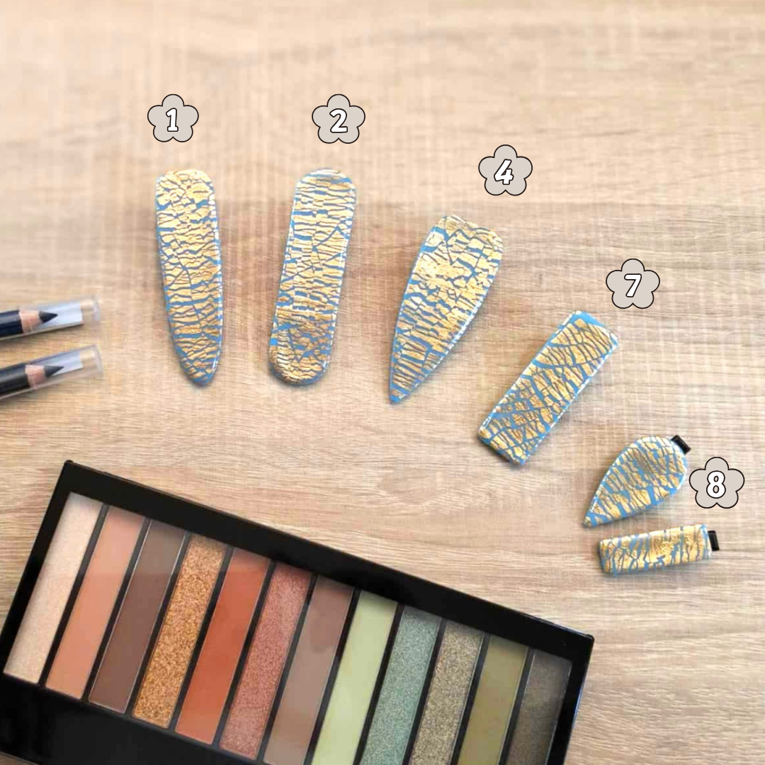 Chaque barrette est méticuleusement façonnée à la main avec passion et nous apportons une attention particulière à chaque détail. La pâte polymère, malléable et versatile, est sculptée avec précision pour créer des formes élégantes et des motifs uniques, reflétant ainsi une créativité sans bornes. Chaque courbe, chaque contour est soigneusement travaillé pour obtenir un résultat final impeccable.