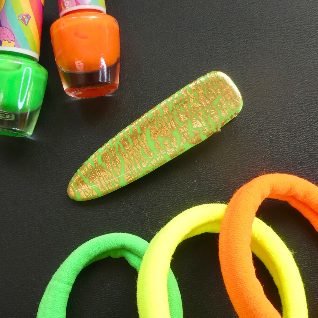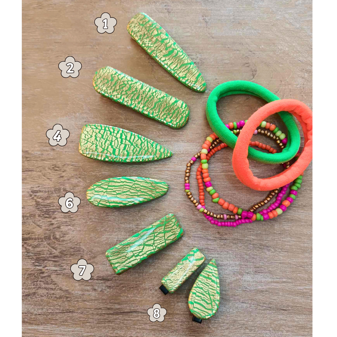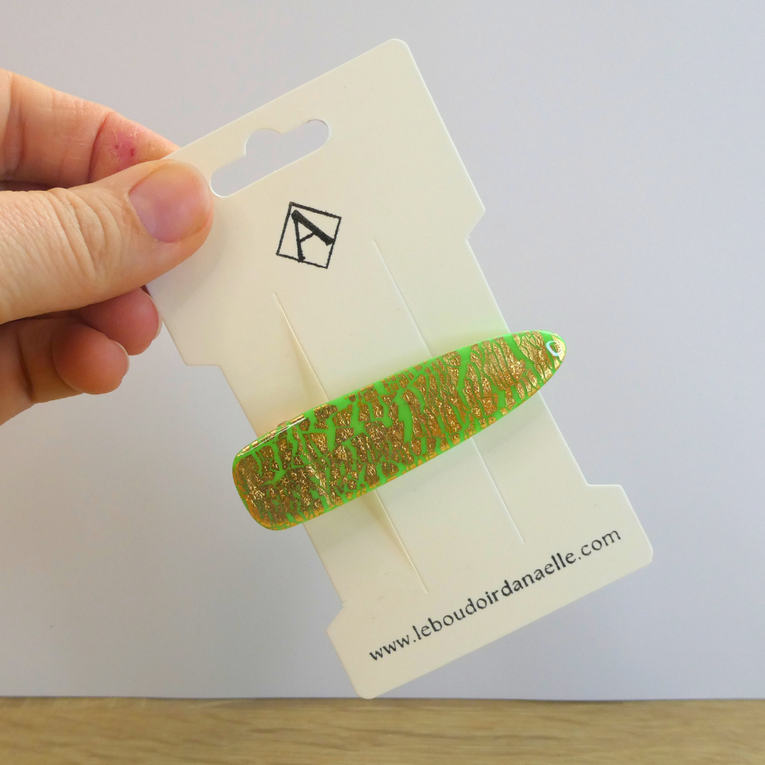 De l’élégance et du style pour la barrette Louise (vert et doré). Réalisée à la main en pâte polymère et feuille d’or pour un modèle unique.