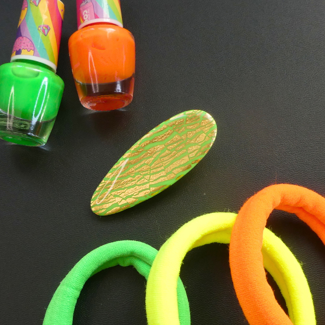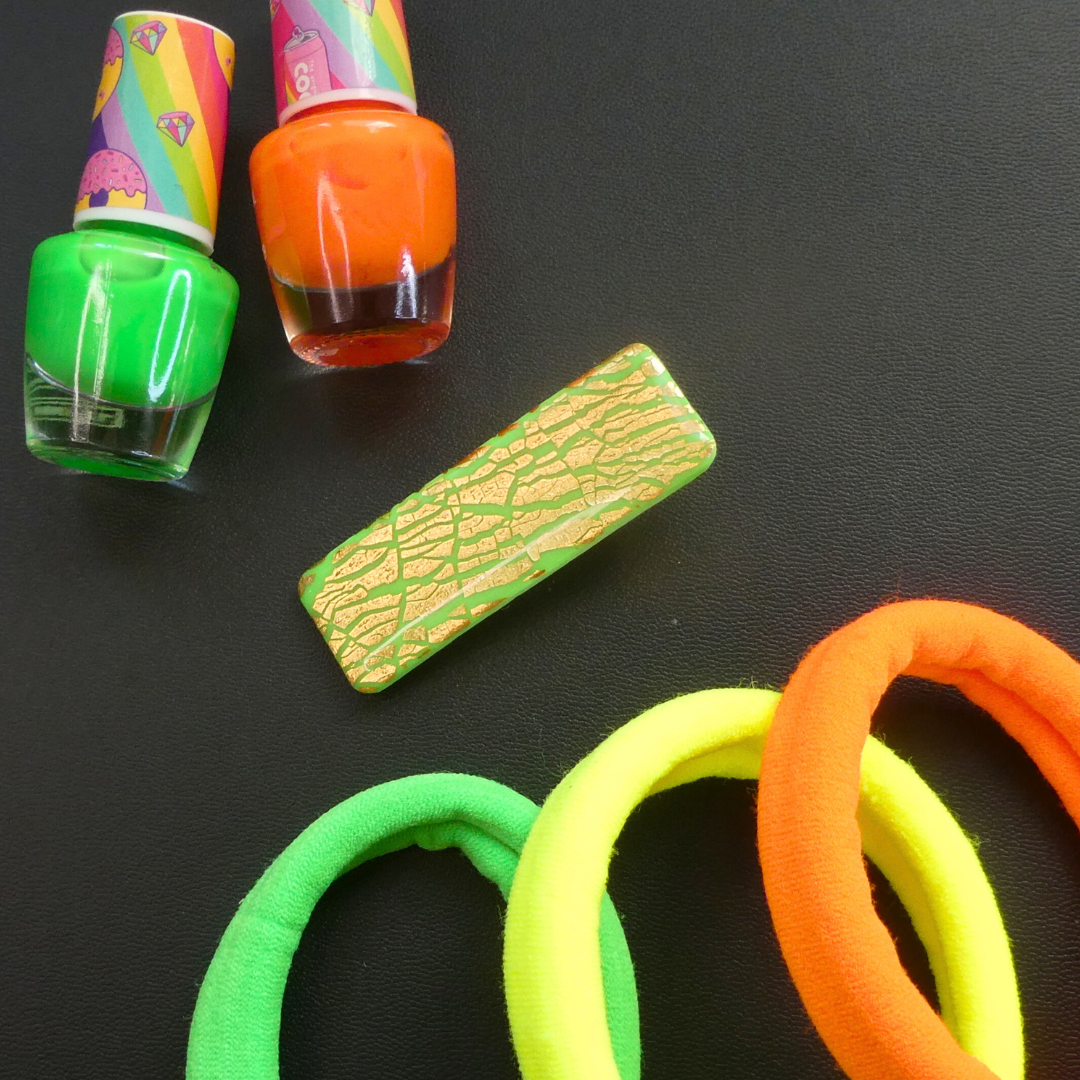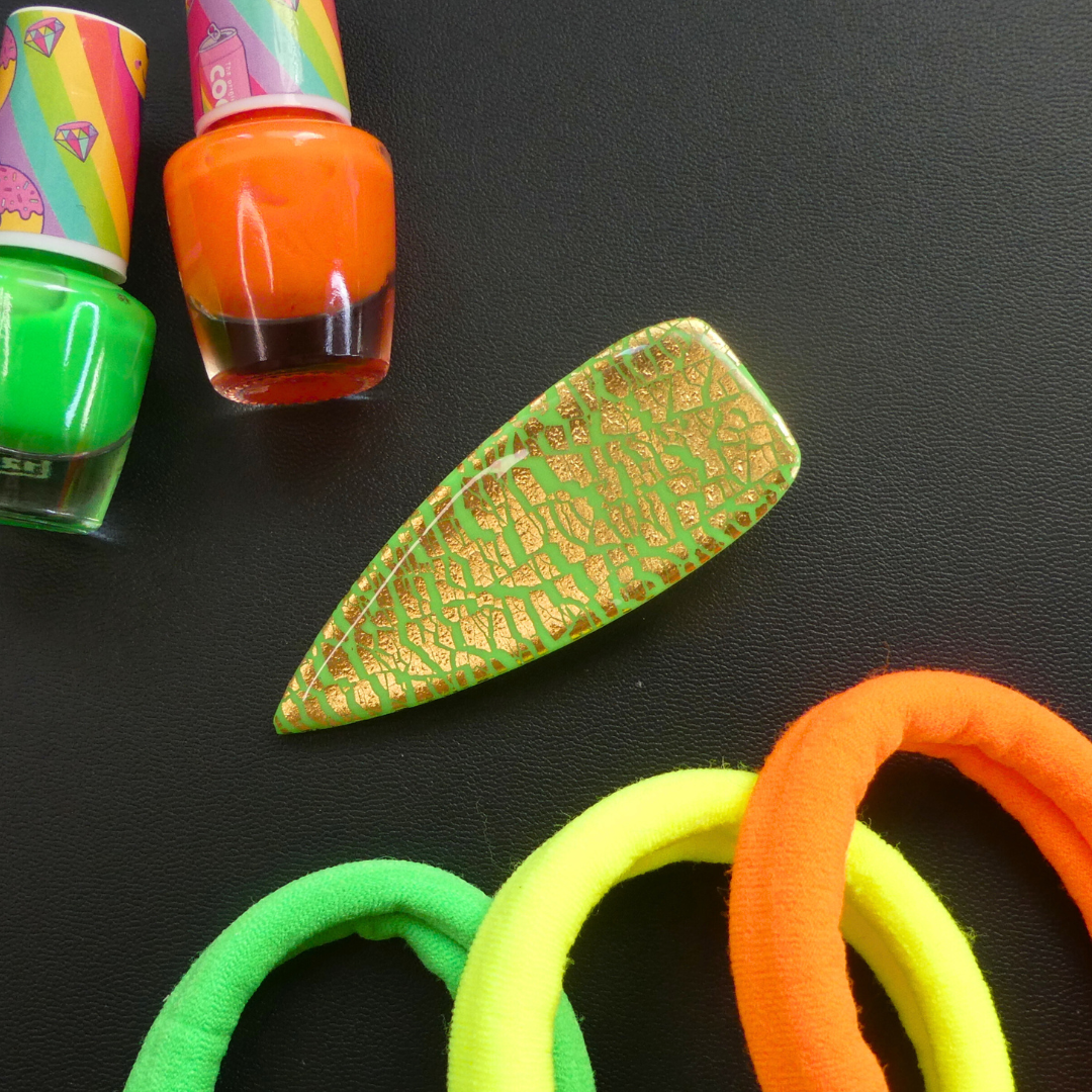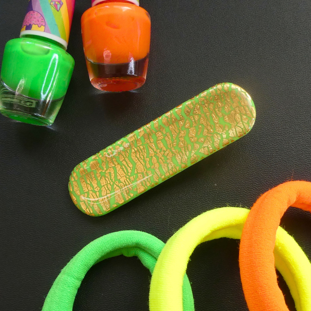 De l’élégance et du style pour la barrette Louise (vert et doré). Réalisée à la main en pâte polymère et feuille d’or pour un modèle unique.
