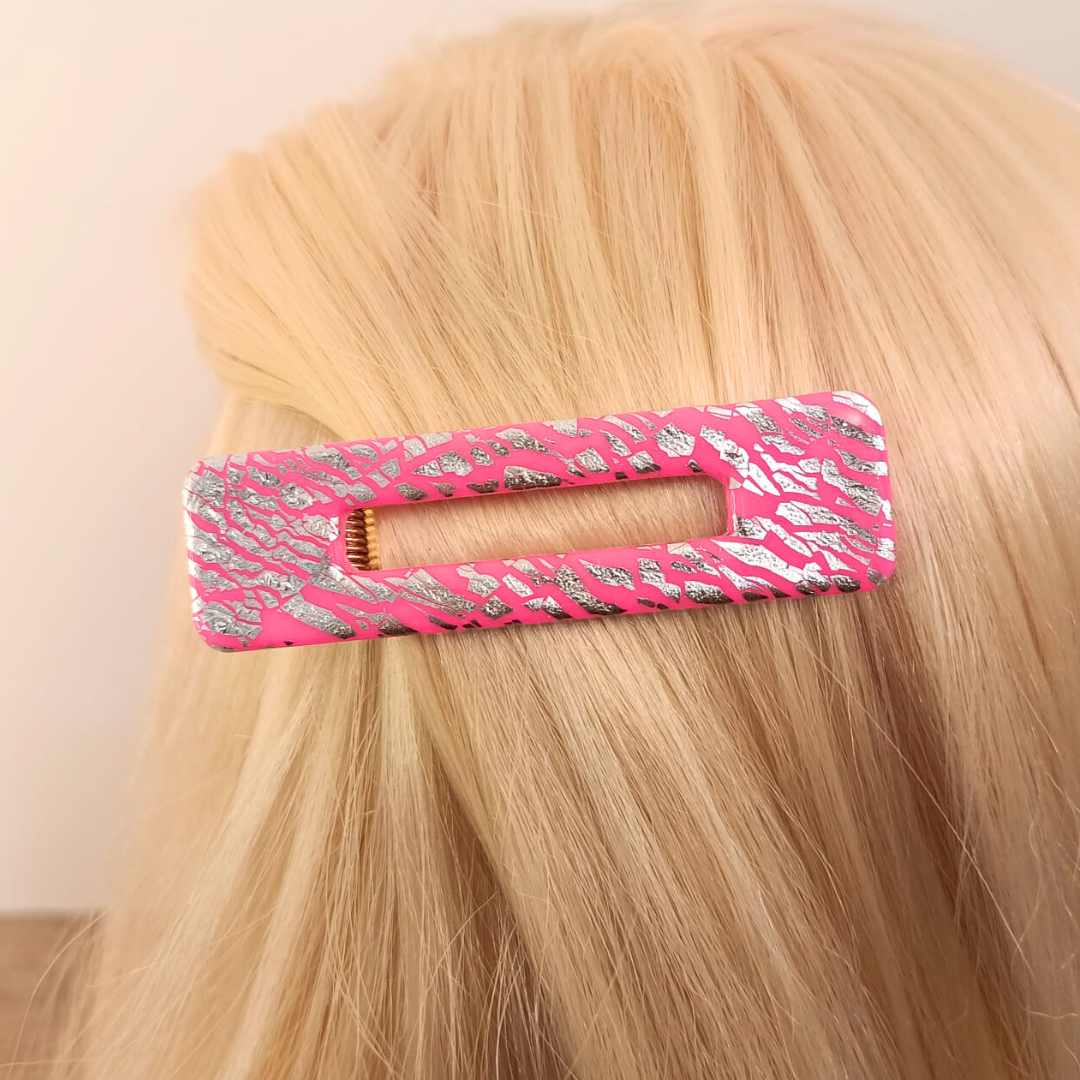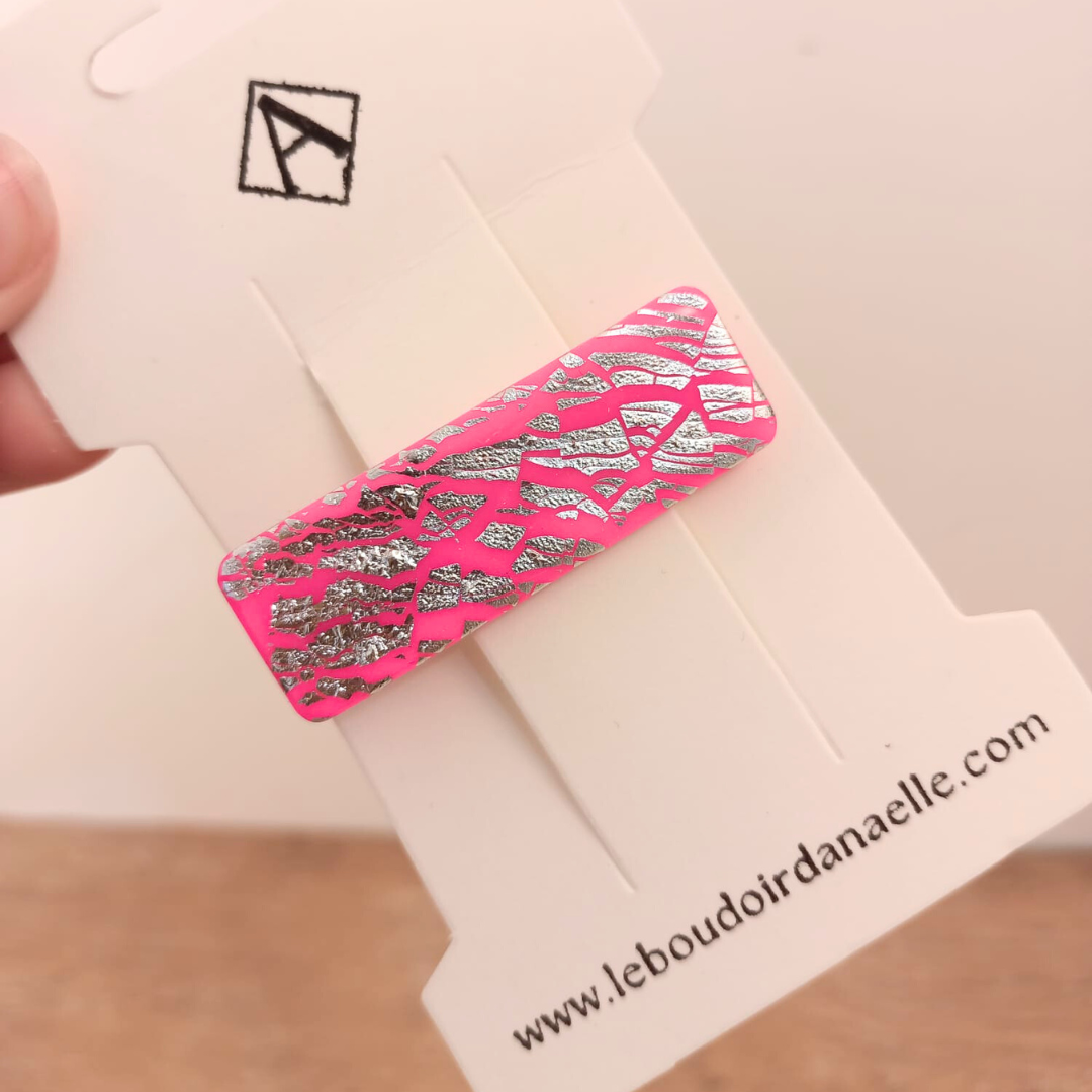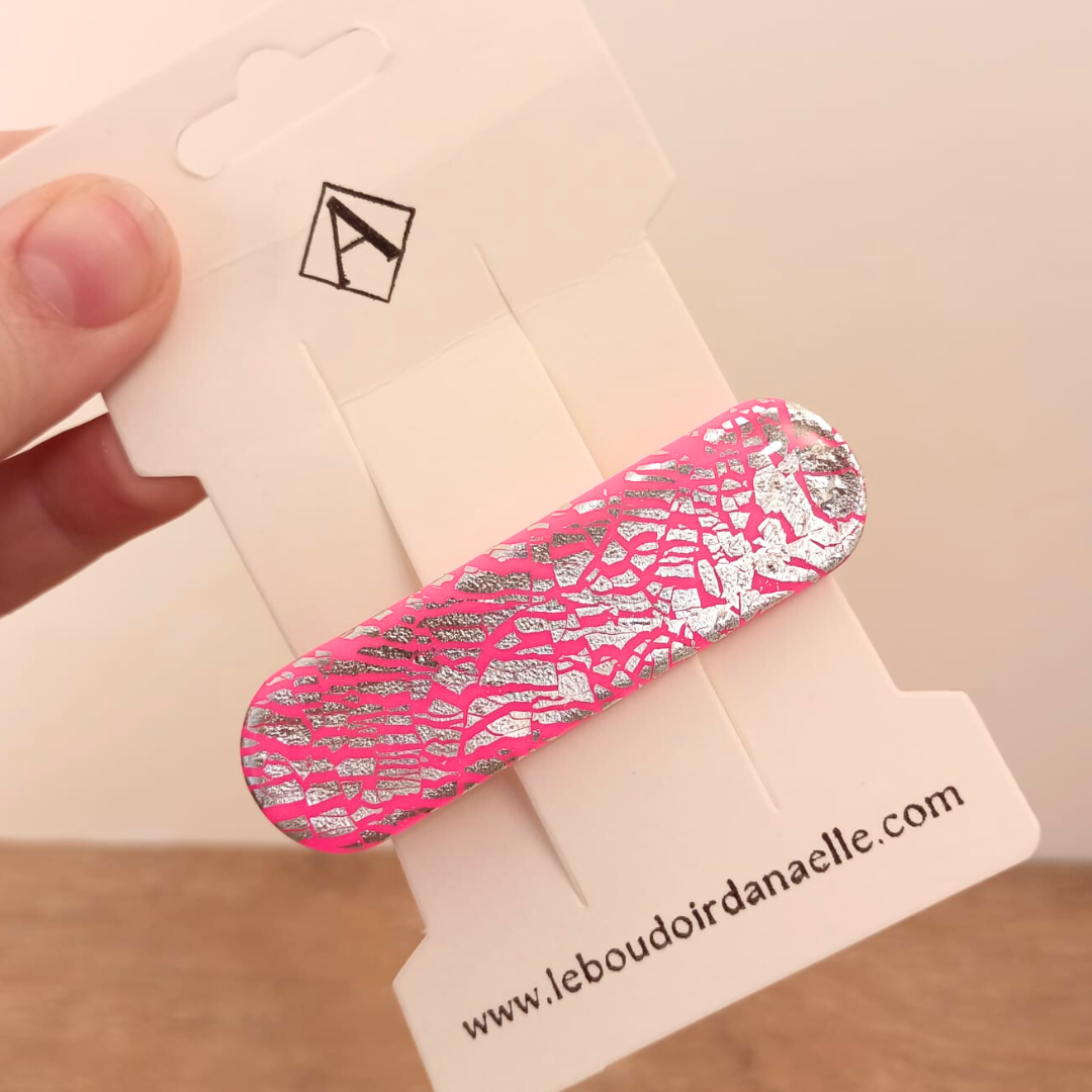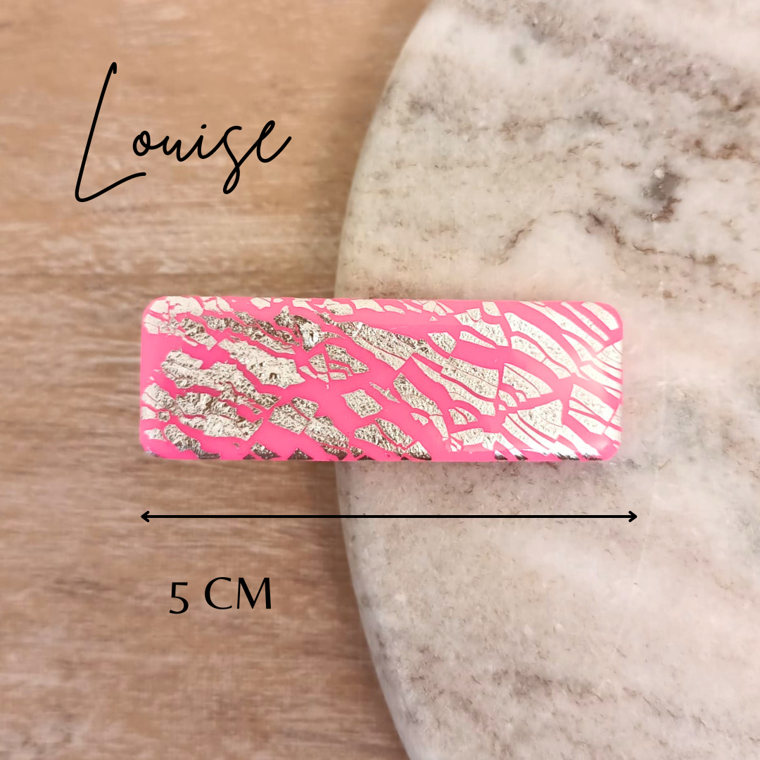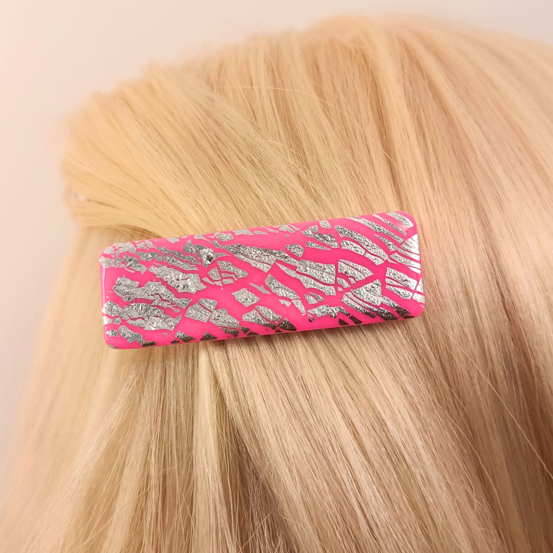 De l’élégance et du style pour la barrette Louise (rose et argenté). Réalisée à la main en pâte polymère et feuille argentée pour un modèle unique.