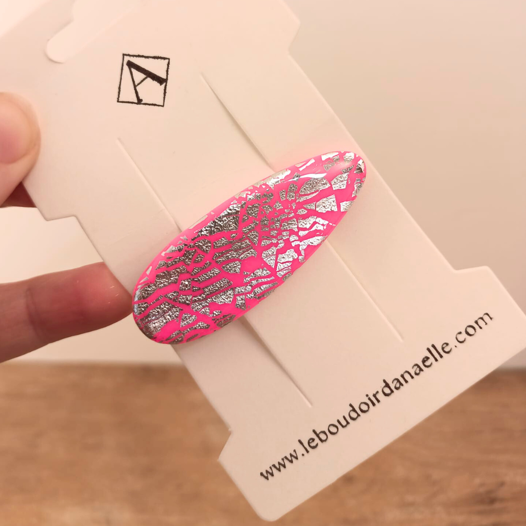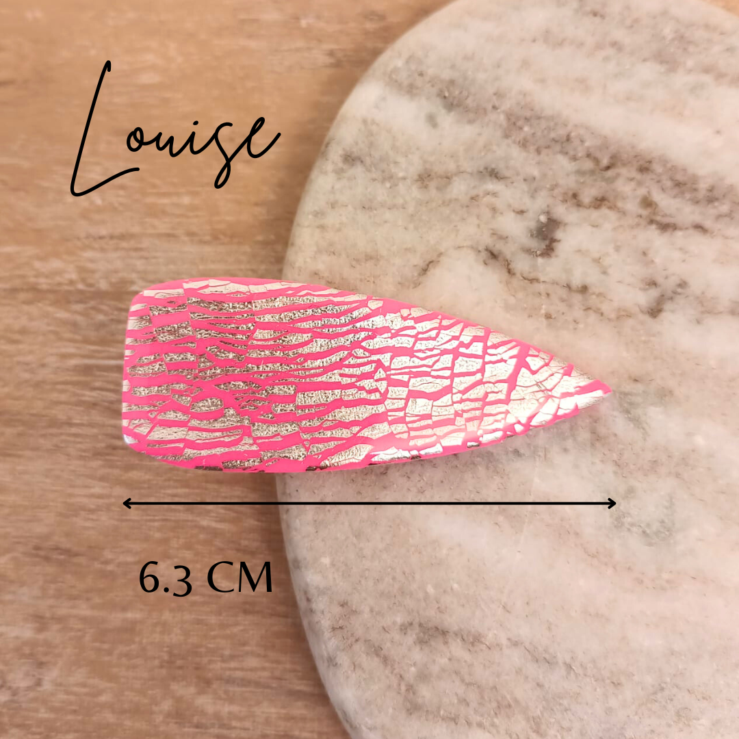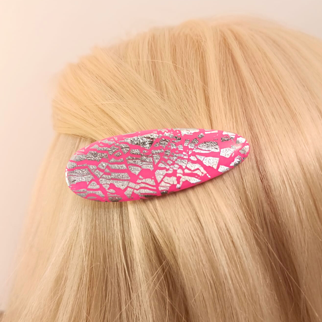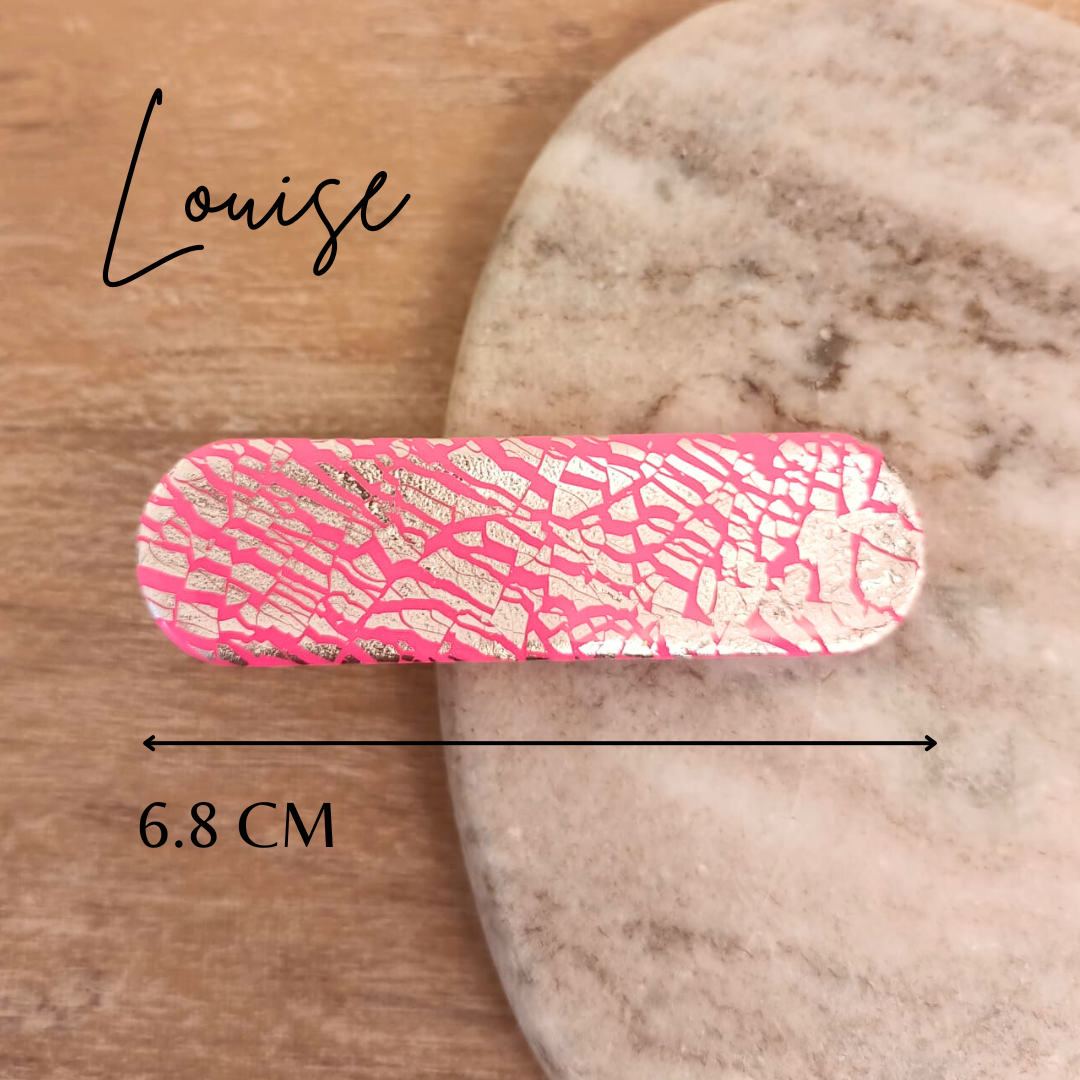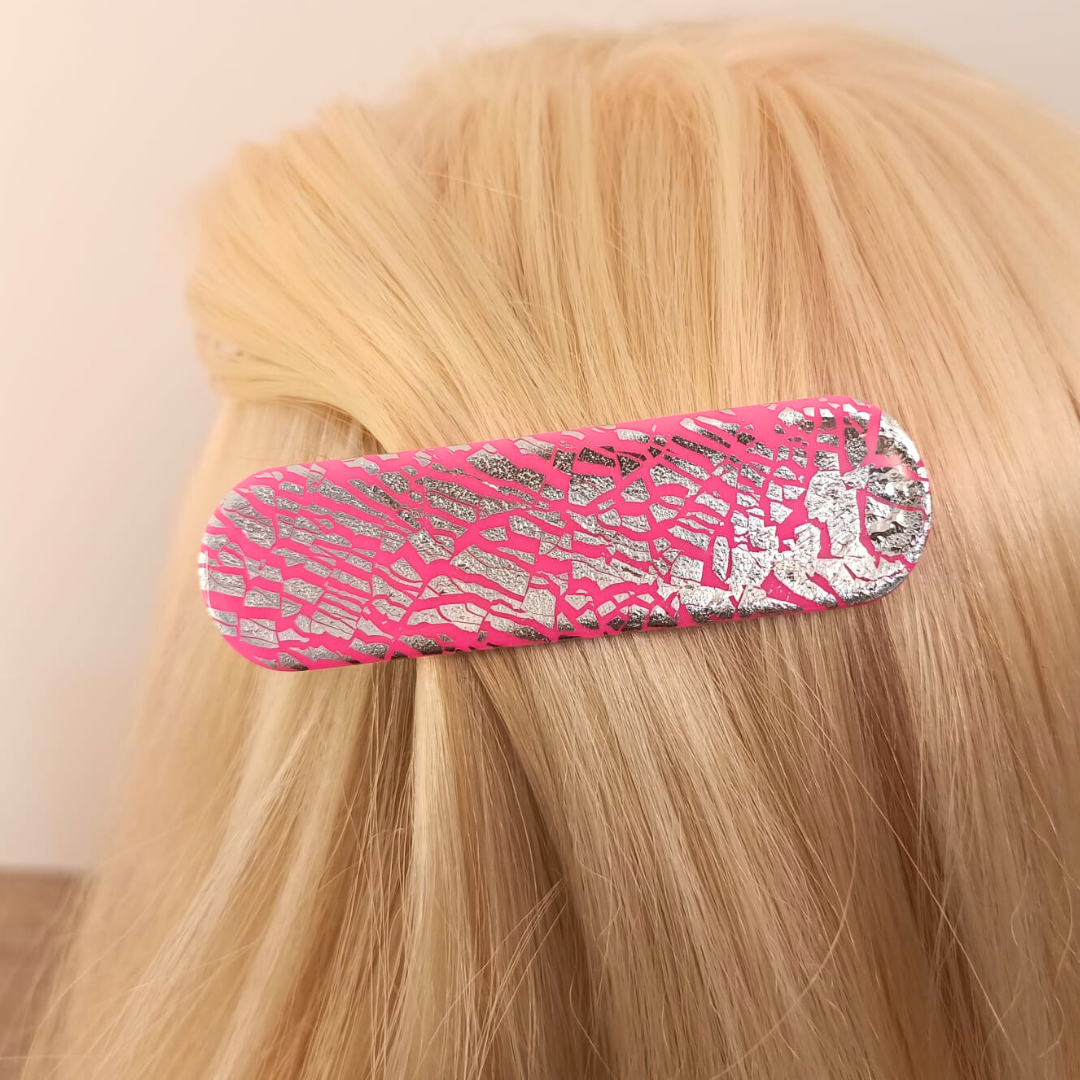 De l’élégance et du style pour la barrette Louise (rose et argenté). Réalisée à la main en pâte polymère et feuille argentée pour un modèle unique.