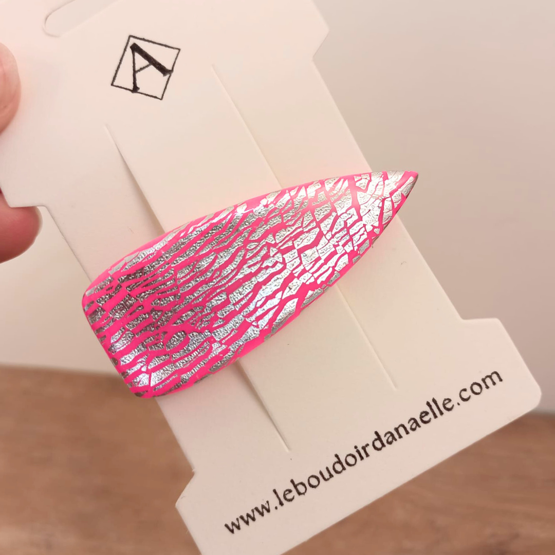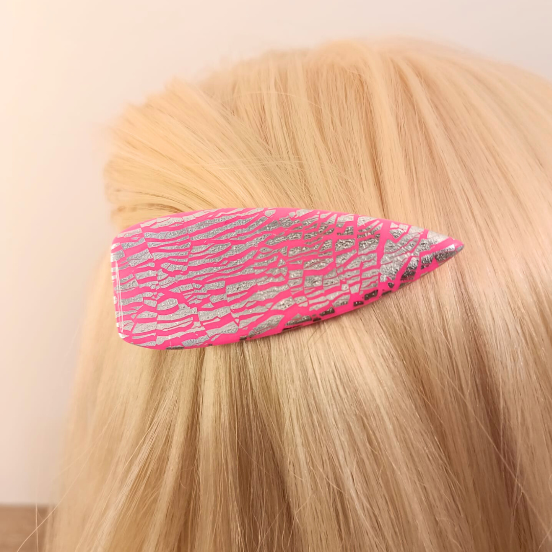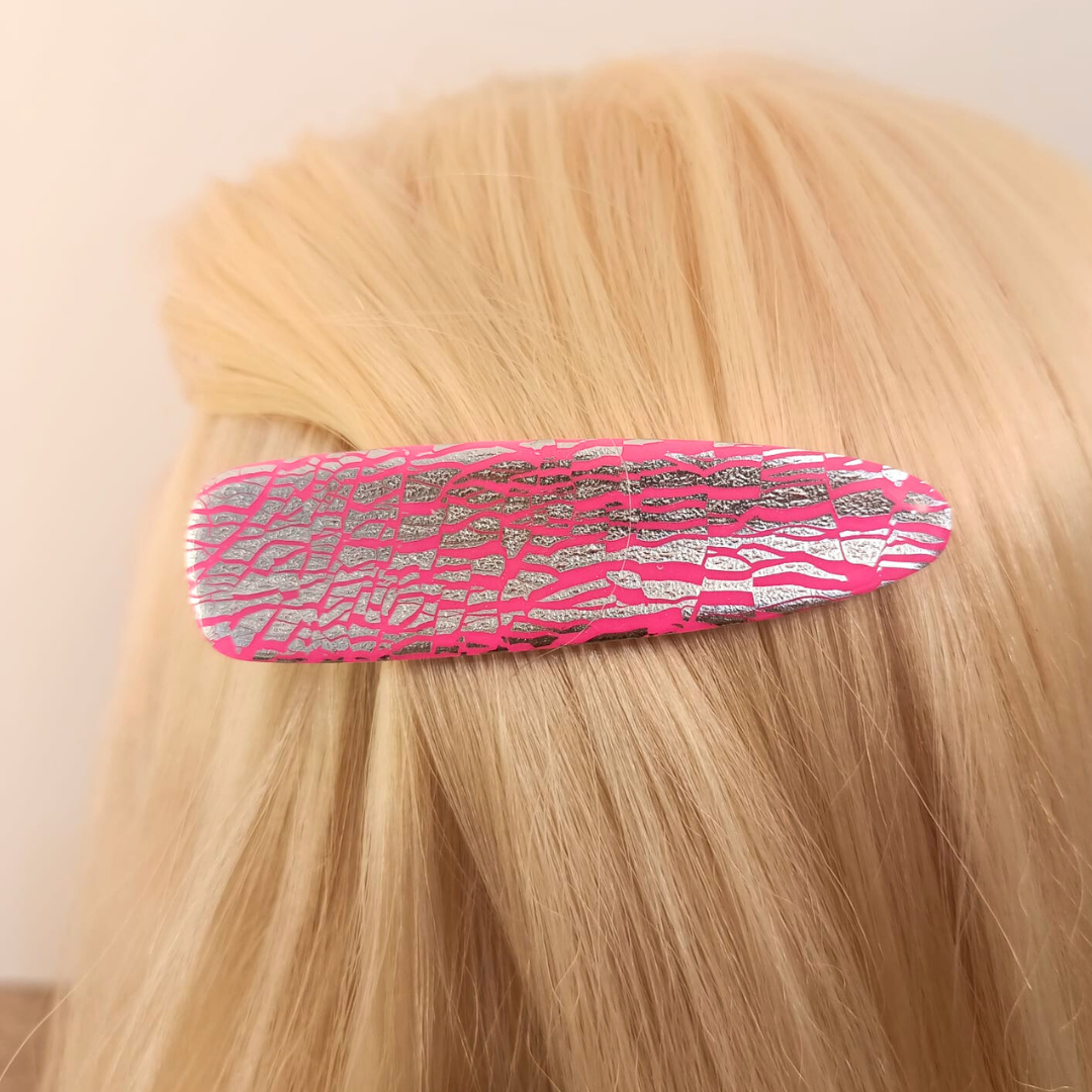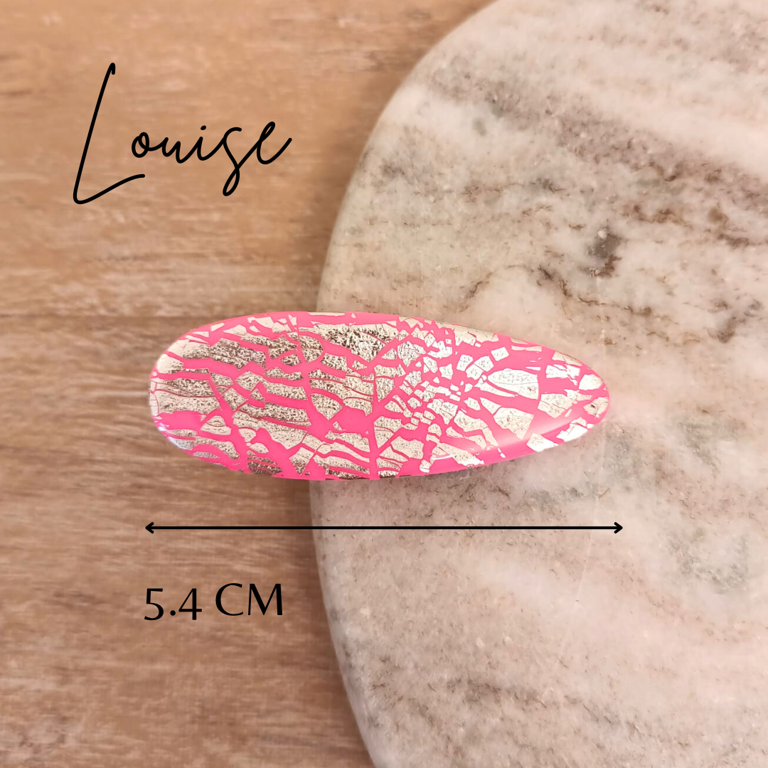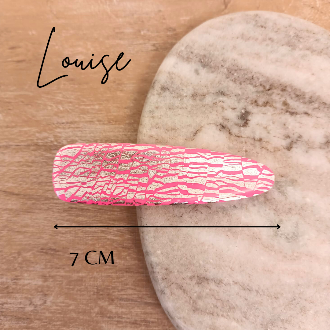 De l’élégance et du style pour la barrette Louise (rose et argenté). Réalisée à la main en pâte polymère et feuille argentée pour un modèle unique.