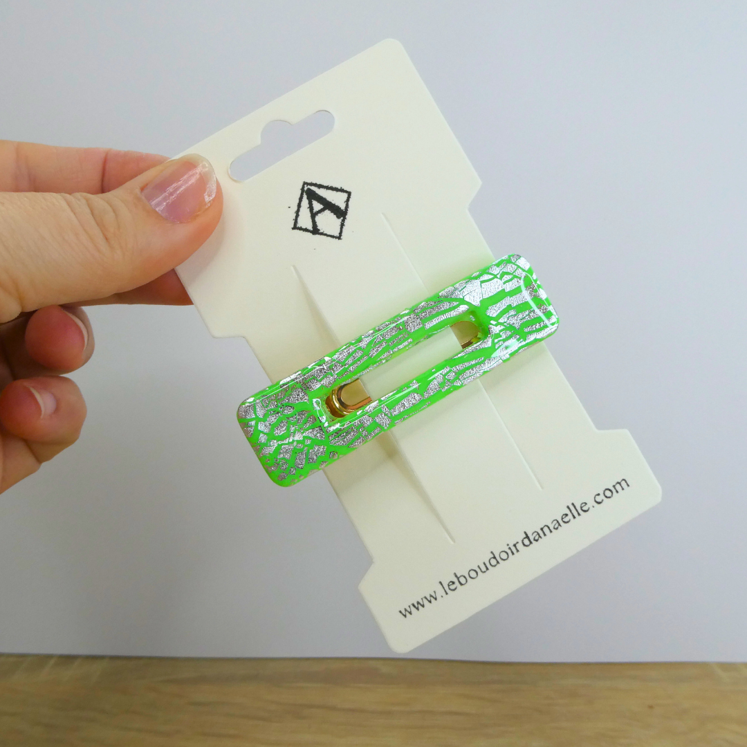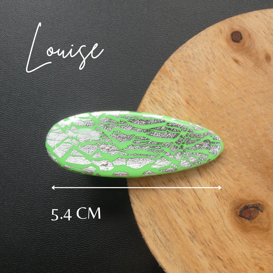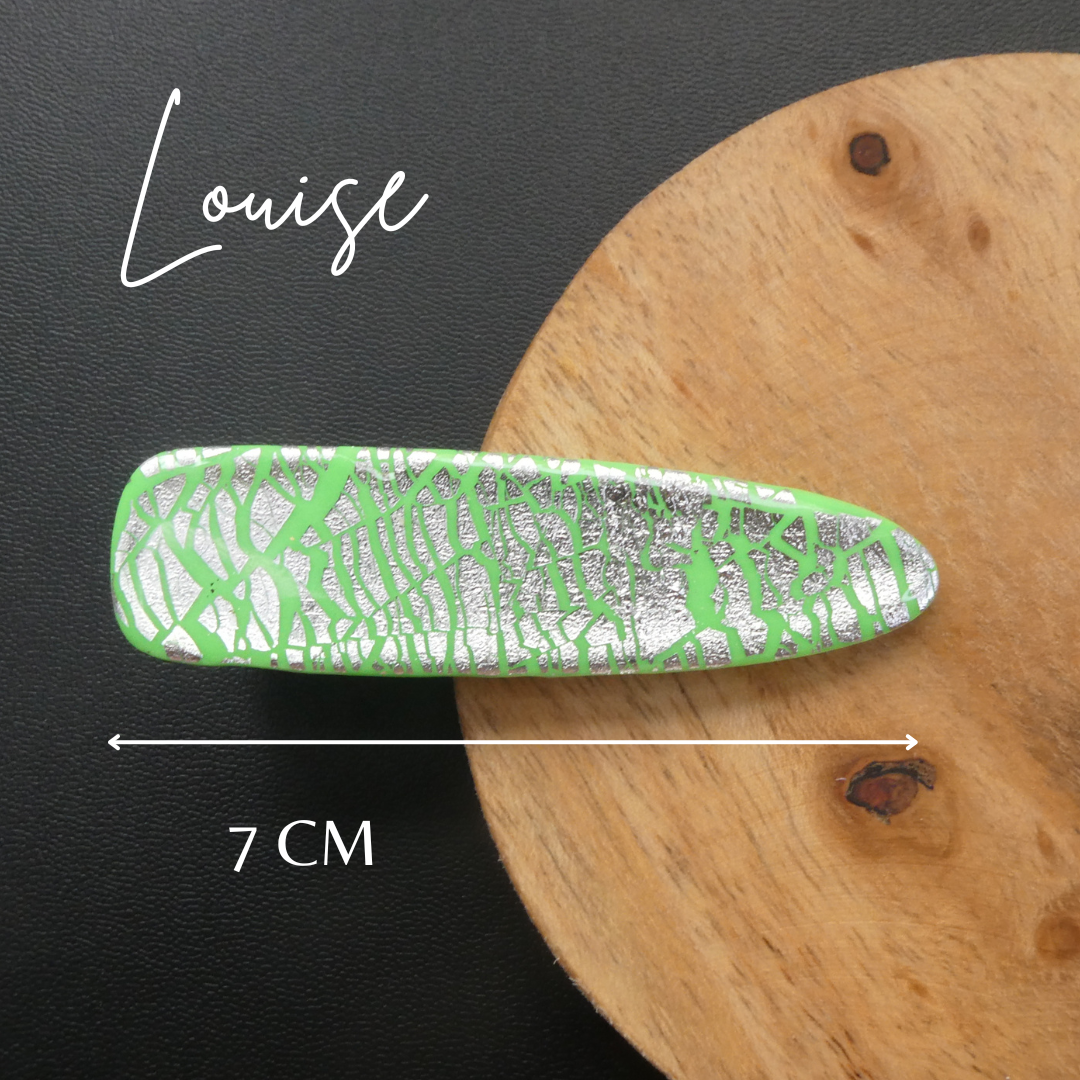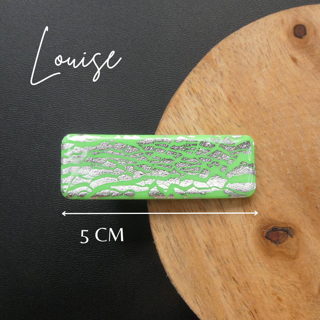 Plongez dans un monde de sophistication et d’élégance avec cette création artisanale. Cette barrette exquise est le fruit d’un mariage harmonieux entre la délicatesse de la pâte polymère et l’éclat somptueux des feuilles argentées. Conçue avec amour et minutie, chaque pièce incarne l’essence de l’artisanat traditionnel, alliant savoir-faire ancien et esthétique contemporaine.