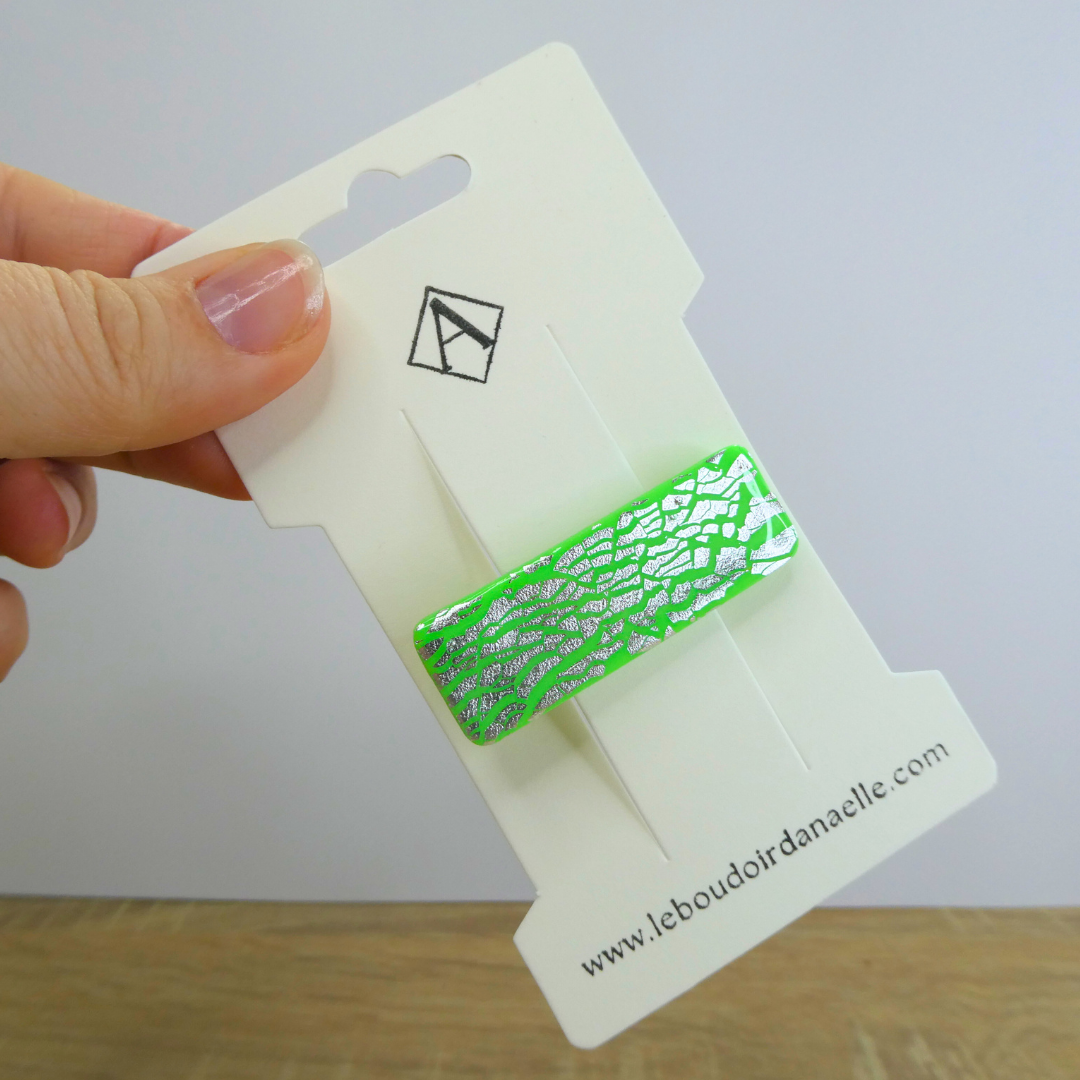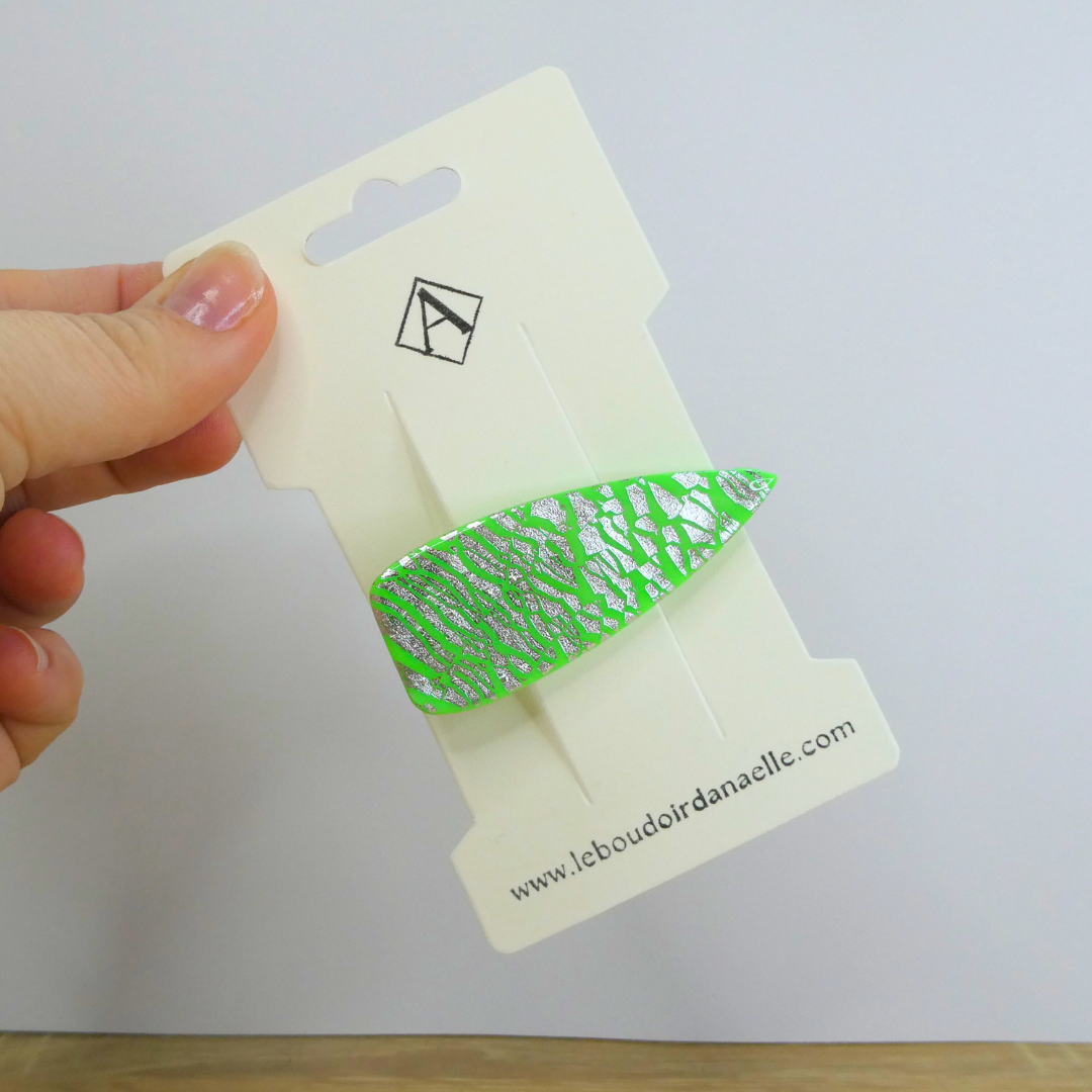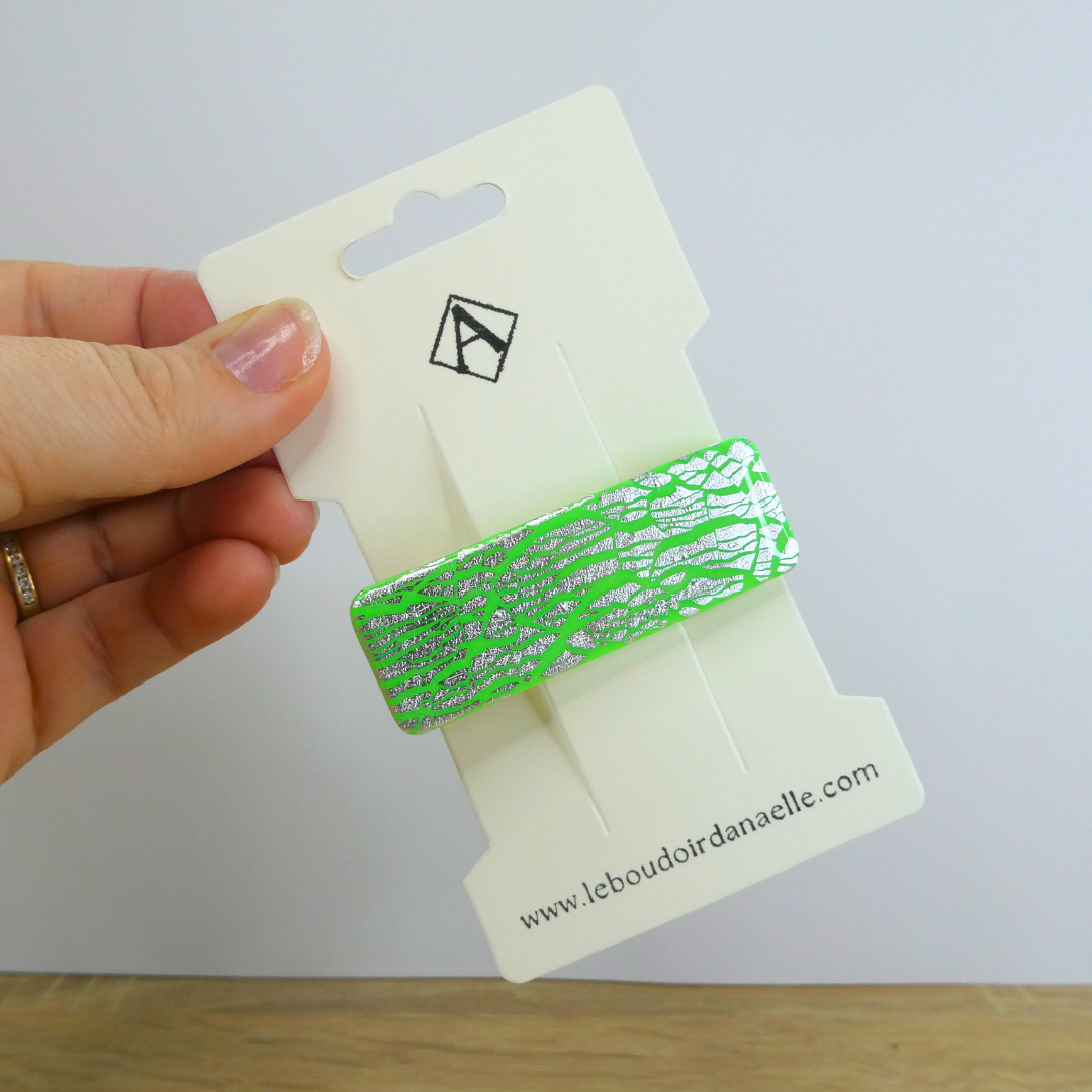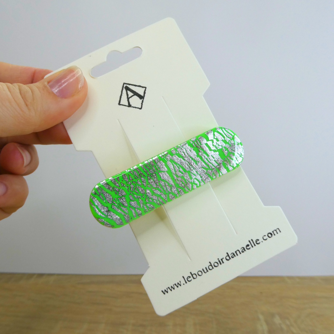 Plongez dans un monde de sophistication et d’élégance avec cette création artisanale. Cette barrette exquise est le fruit d’un mariage harmonieux entre la délicatesse de la pâte polymère et l’éclat somptueux des feuilles argentées. Conçue avec amour et minutie, chaque pièce incarne l’essence de l’artisanat traditionnel, alliant savoir-faire ancien et esthétique contemporaine.