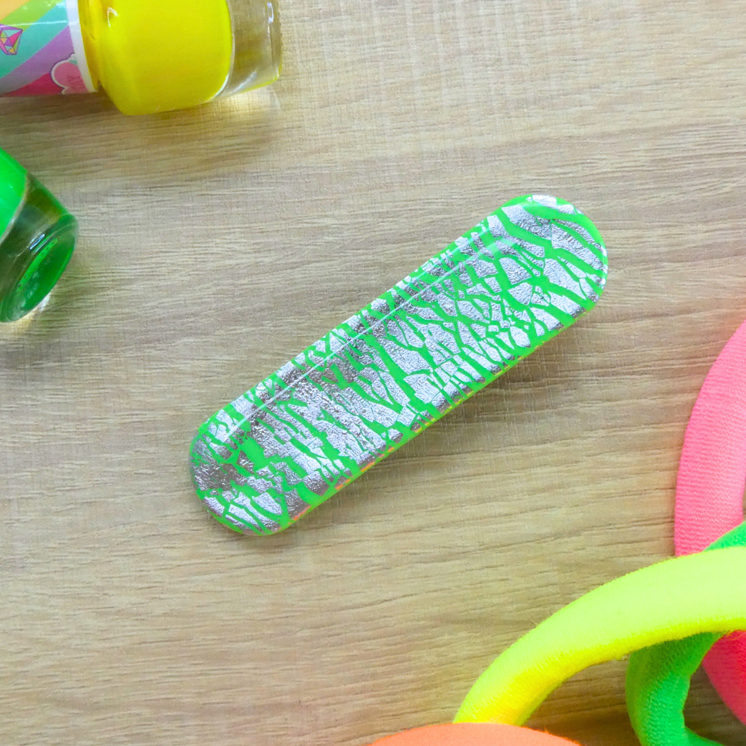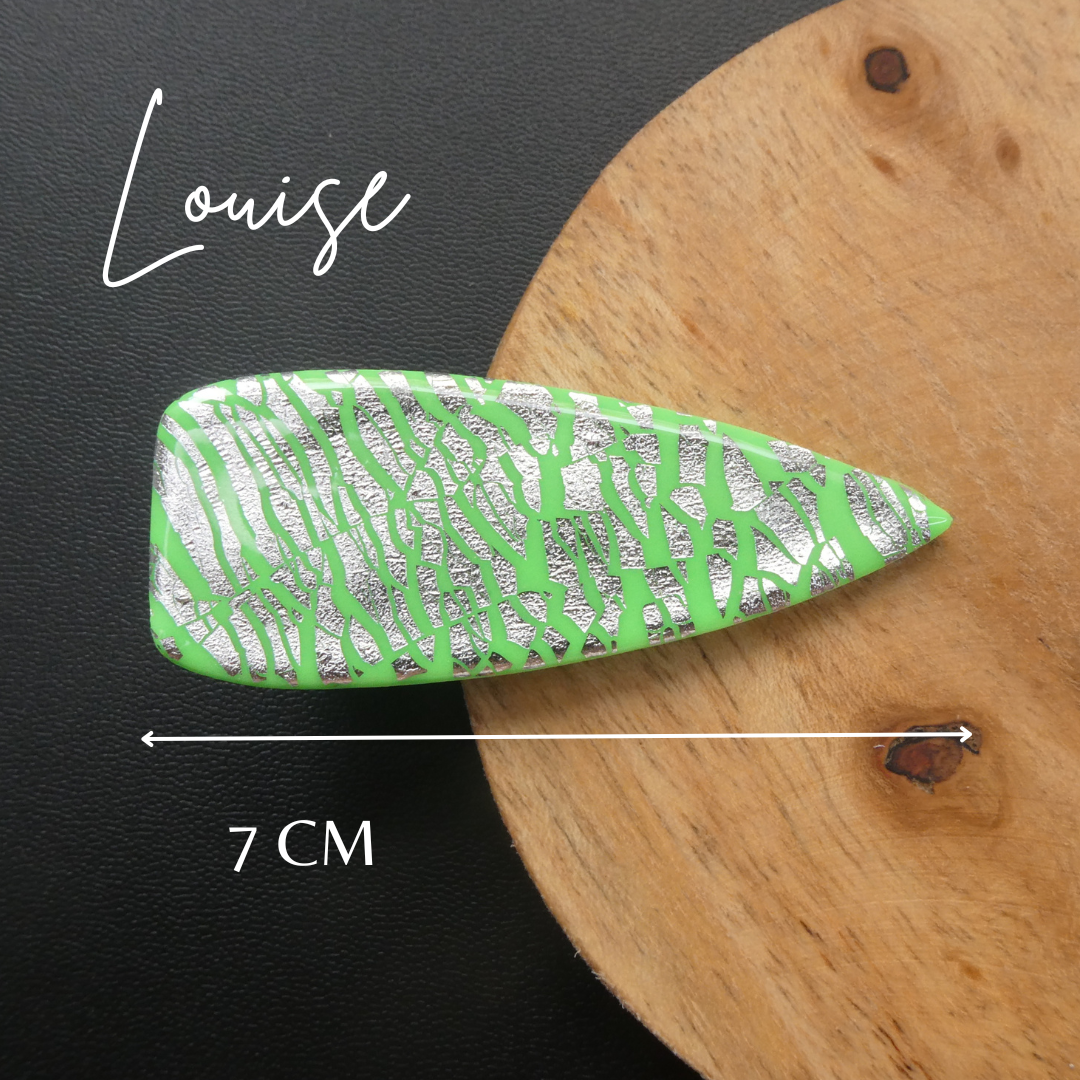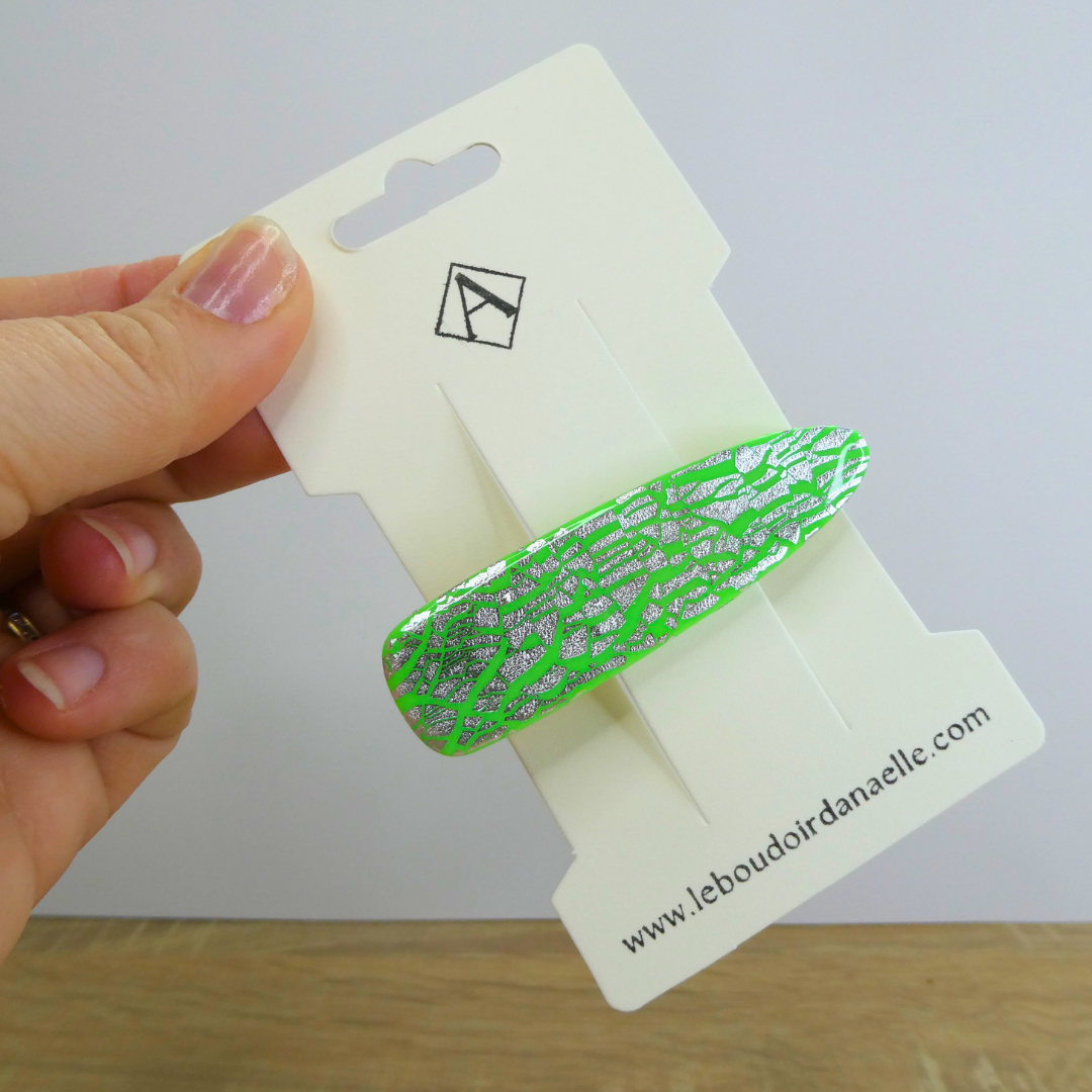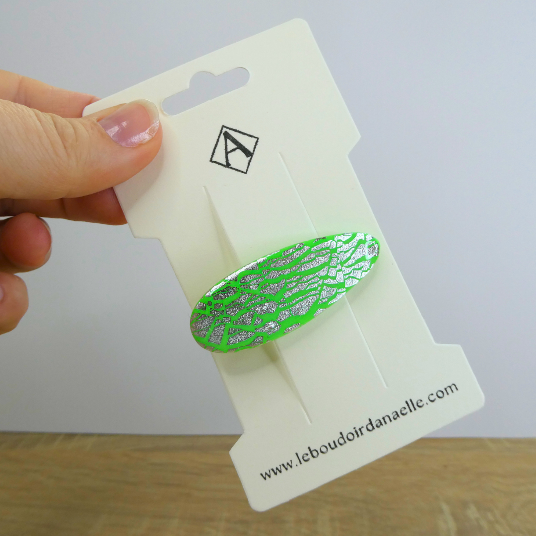 Plongez dans un monde de sophistication et d’élégance avec cette création artisanale. Cette barrette exquise est le fruit d’un mariage harmonieux entre la délicatesse de la pâte polymère et l’éclat somptueux des feuilles argentées. Conçue avec amour et minutie, chaque pièce incarne l’essence de l’artisanat traditionnel, alliant savoir-faire ancien et esthétique contemporaine.