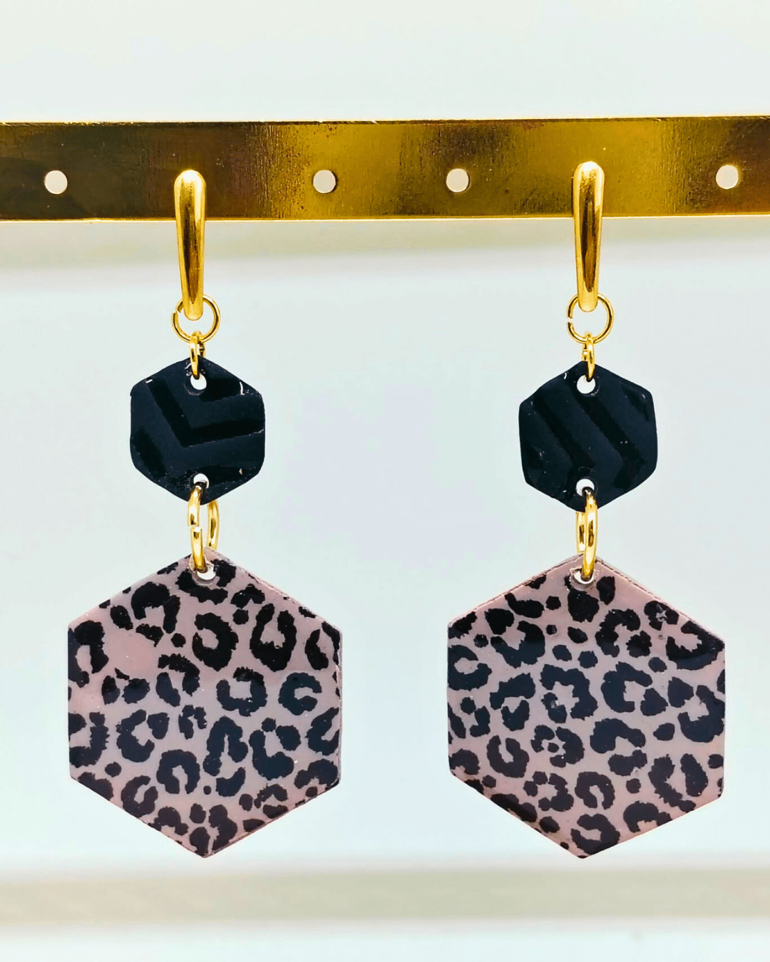 Ces boucles d’oreilles se composent de deux éléments hexagonaux superposés, reliés par des anneaux dorés qui apportent mouvement et légèreté.