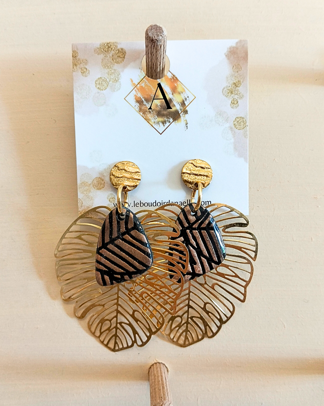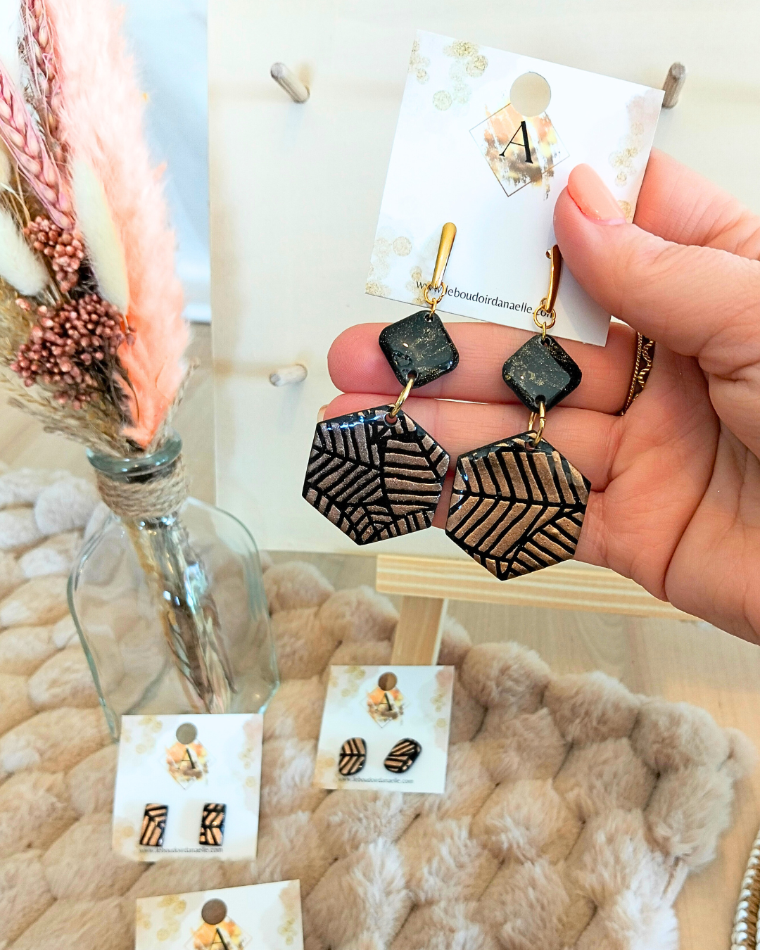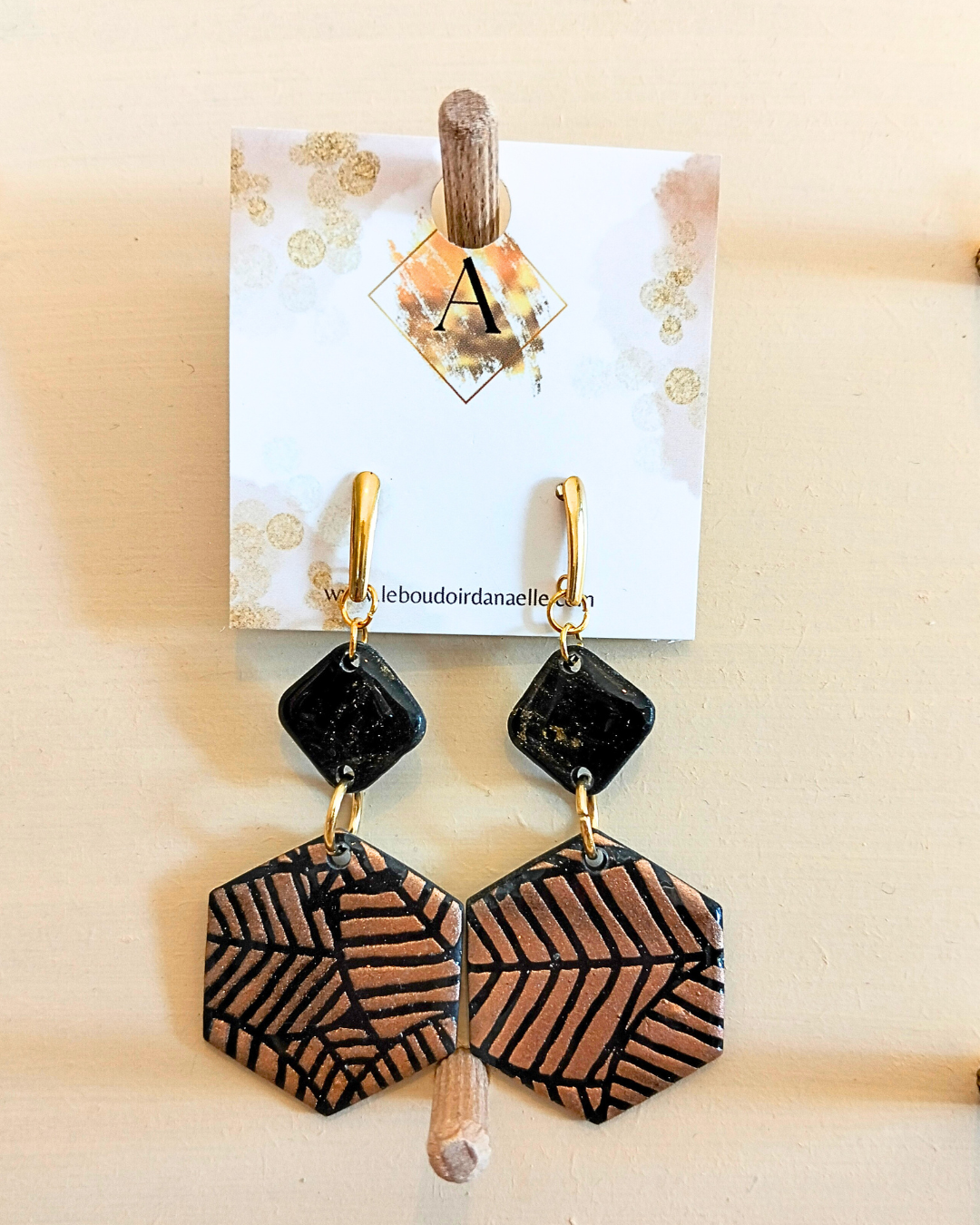 Boucles d’oreilles Margaux : pâte polymère noire et motif doré