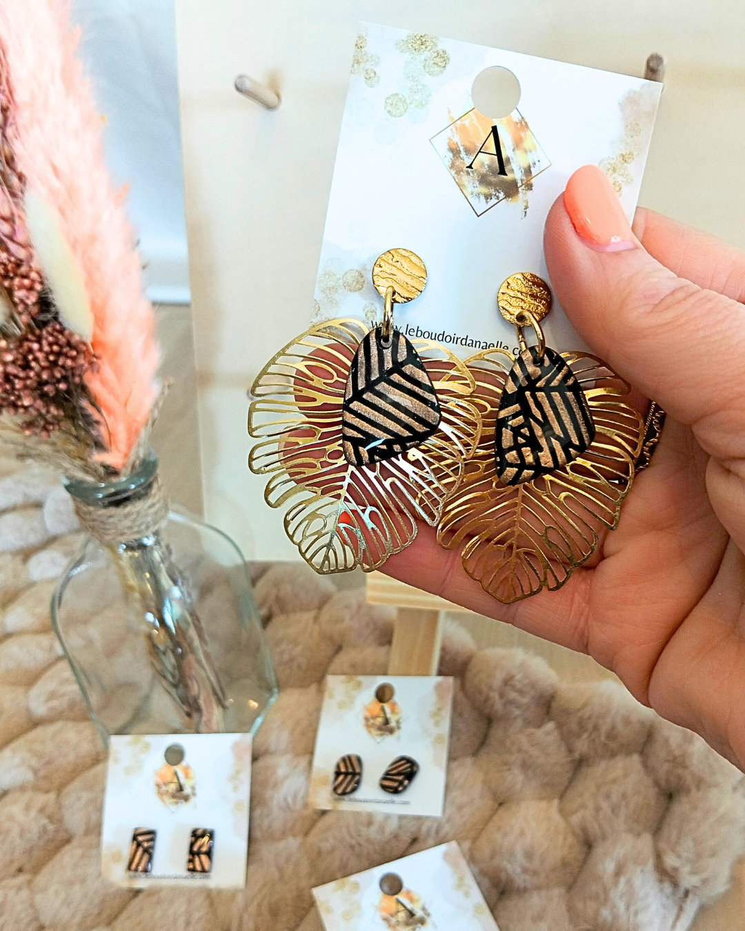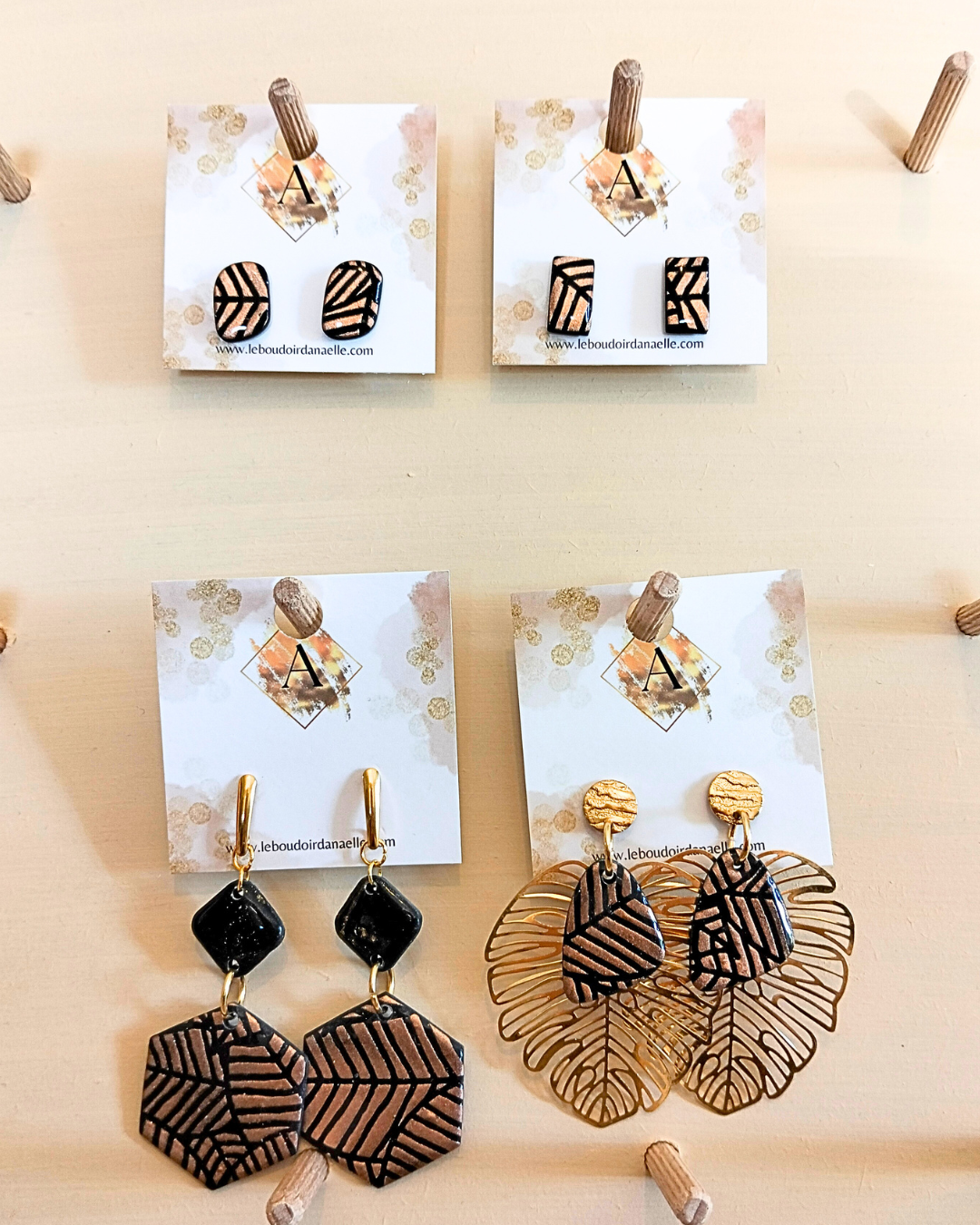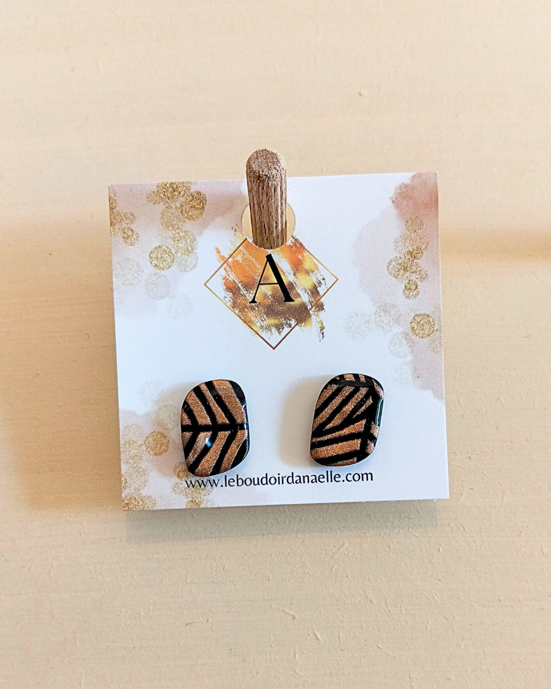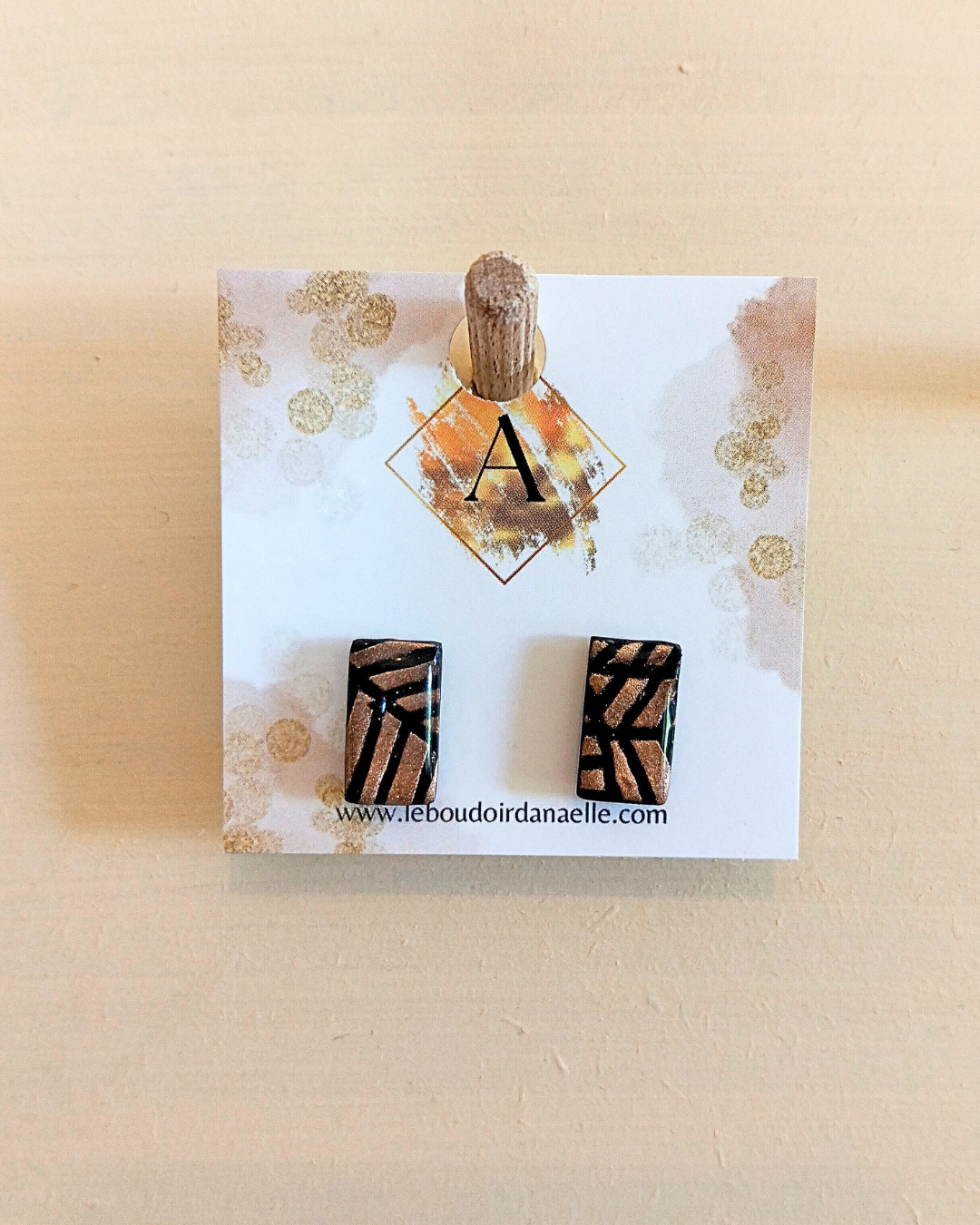 Boucles d’oreilles Margaux : pâte polymère noire et motif doré
