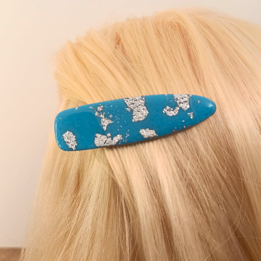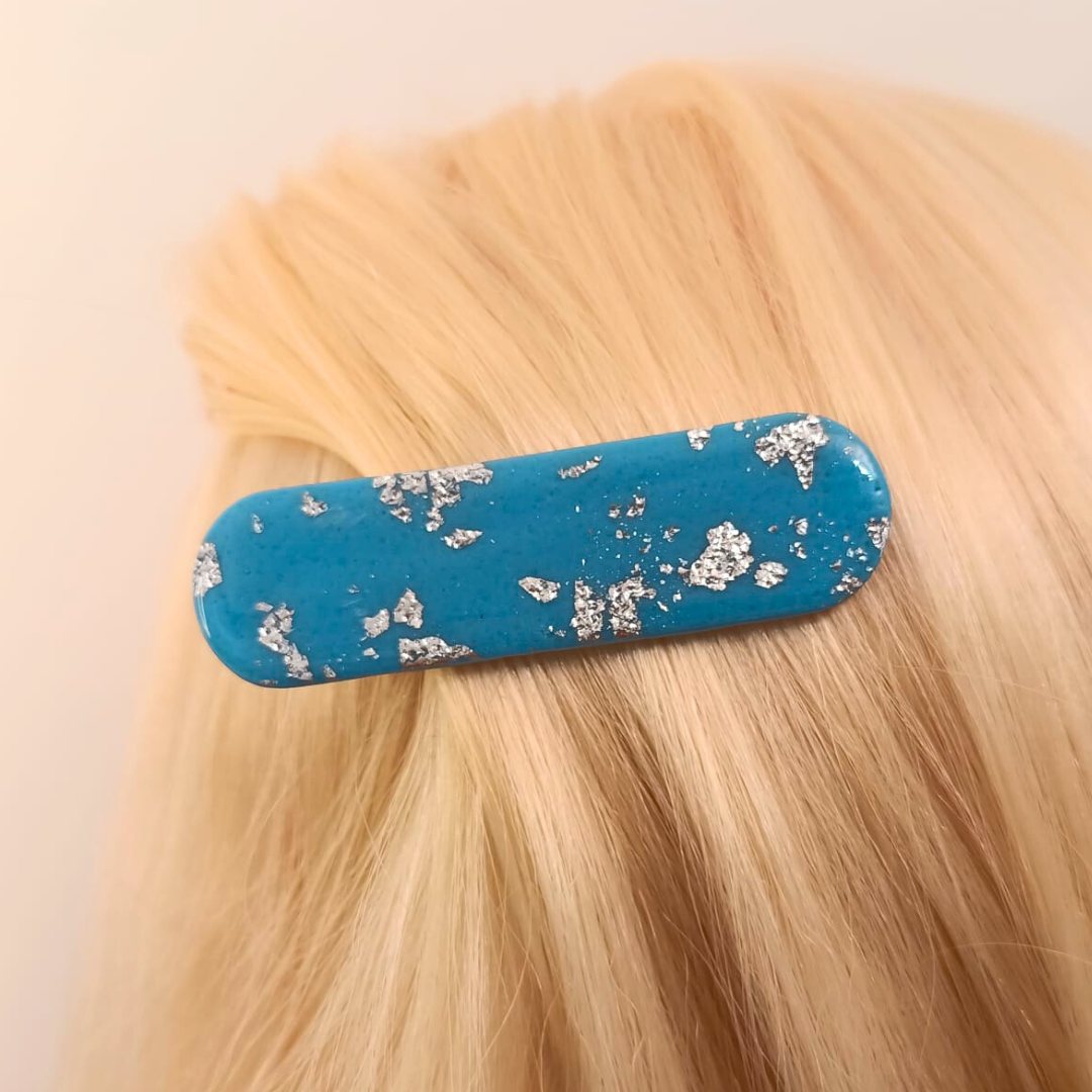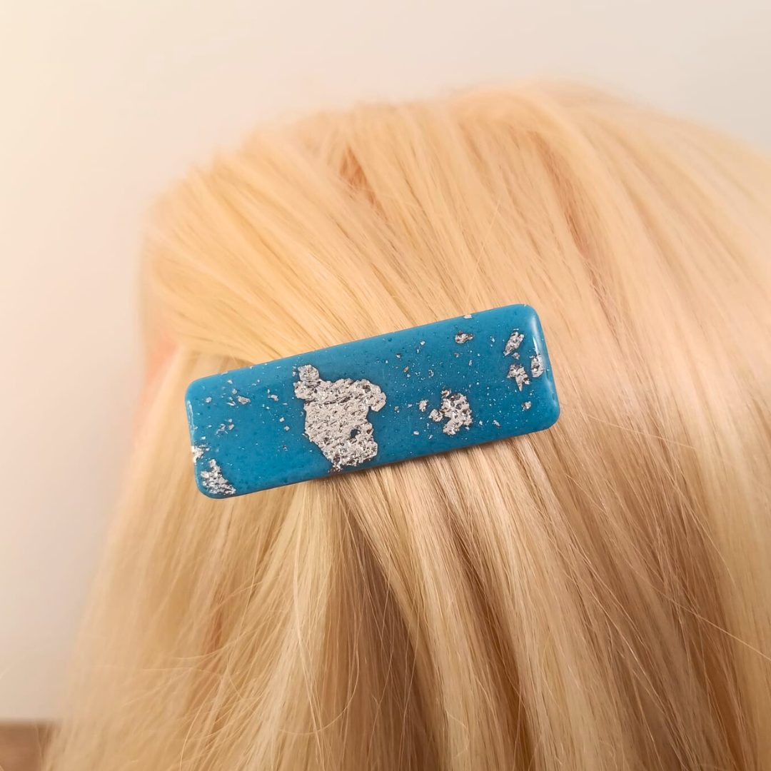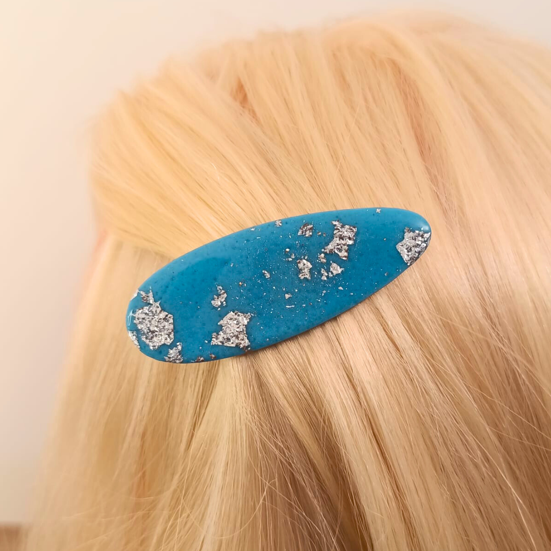 Barrette artisanale en pâte polymère bleue et argentée : Éclat et style pour vos coiffures