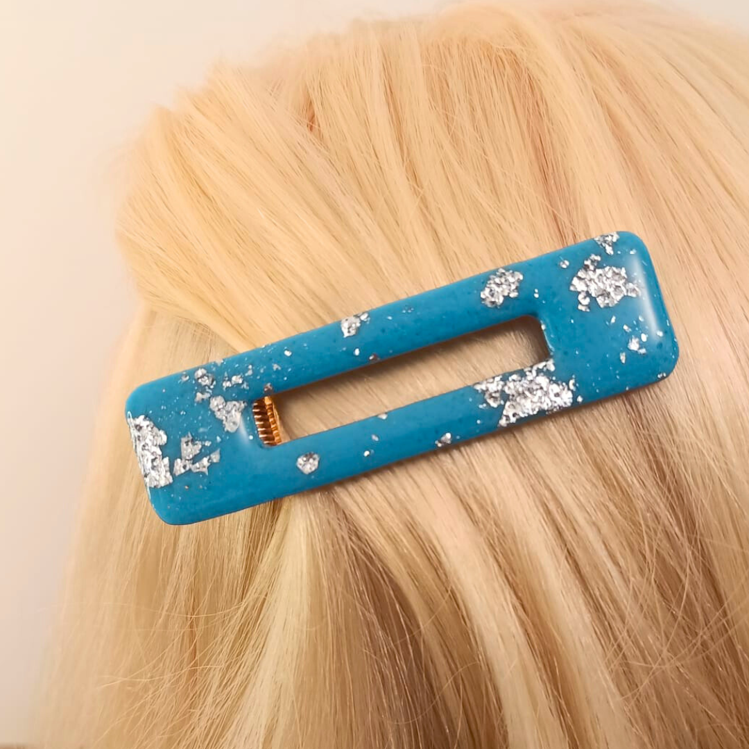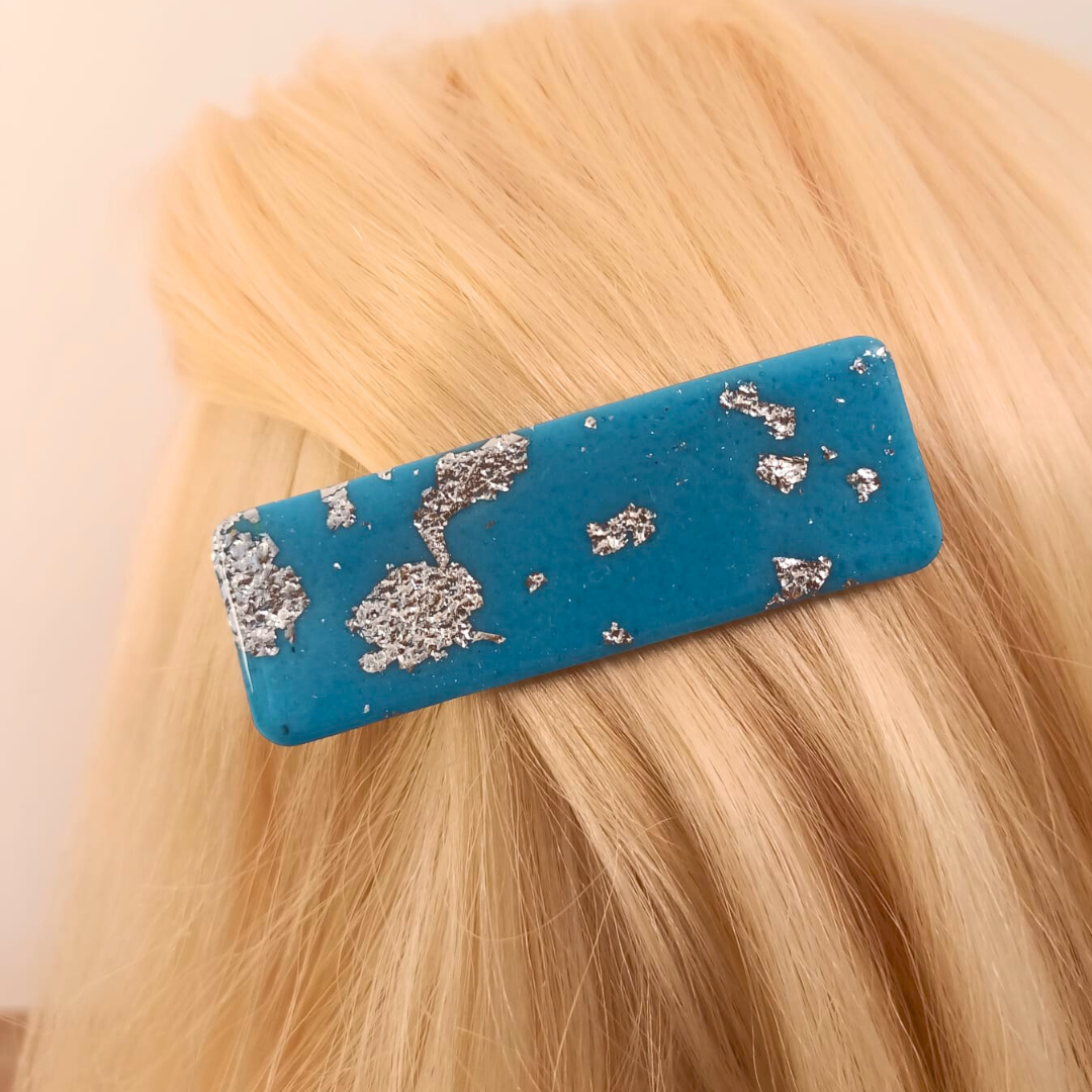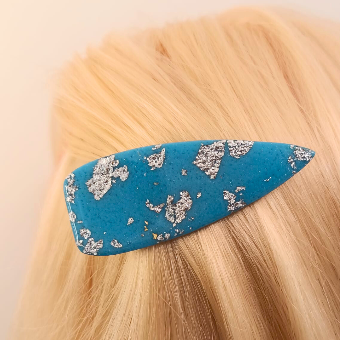 Barrette artisanale en pâte polymère bleue et argentée : Éclat et style pour vos coiffures