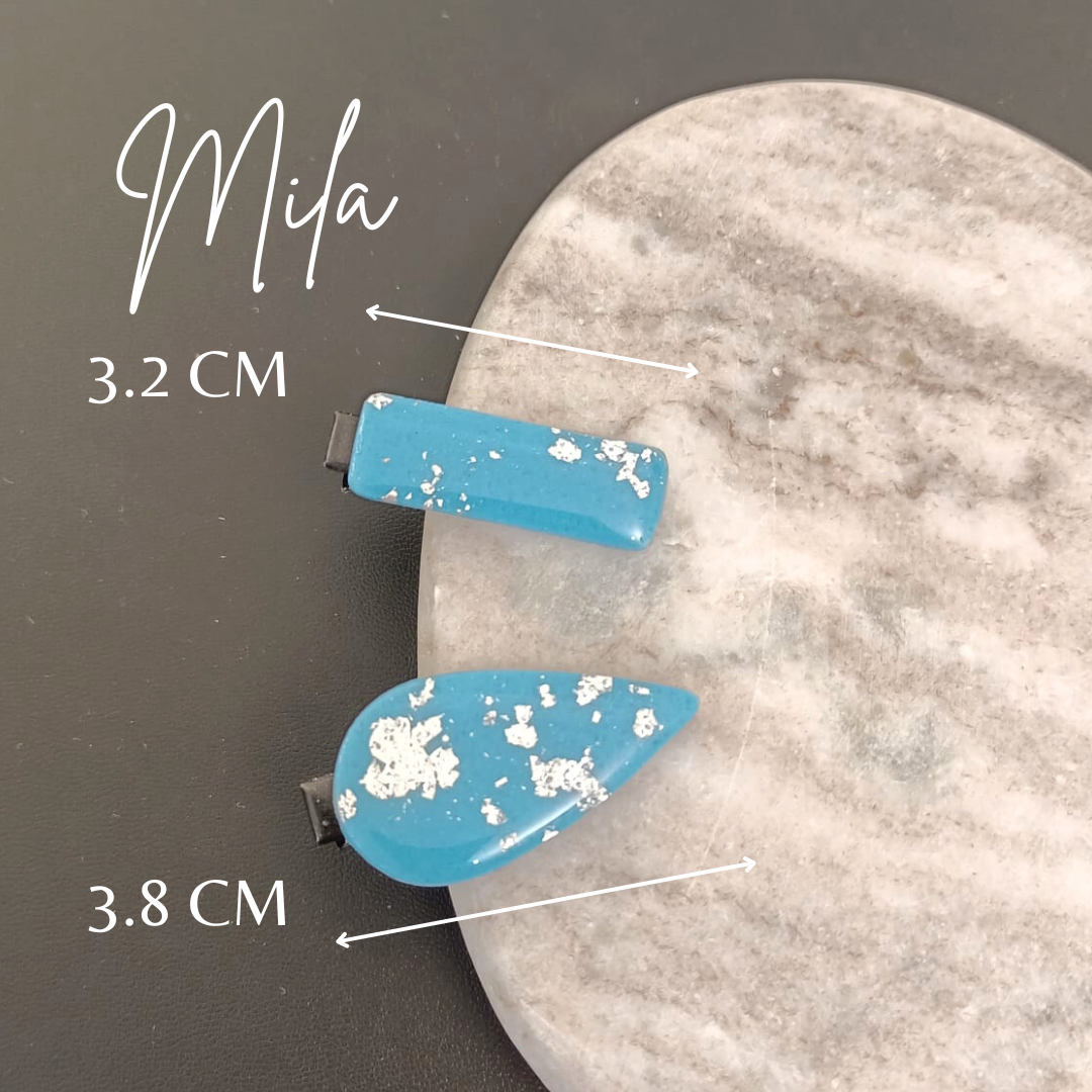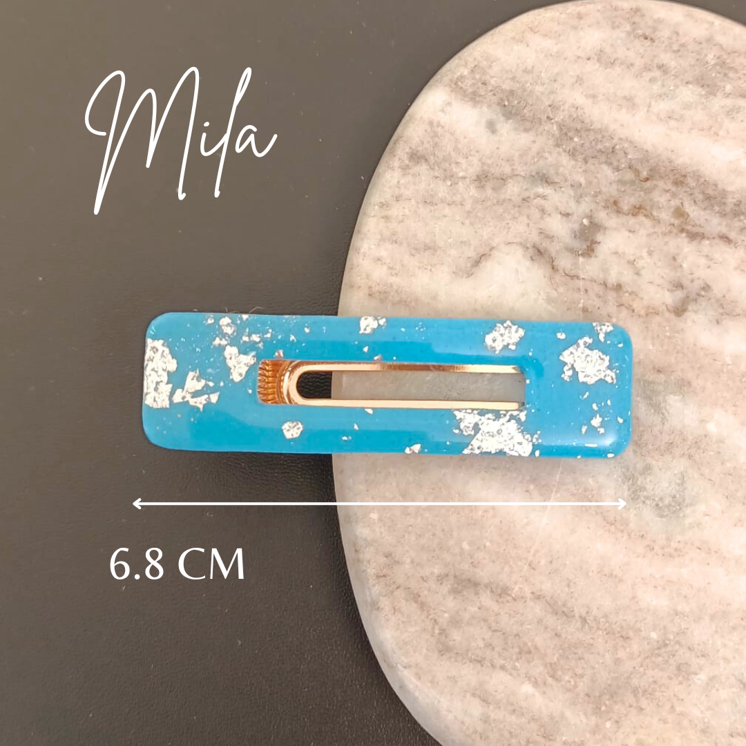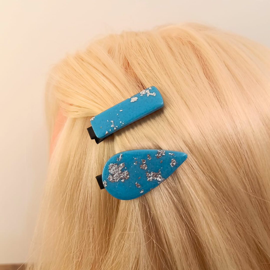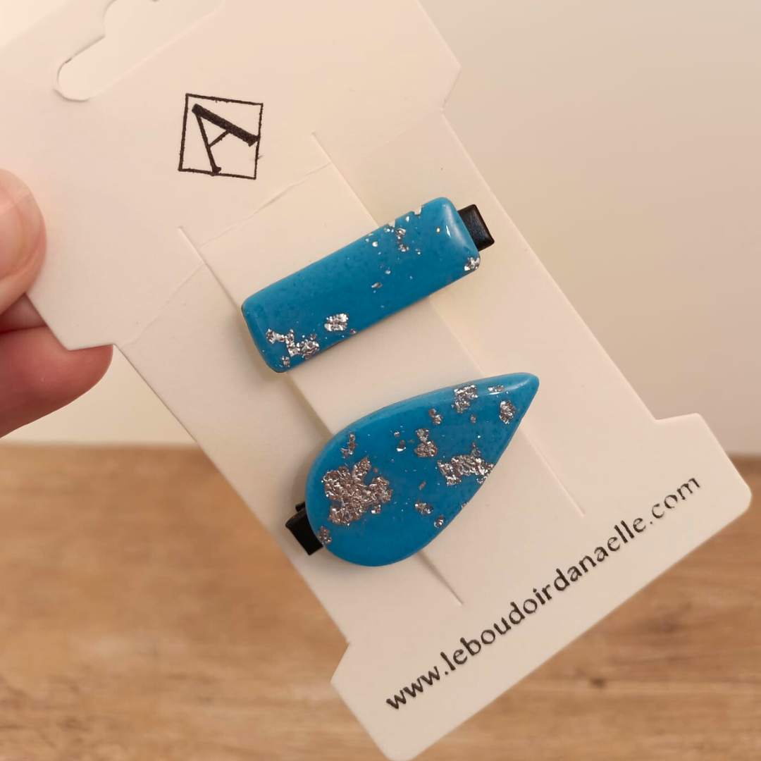 Barrette artisanale en pâte polymère bleue et argentée : Éclat et style pour vos coiffures