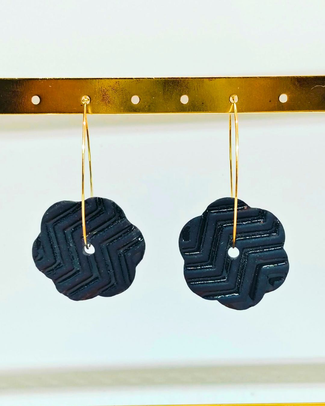 Voici les créoles Marie agrémentées d’un pendentif, en forme de fleur, noir en partie mat et recouvert de résine.
