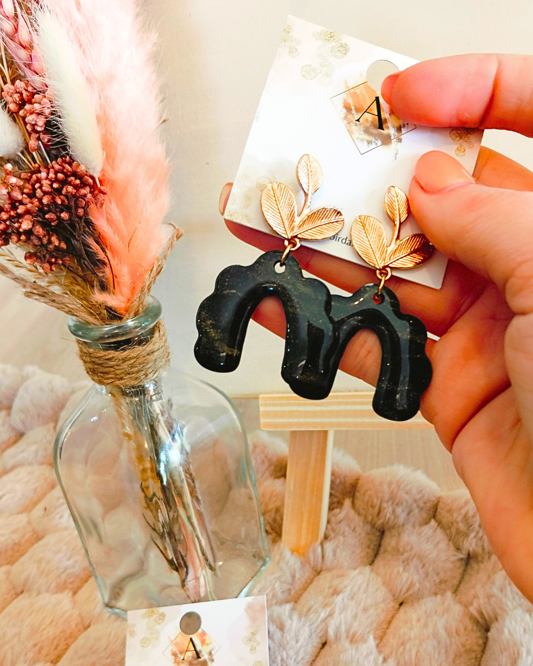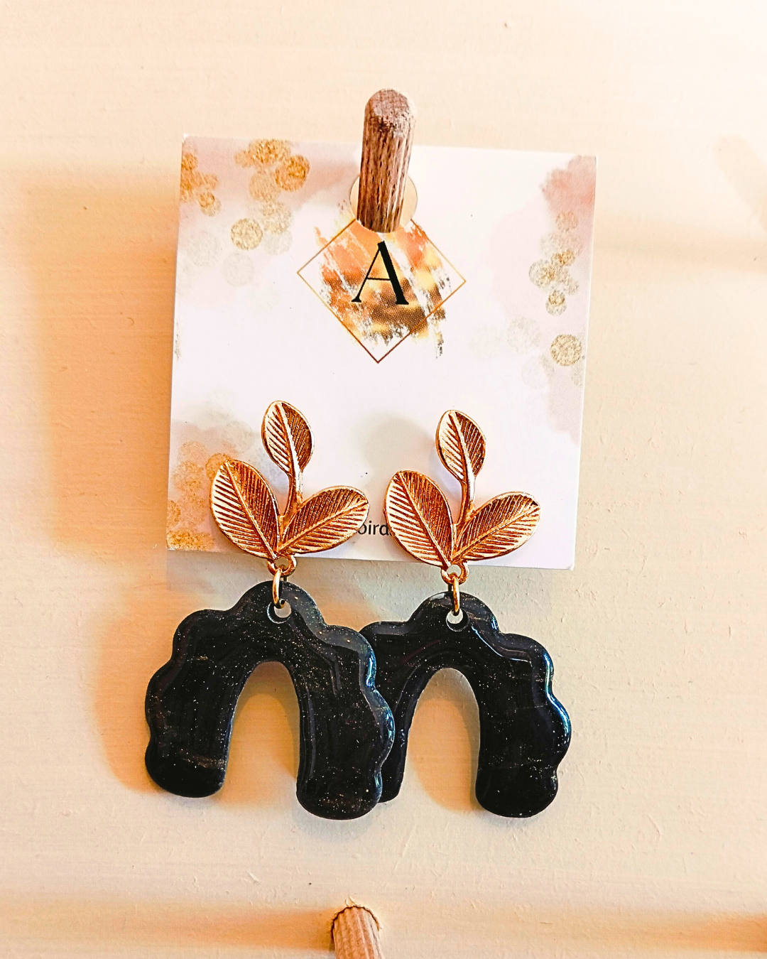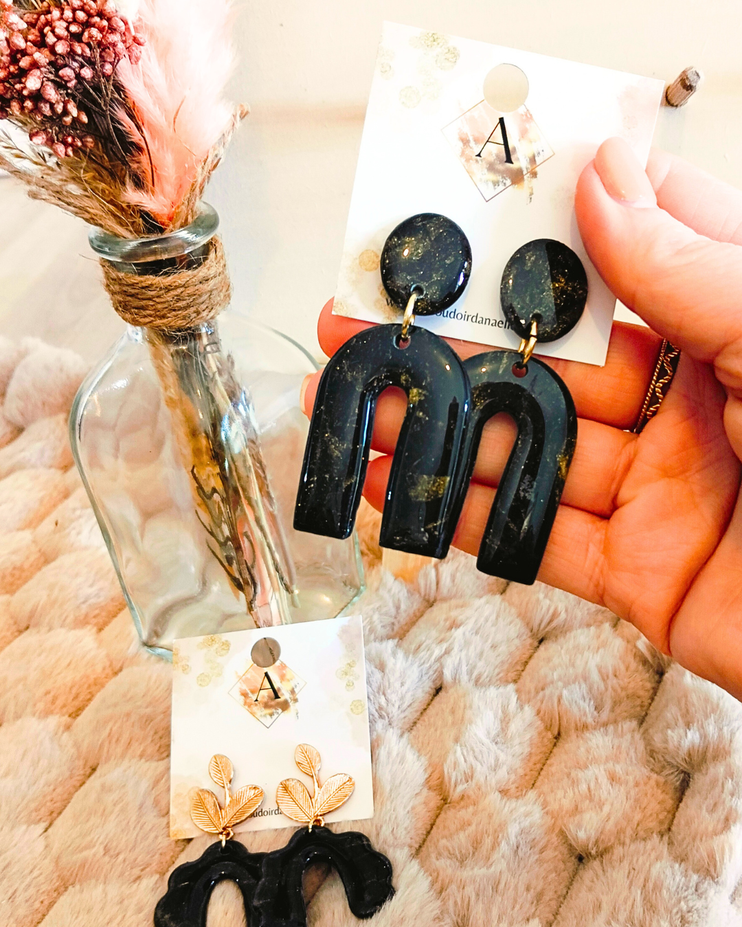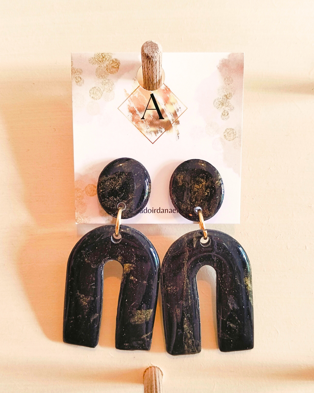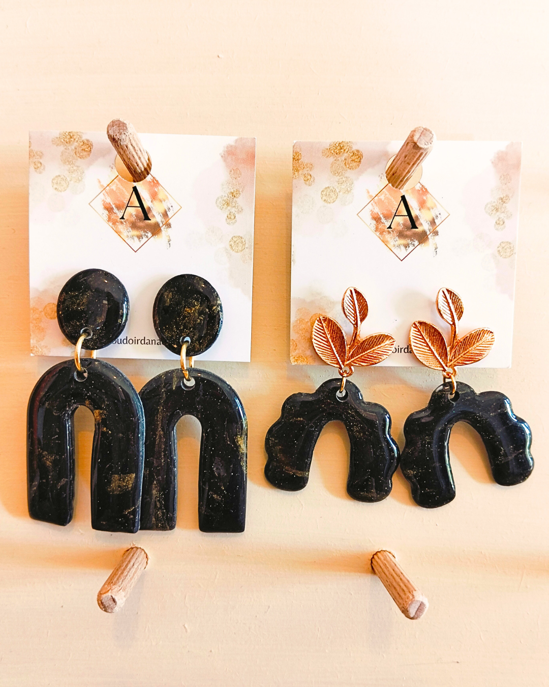 Boucles d’oreilles Valentine : pâte polymère noire et paillettes dorées