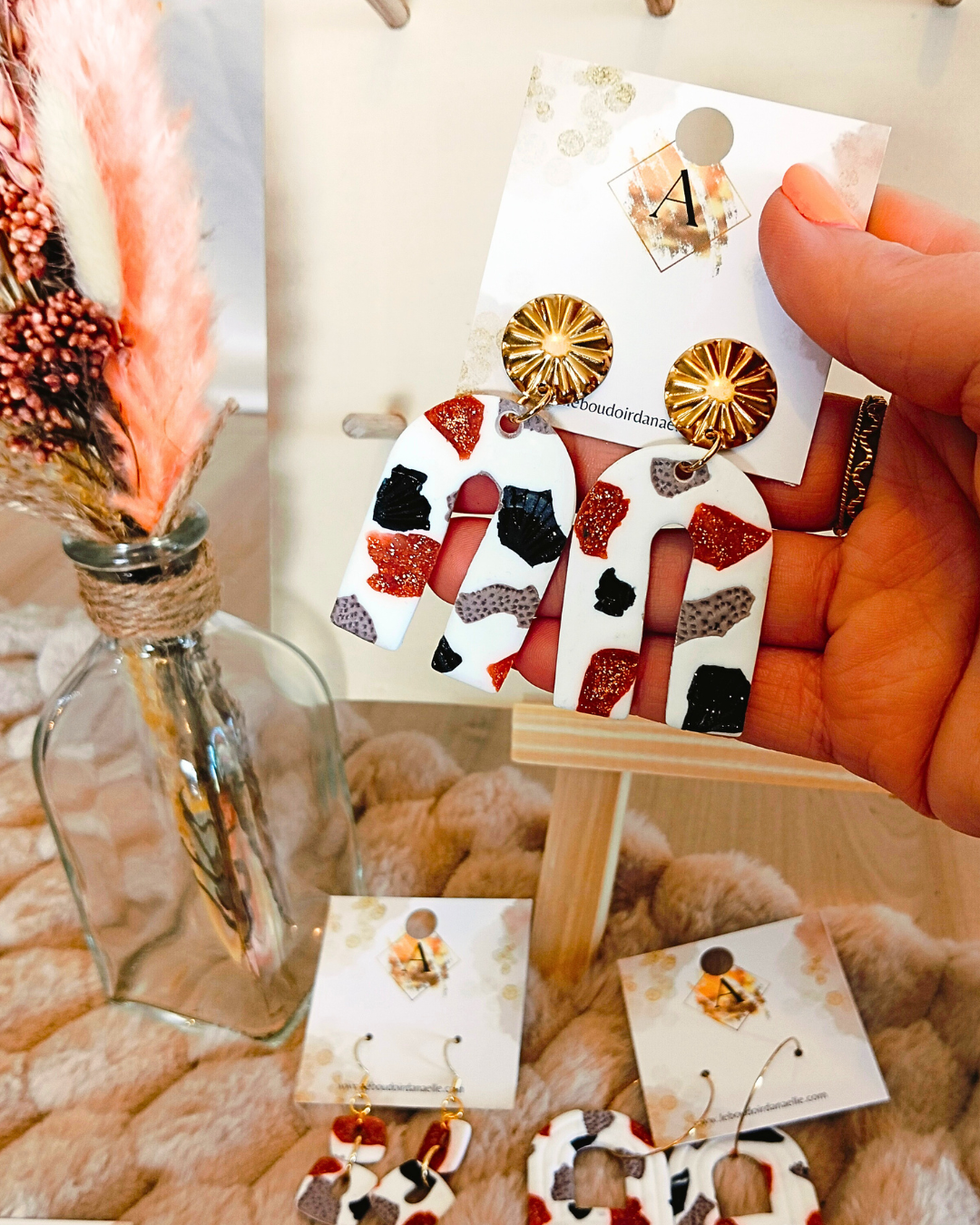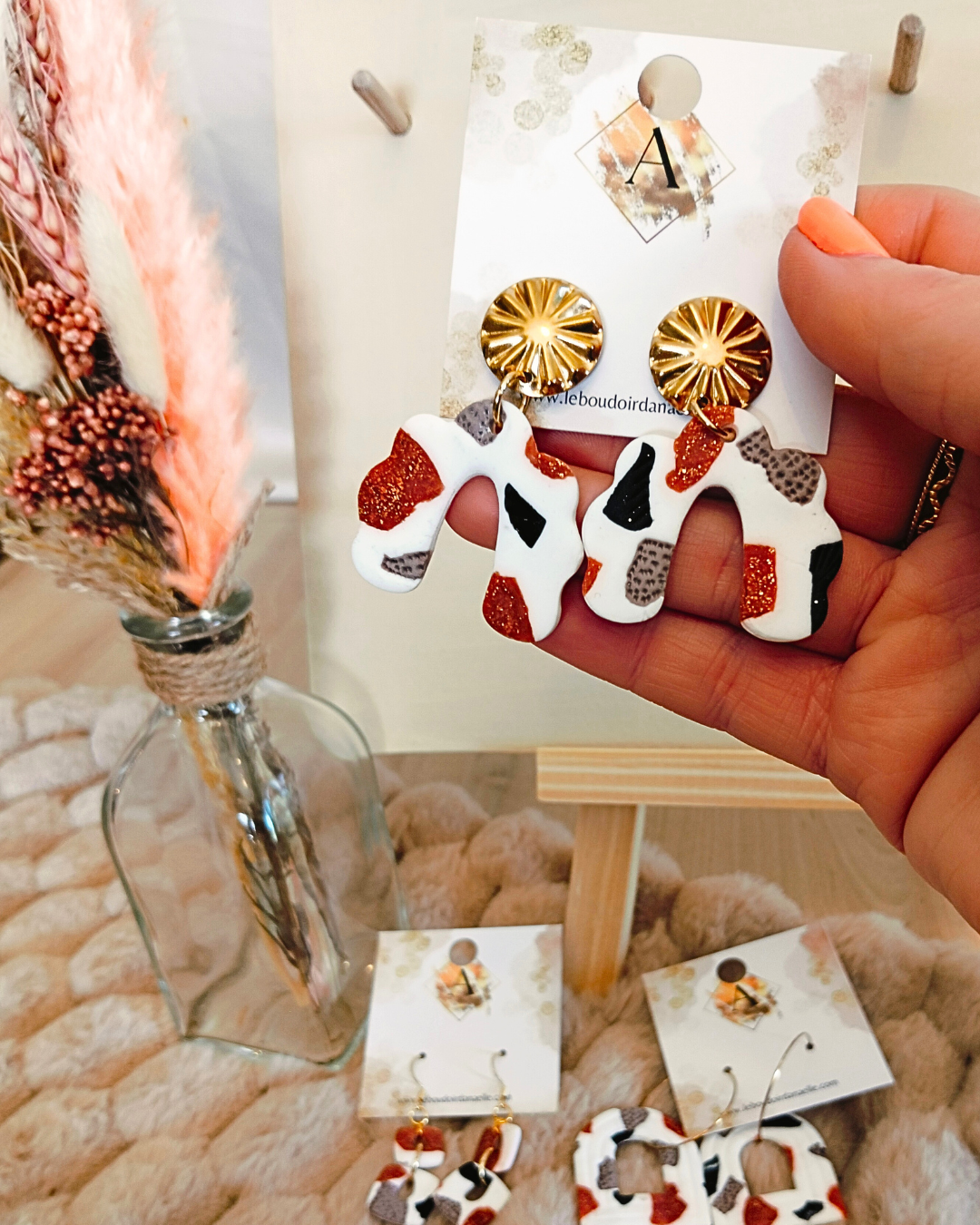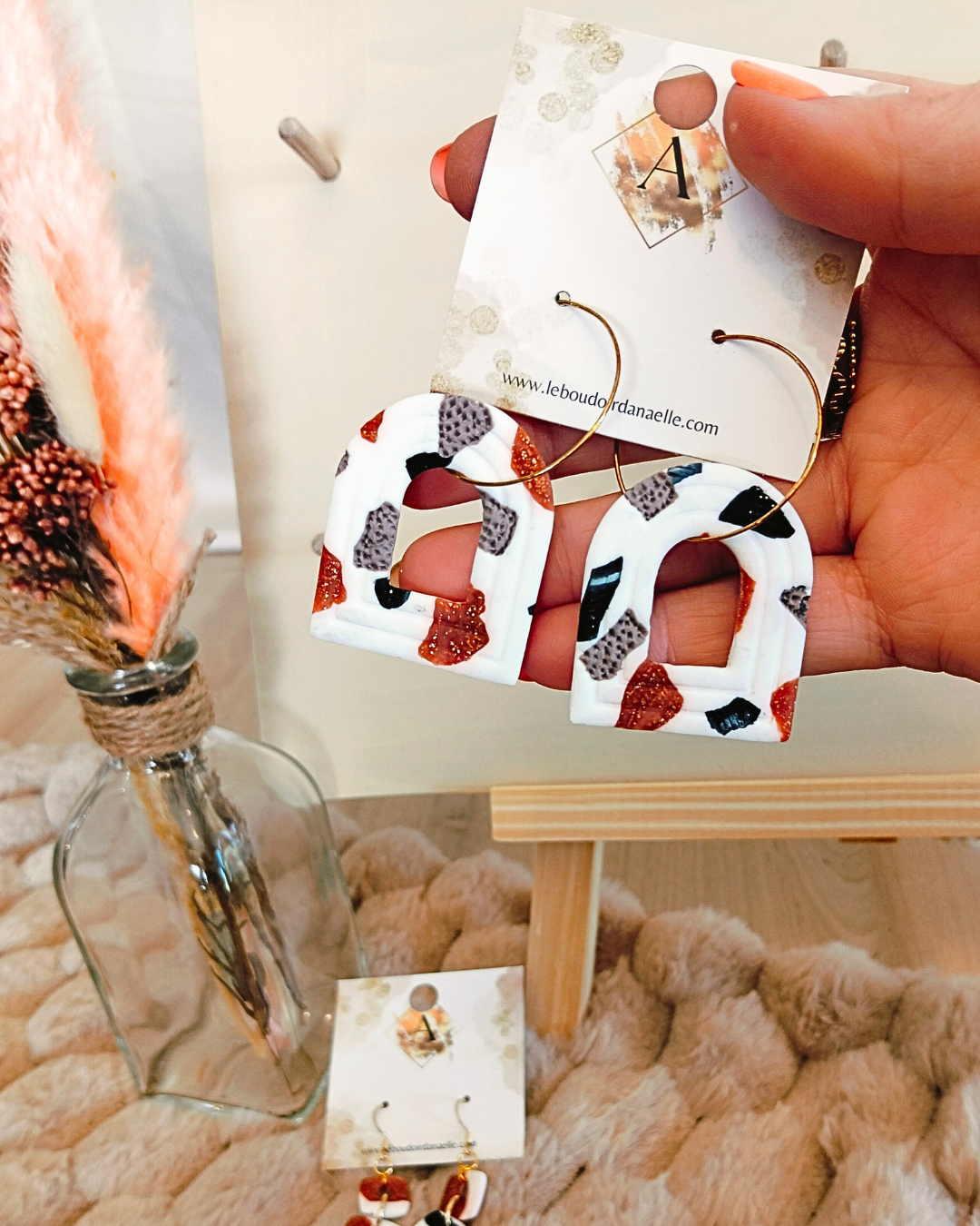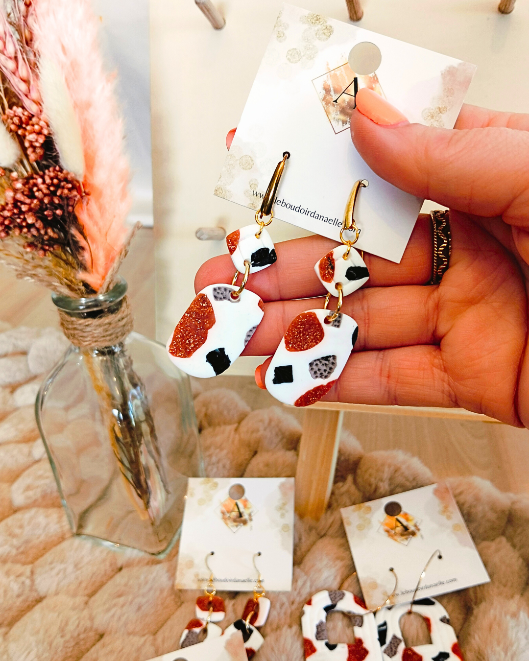 Boucles d’oreilles Ysée : fond blanc, touches de gris, noir et cuivre