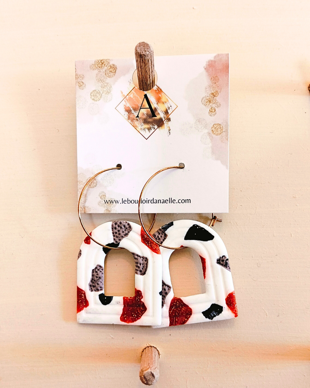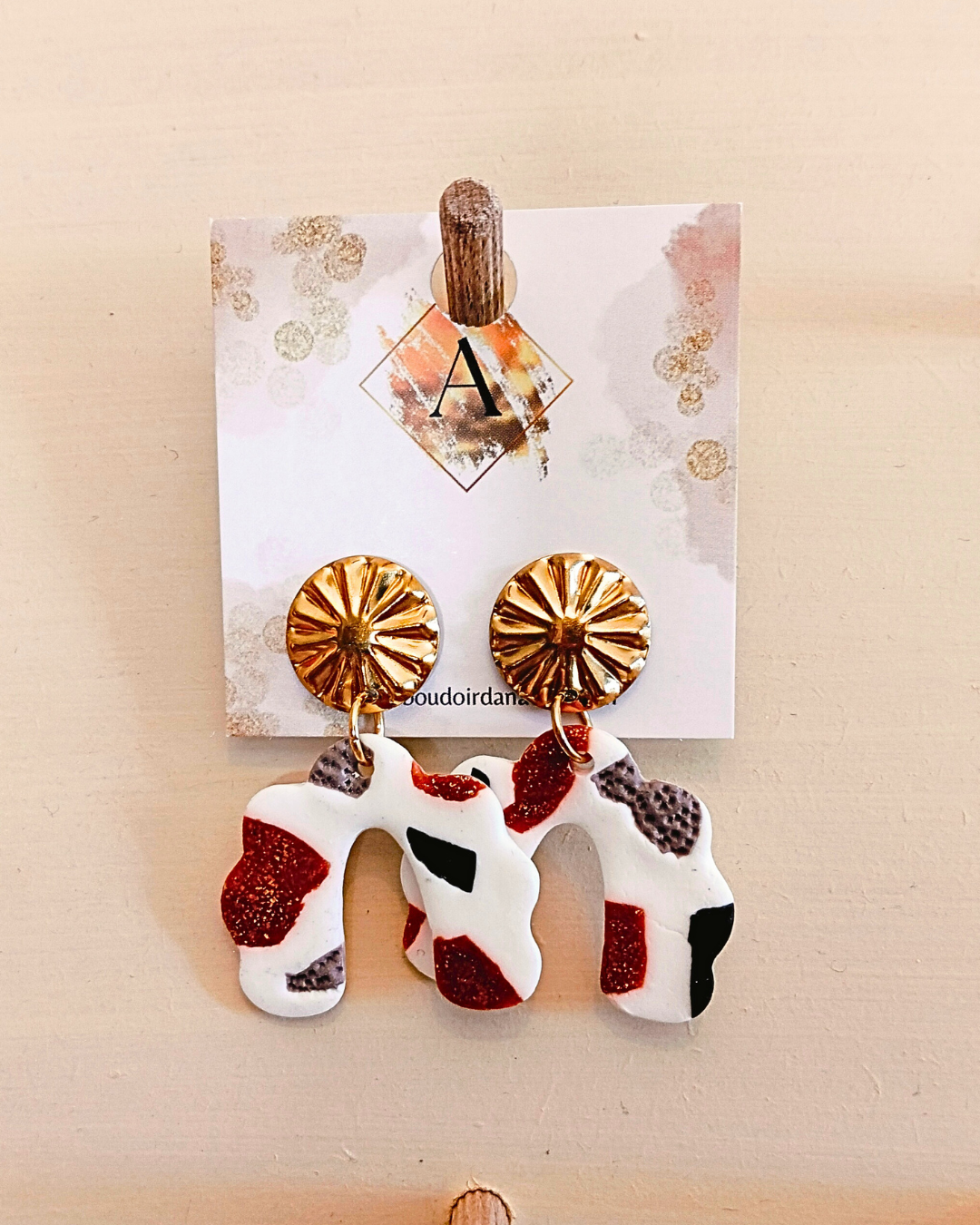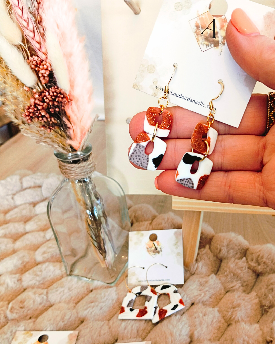 Boucles d’oreilles Ysée : fond blanc, touches de gris, noir et cuivre
