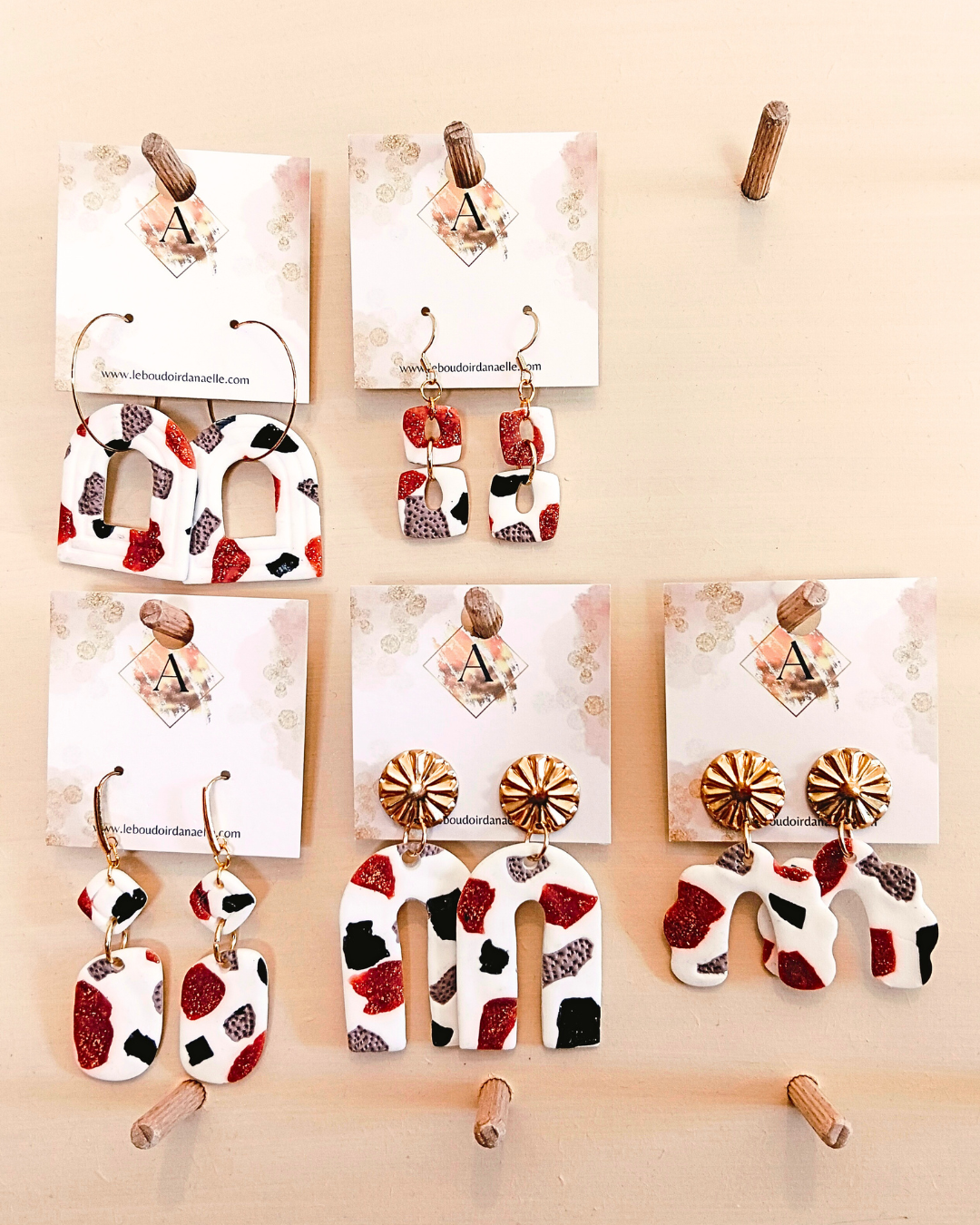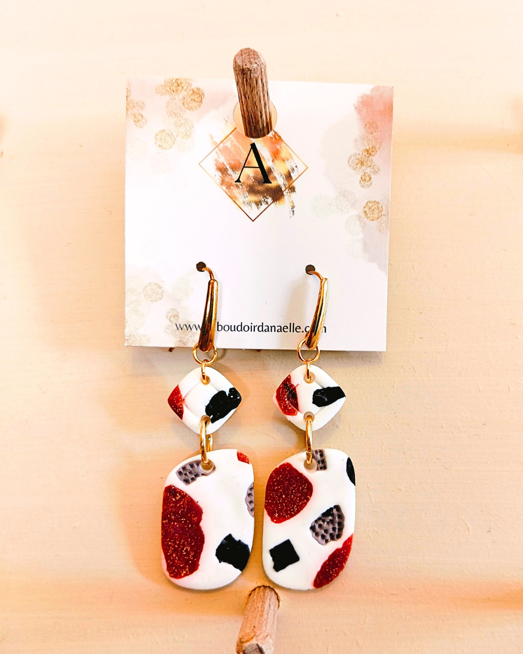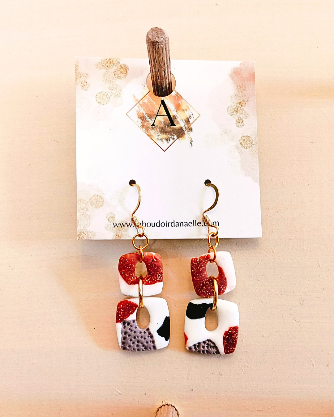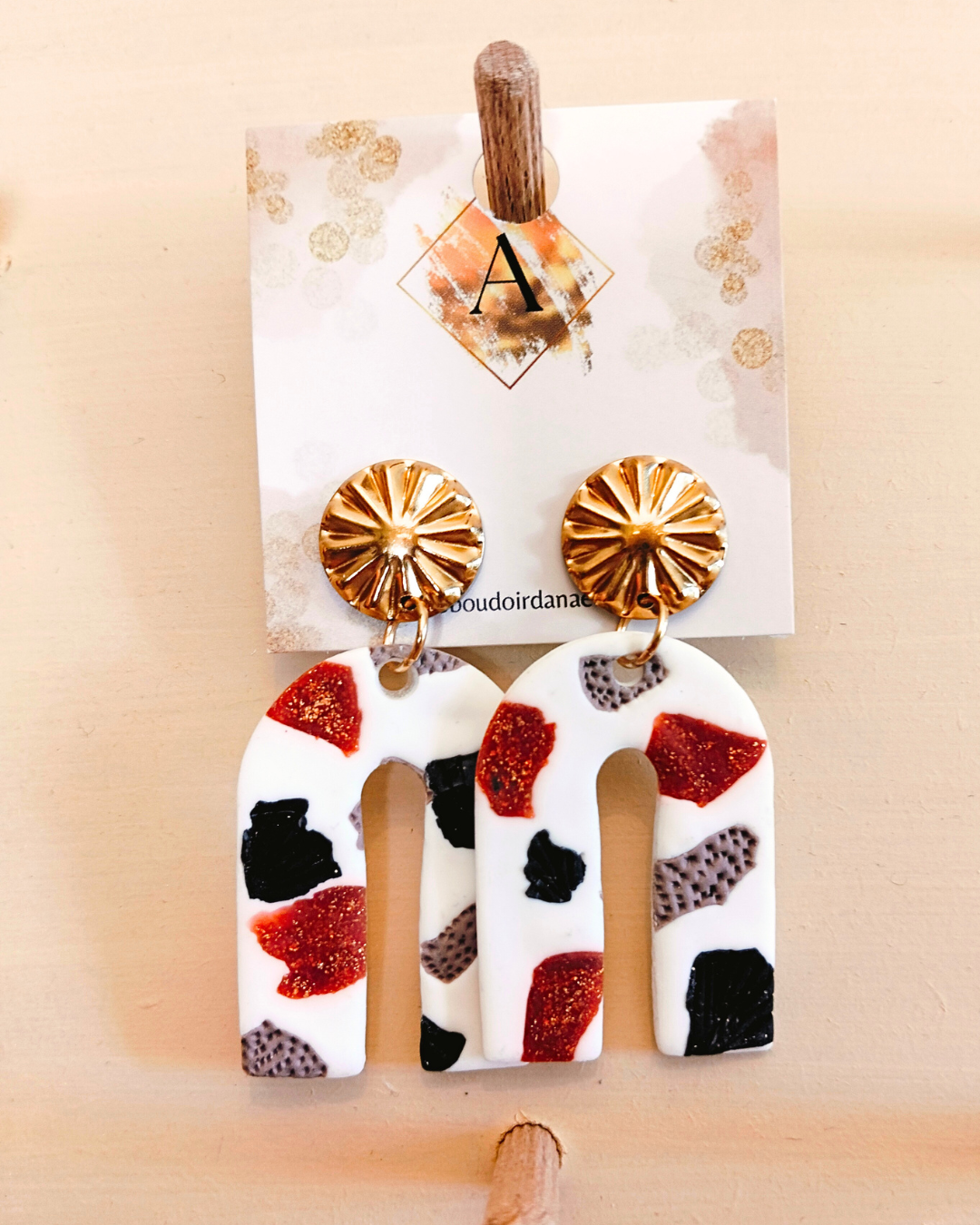 Boucles d’oreilles Ysée : fond blanc, touches de gris, noir et cuivre