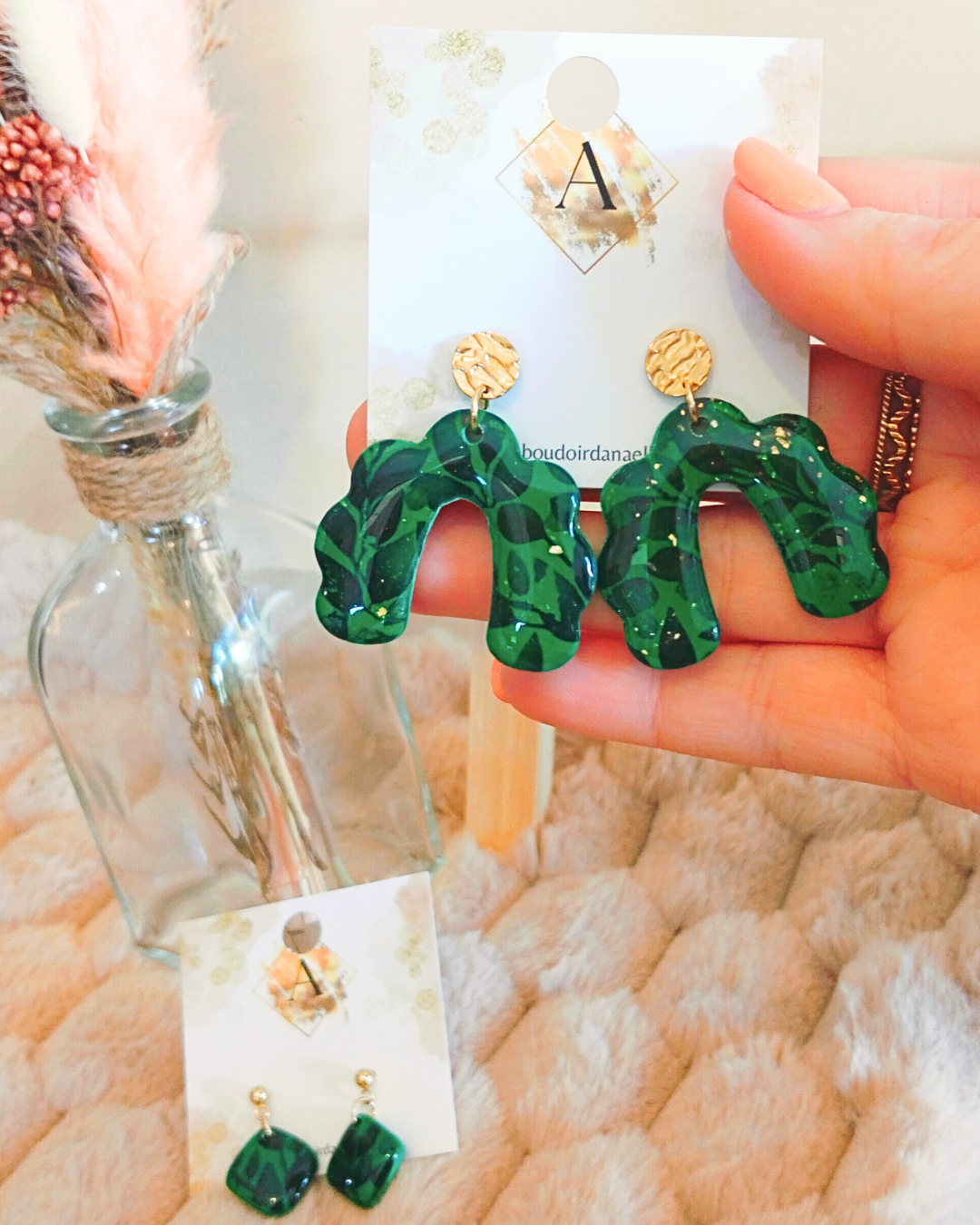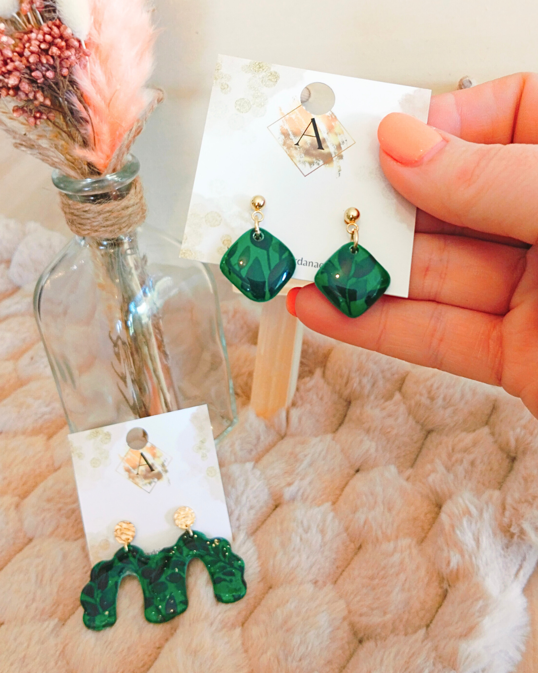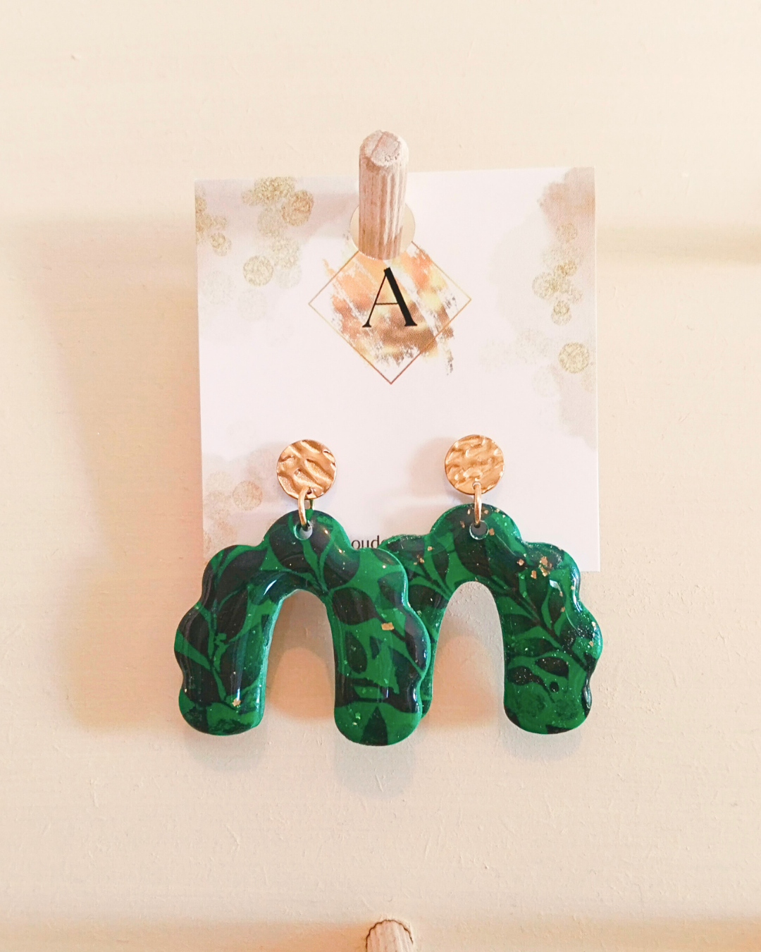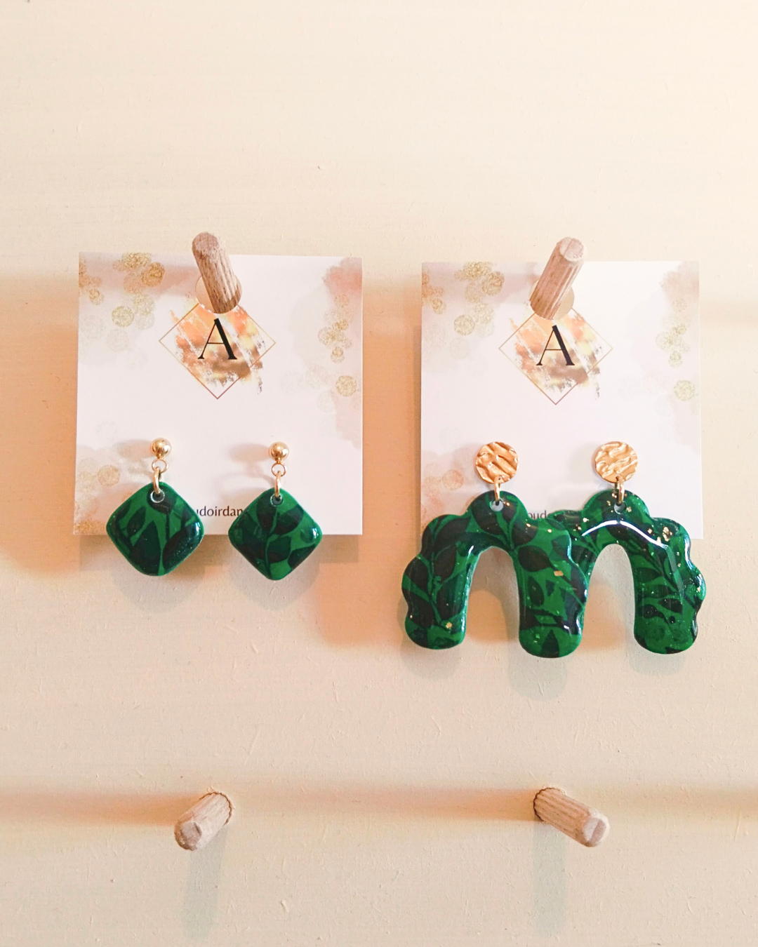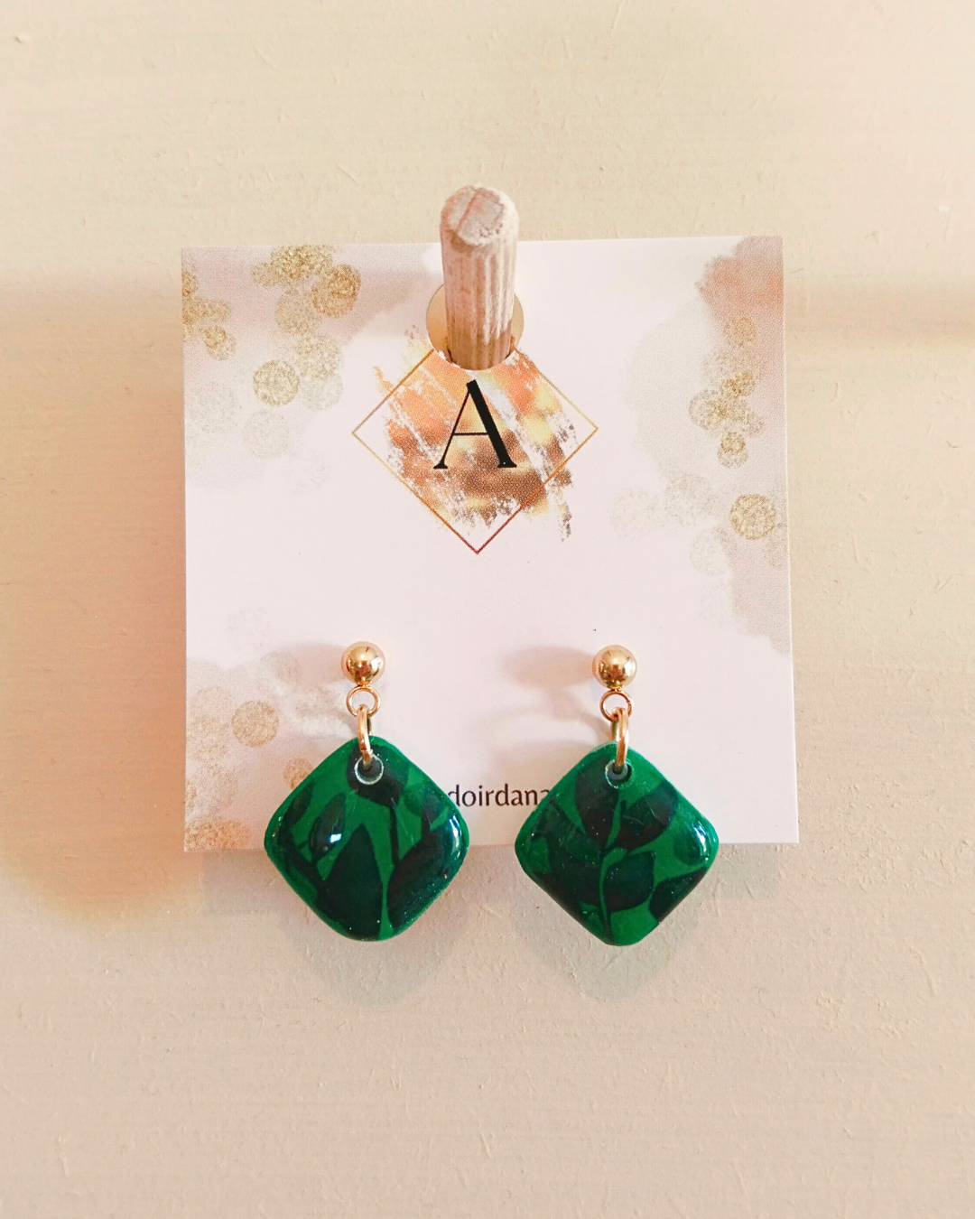 Boucles d’oreilles Yuna : couleur vert, léger éclat d’or et feuilles noires